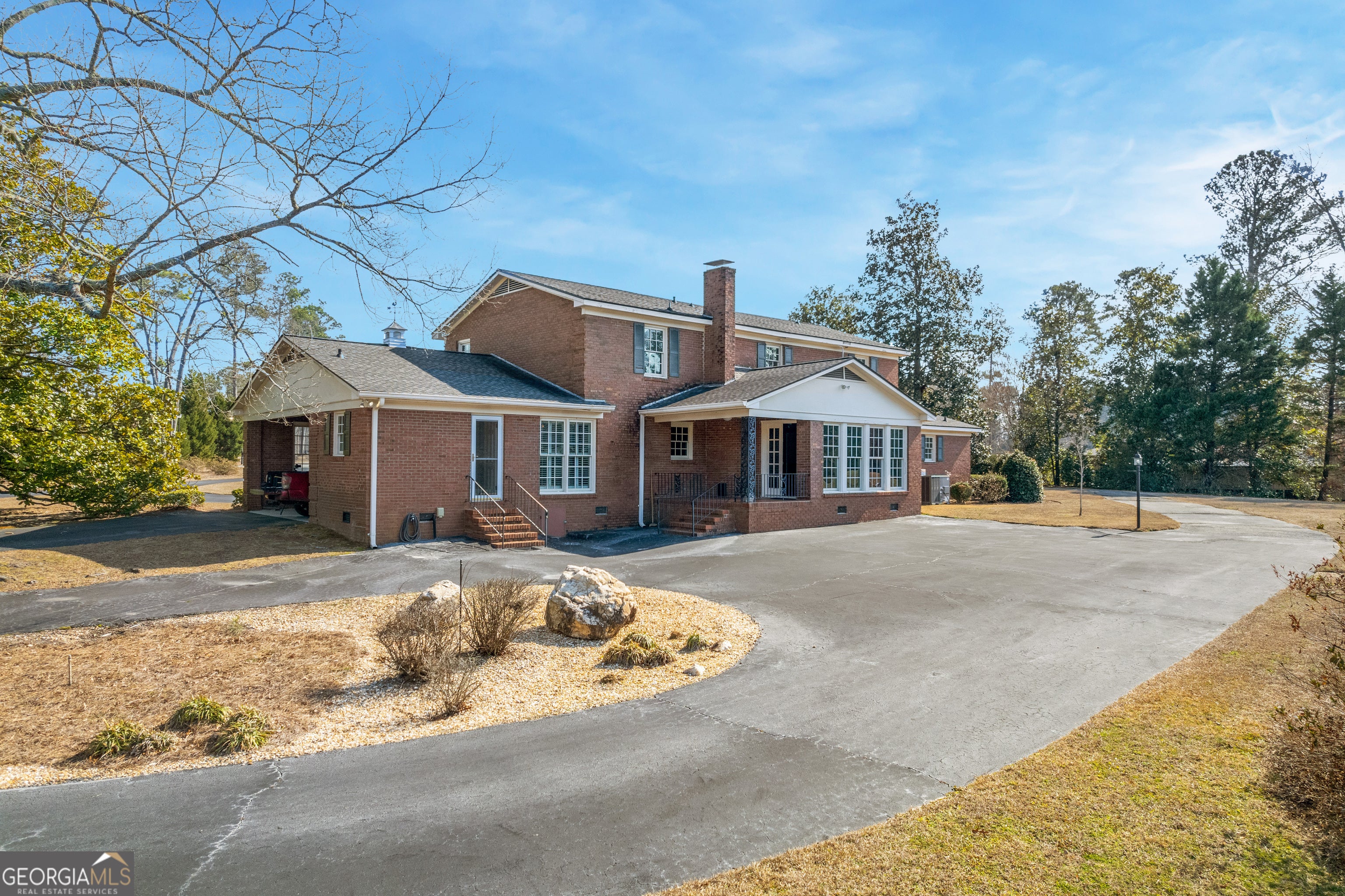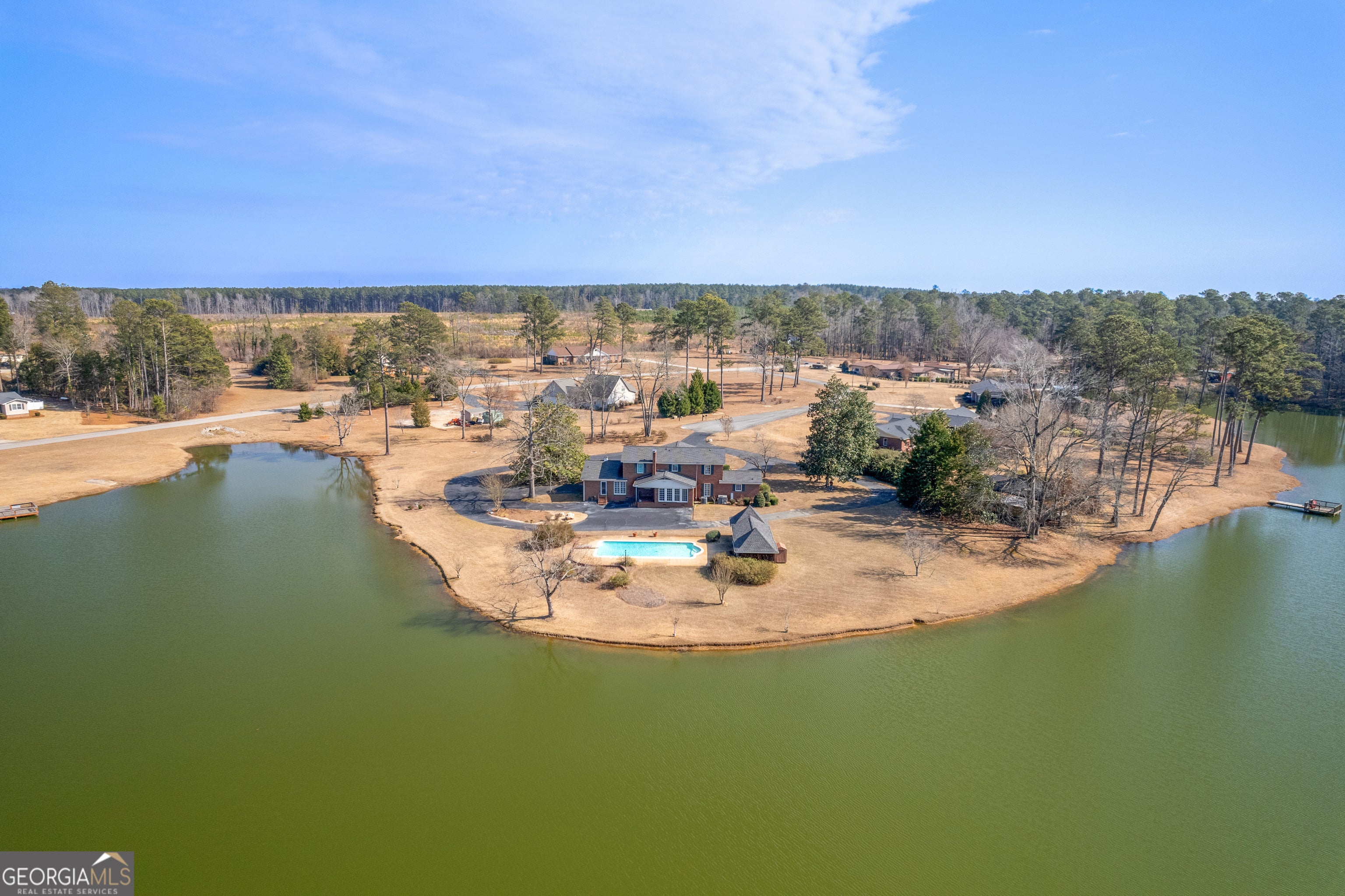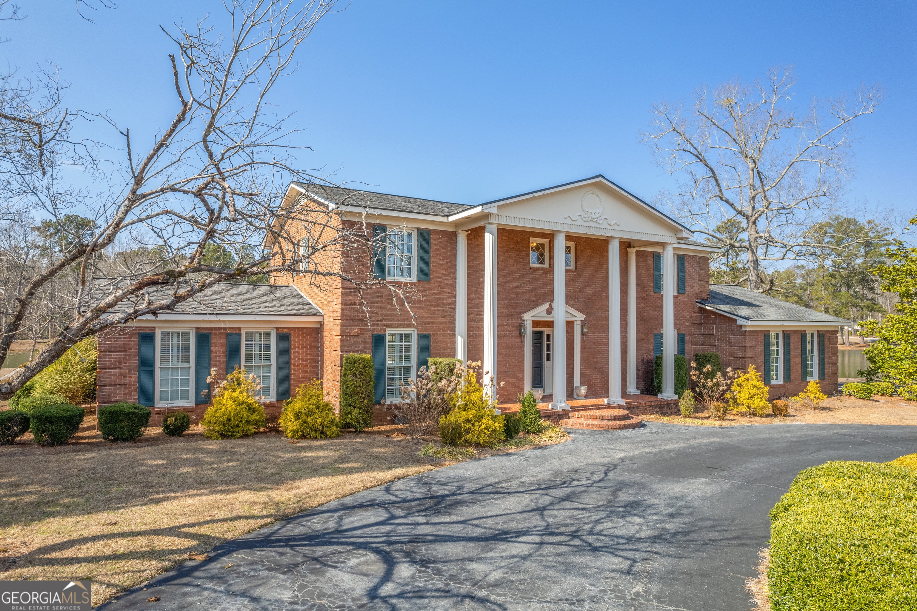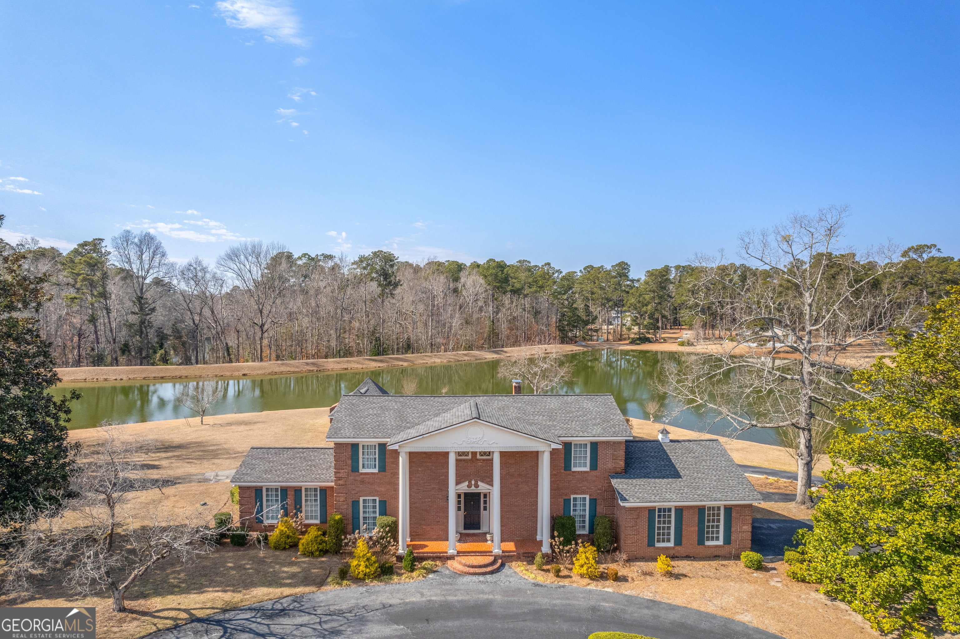 119 The Peninsula offers a rare opportunity for iconic lakefront living in Walden Woods. Situated on the crown jewel lot of one of Sandersville's most desirable neighborhoods, this stately brick home offers timeless architecture, generous space, and nearly 500 feet of frontage on Walden Lake. This 4-bedroom, 4-bath residence features a grand entry foyer with a sweeping winding staircase, setting the tone for the home's classic design. The main level offers both a formal living room and a separate den with fireplace with gas logs and built-in bookcases. An additional staircase off the kitchen adds both charm and functionality. The home retains much of its original character, with thoughtful updates including an updated master bathroom, new laminate flooring throughout the downstairs, and a tankless water heater. The kitchen features the original cooktop and wall oven, along with a ceramic tile floor. Most of the downstairs windows are accented with custom plantation shutters. Outdoors, the property truly shines. The approximately 1-acre lot offers expansive lake frontage and exceptional entertaining space, including a 20x40 gunite swimming pool and a pool house area with shop/storage, roll-up door for equipment or mowers, toilet, and open yet covered spaces ideal for an outdoor kitchen or gatherings. Additional features include a double carport, asphalt circular driveway in front, and a large parking pad at the rear of the property. This is a truly rare opportunity to own a landmark home on the lake in Walden Woods-where location, space, and potential come together.