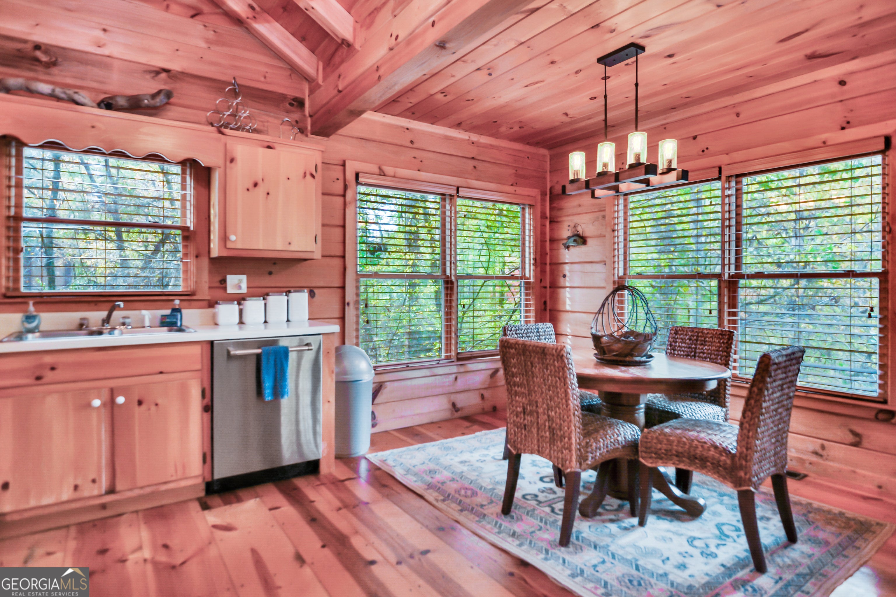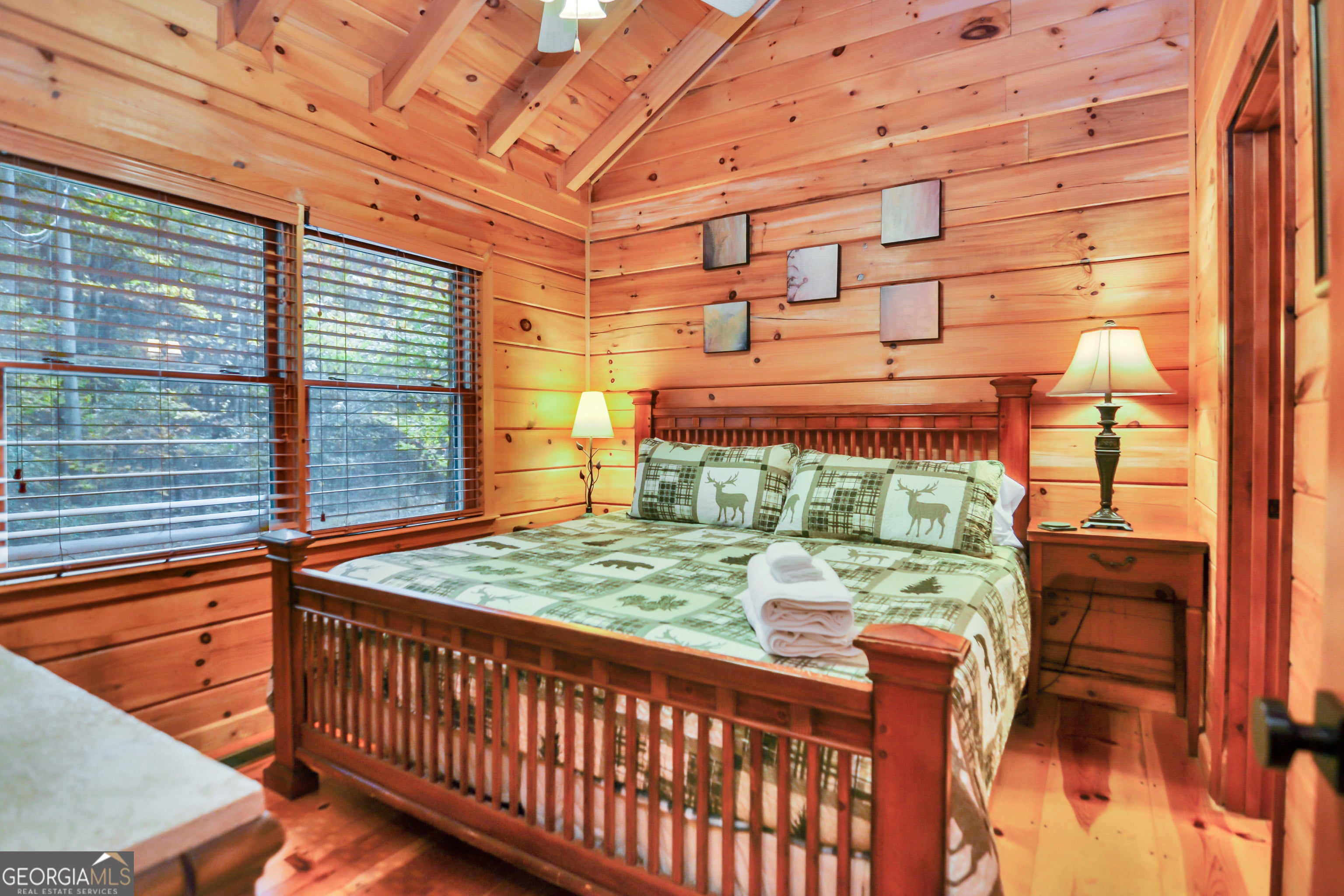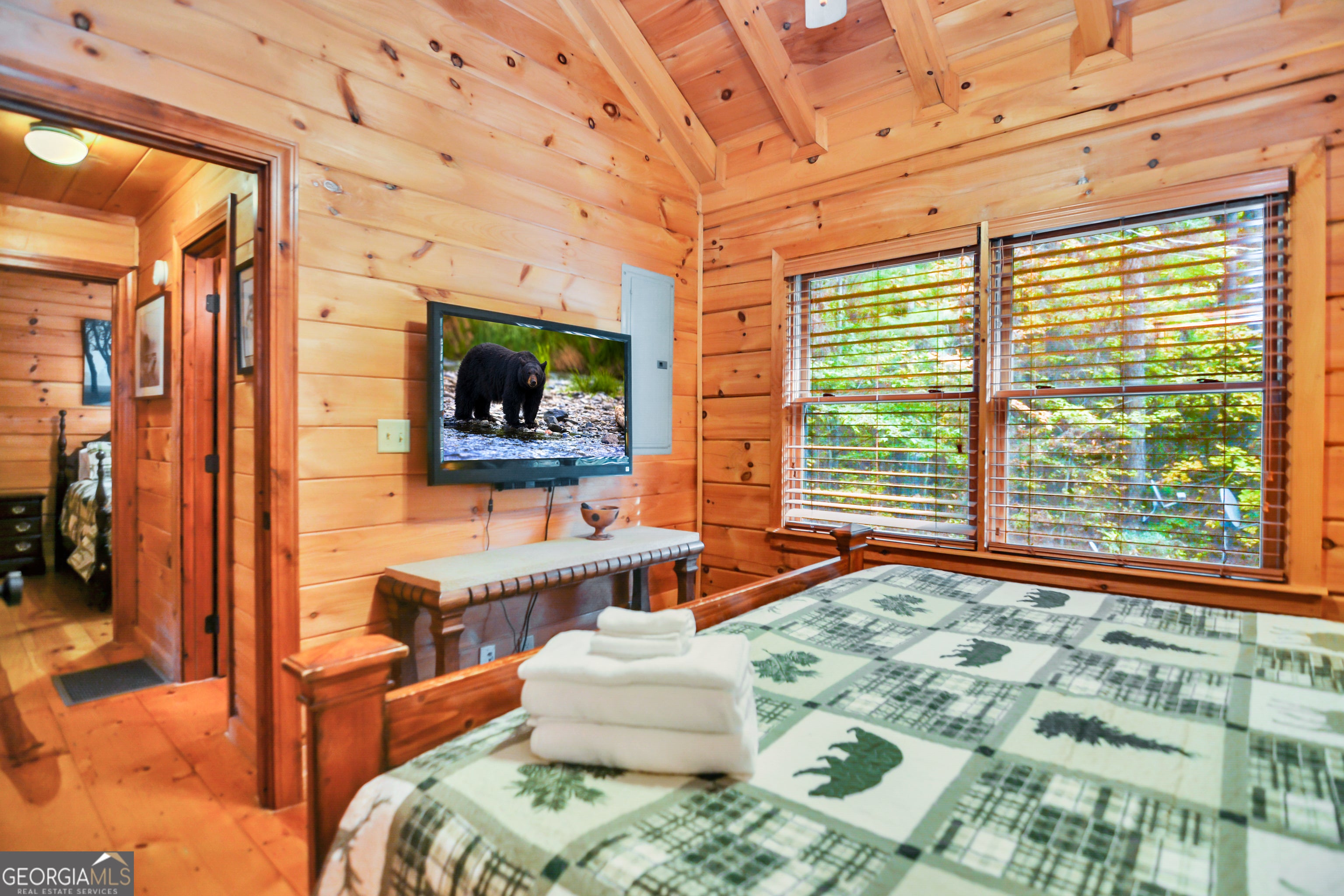 Welcome to Crystal Lake Lodge! A Cozy Lakefront Log Cabin only minutes from Historic Downtown Ellijay & Blue Ridge With a Brand New Hot Tub on an Elevated Deck overlooking the lake! Incredible location is perfect for hiking, fishing, visiting waterfalls & more. Perfect romantic getaway or family retreat. Enjoy this serene and fully furnished 2 Bed + Loft and 2 Bath Real Log Cabin nestled in the North Georgia Mountains! Sip your favorite drink on the Covered porch swing overlooking the lake & watch the Wildlife! Unwind on the huge balcony overlooking lush green foliage and a 6.25 acre (+/-) secluded lake. The wood-burning fireplace is a wonderful focal point in the great room-complete with 10.5' ceiling. Pine flooring, walls & ceilings lend warmth throughout. Set on approx 3 acres with 240' (+/-) of creek and lake frontage, this convenient get-away is only 90 minutes from Atlanta. ~ Fast 100 Mbps WiFi