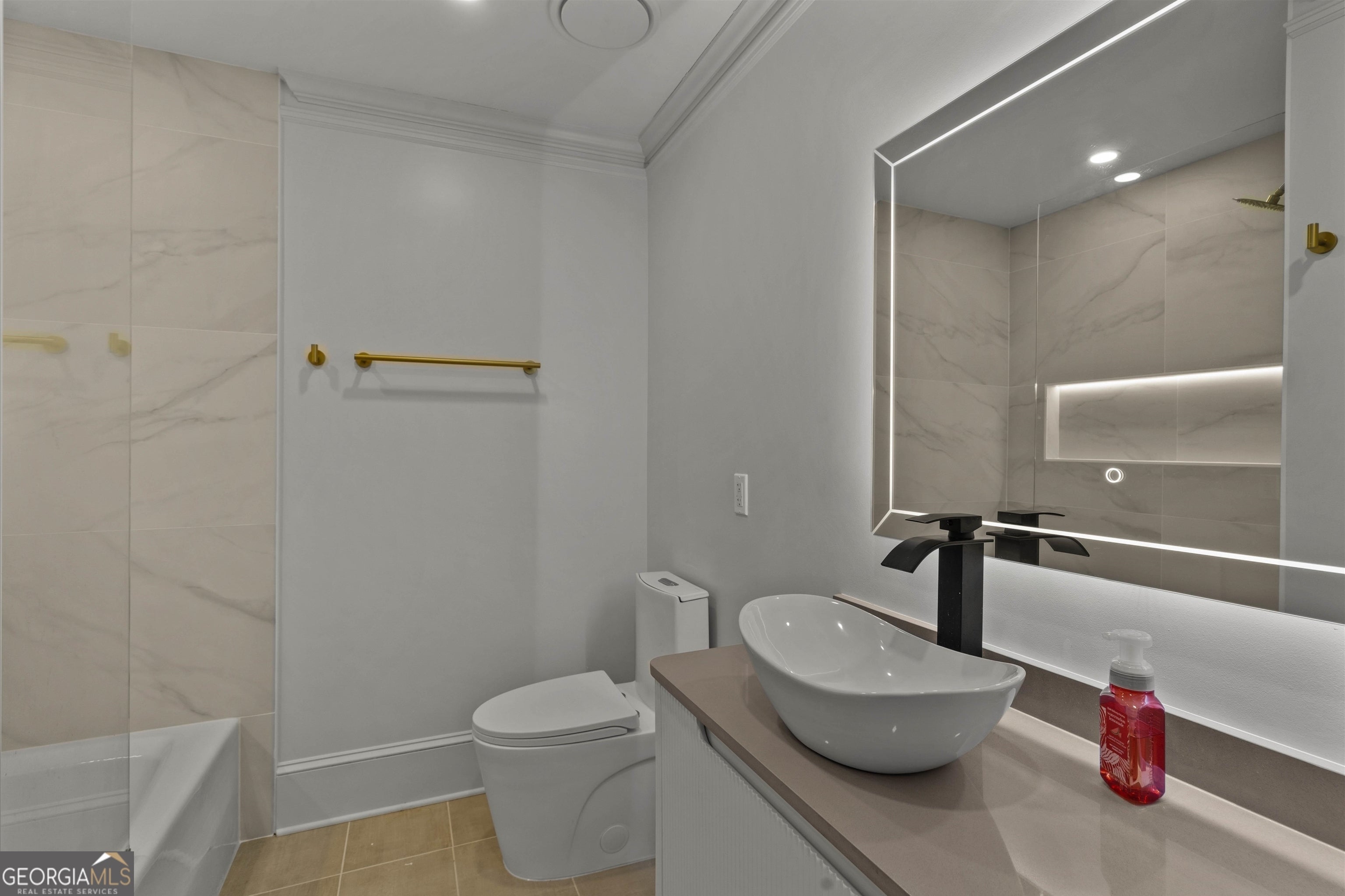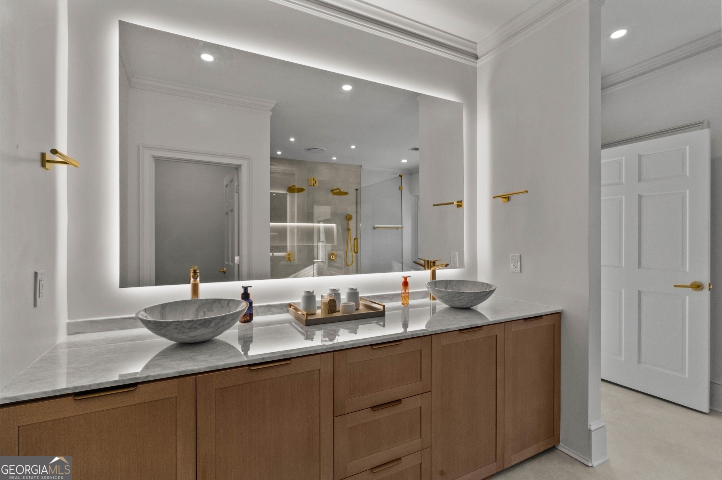 Set within the established Prestwick community and directly across from the Atlanta Athletic Club, this fully renovated estate offers a rare combination of privacy, scale, and refined design on a 1.2-acre lot. A long, private driveway leads to the home, creating a quiet, estatestyle approach and setting the property well back from the street. The exterior presents a timeless, European-inspired look that immediately sets the tone. Inside, the home has been completely reimagined with wide-plank flooring, custom millwork, arched openings, and layered lighting throughout. Custom recessed ceiling details and designer fixtures elevate every room, while abundant natural light highlights the home's generous proportions and thoughtful flow. The main level is designed to support both everyday living and effortless entertaining. The great room features soaring ceilings and a striking fireplace, opening seamlessly to the kitchen and dining areas. The kitchen is a true gathering space, anchored by an oversized island, custom cabinetry, premium appliances, and a well-appointed bar area that makes hosting easy and natural. Large windows and doors connect the interior to outdoor patios, creating a smooth transition between indoor and outdoor living. The primary suite on the main level offers a private retreat with a sitting area, direct outdoor access, custom walk-in closets, and a spa-inspired bathroom featuring a soaking tub, oversized glass shower, and carefully selected lighting that delivers a calm, hotel-like feel. A dedicated office, spacious laundry room, and additional bedroom with a private bath complete the main level, offering flexibility for guests or extended stays. Upstairs, two generously sized bedrooms each feature walk-in closets and ensuite bathrooms, providing privacy and comfort while remaining connected to the main living spaces below. The finished terrace level significantly expands the home's functionality and is ideal for multigenerational living or long-term guests. This level includes two additional bedrooms, two full bathrooms, a second full kitchen, and a second laundry room, allowing for true independence without sacrificing connection to the main home. Multiple living areas provide space for a media lounge, gym, or recreation room, while walk-out access leads directly to the backyard. A massive storage area on this level offers exceptional utility and includes its own separate garage entry, ideal for storing vehicles, equipment, or seasonal items with ease. Surrounded by mature trees, the outdoor setting offers a peaceful backdrop that feels removed from the city while remaining close to everything. Located right off Medlock Bridge, the home is minutes from Medlock Crossing with Regal Cinema, Whole Foods, Target, Publix, Home Depot, and Panera. The Forum at Peachtree Corners is also nearby, offering Trader Joe's, Barnes and Noble, Firebirds Wood Fired Grill, J. Alexander's, H&W Steakhouse, Cava, and Sprouts. With seven bedrooms, seven full bathrooms, and a half bath across three finished levels, this extensively renovated estate delivers privacy, flexibility, and a level of finish that is increasingly difficult to find in an established community of this caliber. Welcome Home!