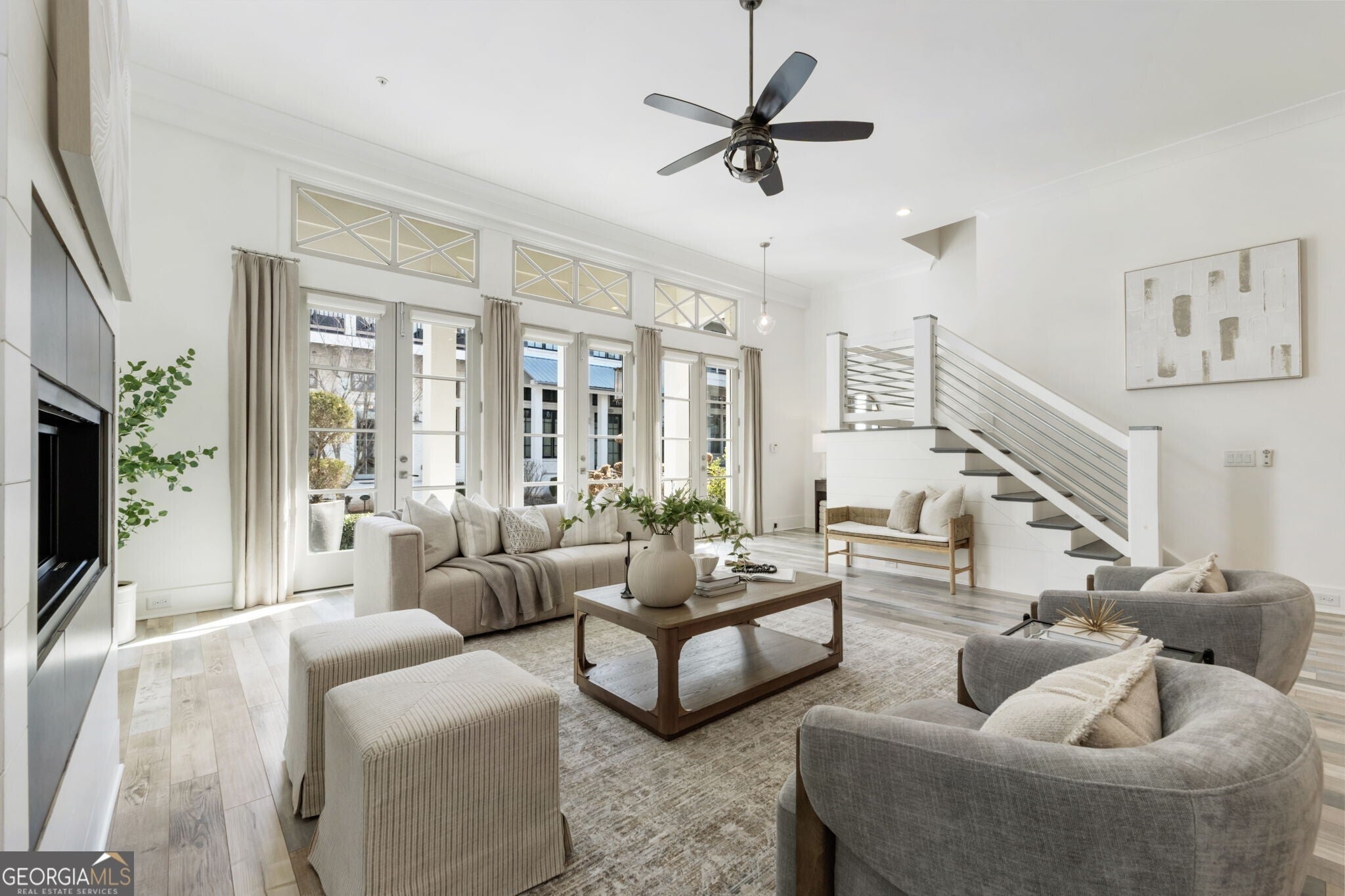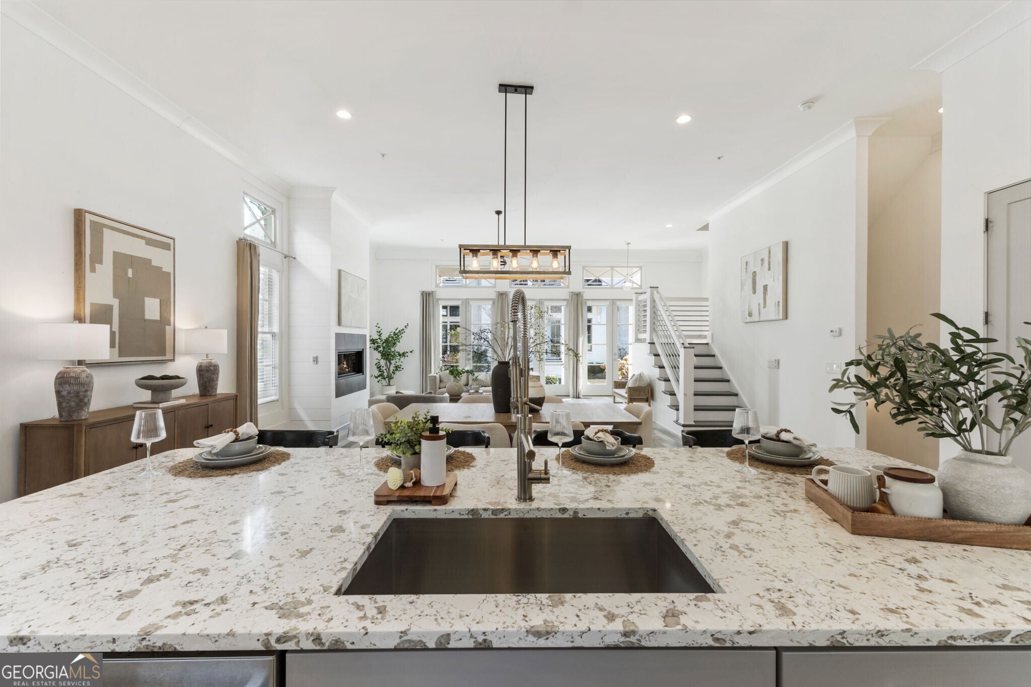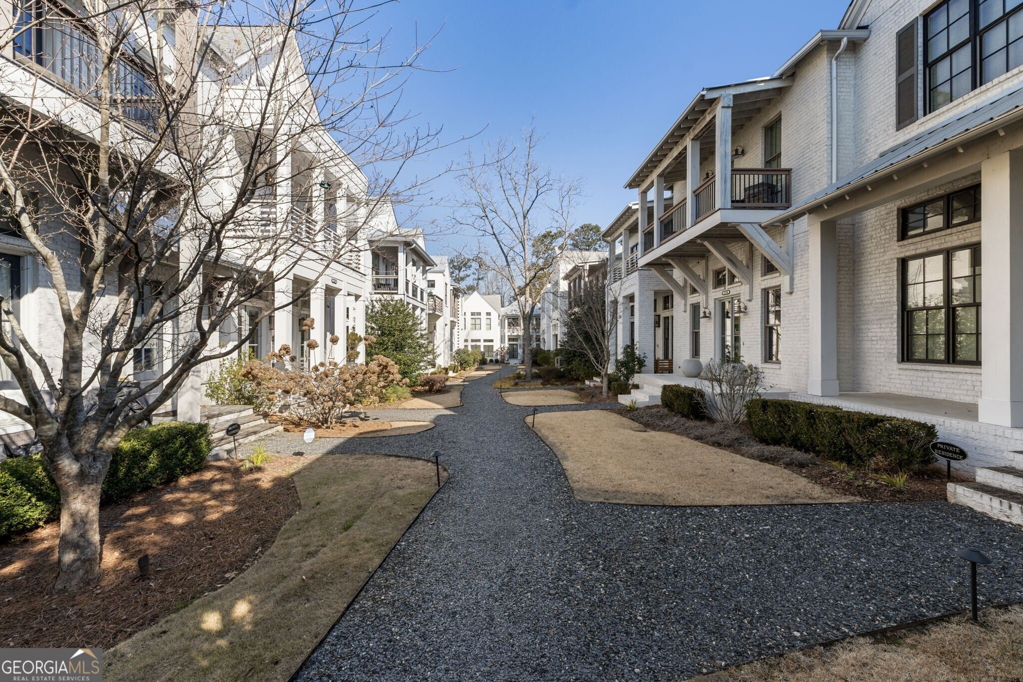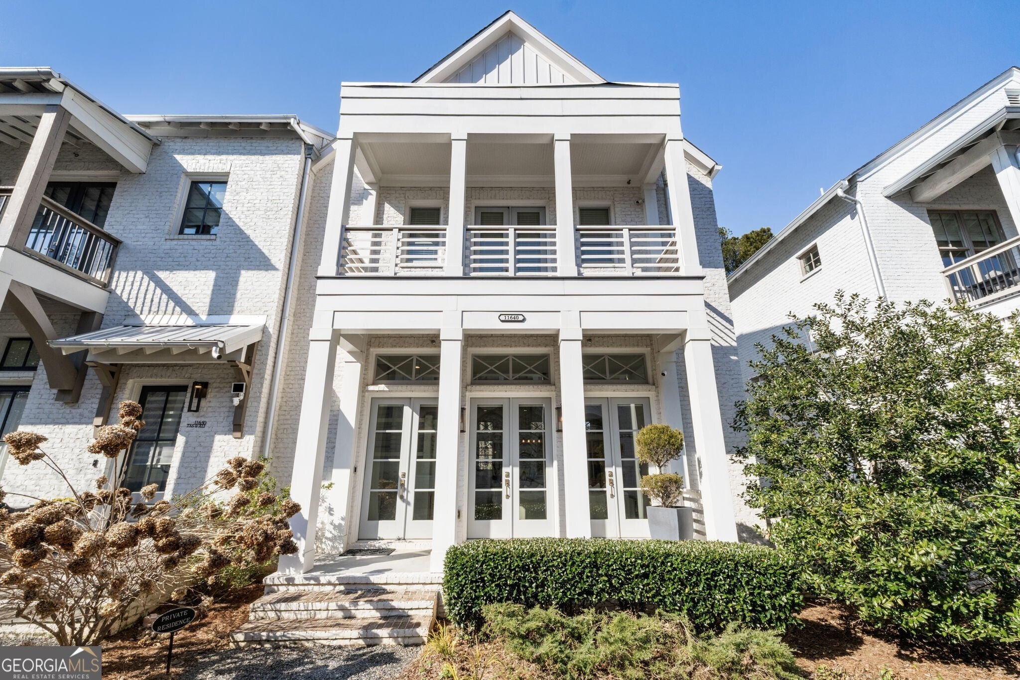 When you enter the home the natural light is pouring in and defined by soaring 12 foot ceilings on the main level, this classic traditional exterior pairs timeless Southern architecture with an easy, coastal inspired elegance. Designed for gracious entertaining, the main level unfolds effortlessly from the inviting front porch overlooking a picturesque courtyard through French doors into a spacious living room anchored by a fireplace. The layout transitions seamlessly into the dining area and well appointed kitchen, where hardwood flooring, curated lighting, an expansive quartz island, stainless steel appliances, a farmhouse sink, and abundant cabinetry create a welcoming setting for gatherings of any scale. An elevator ready closet offers future flexibility or additional storage. The terrace level provides a private bedroom, full bath, and generous storage, ideal for guests, a home office, or flexible living space. A two car garage adds everyday convenience. Upstairs, a sunlit hallway leads to thoughtfully designed secondary bedrooms, including a private suite, along with a spacious primary retreat featuring a freestanding soaking tub, oversized shower, dual vanities, and a custom walk in closet with built ins. Numerous closets throughout the home for all your storage needs. Just minutes from the Avalon, Georgia State Route 400, and downtown Alpharetta, this home offers a low maintenance lifestyle in one of the area's most desirable settings, where comfort and thoughtful design come together beautifully.