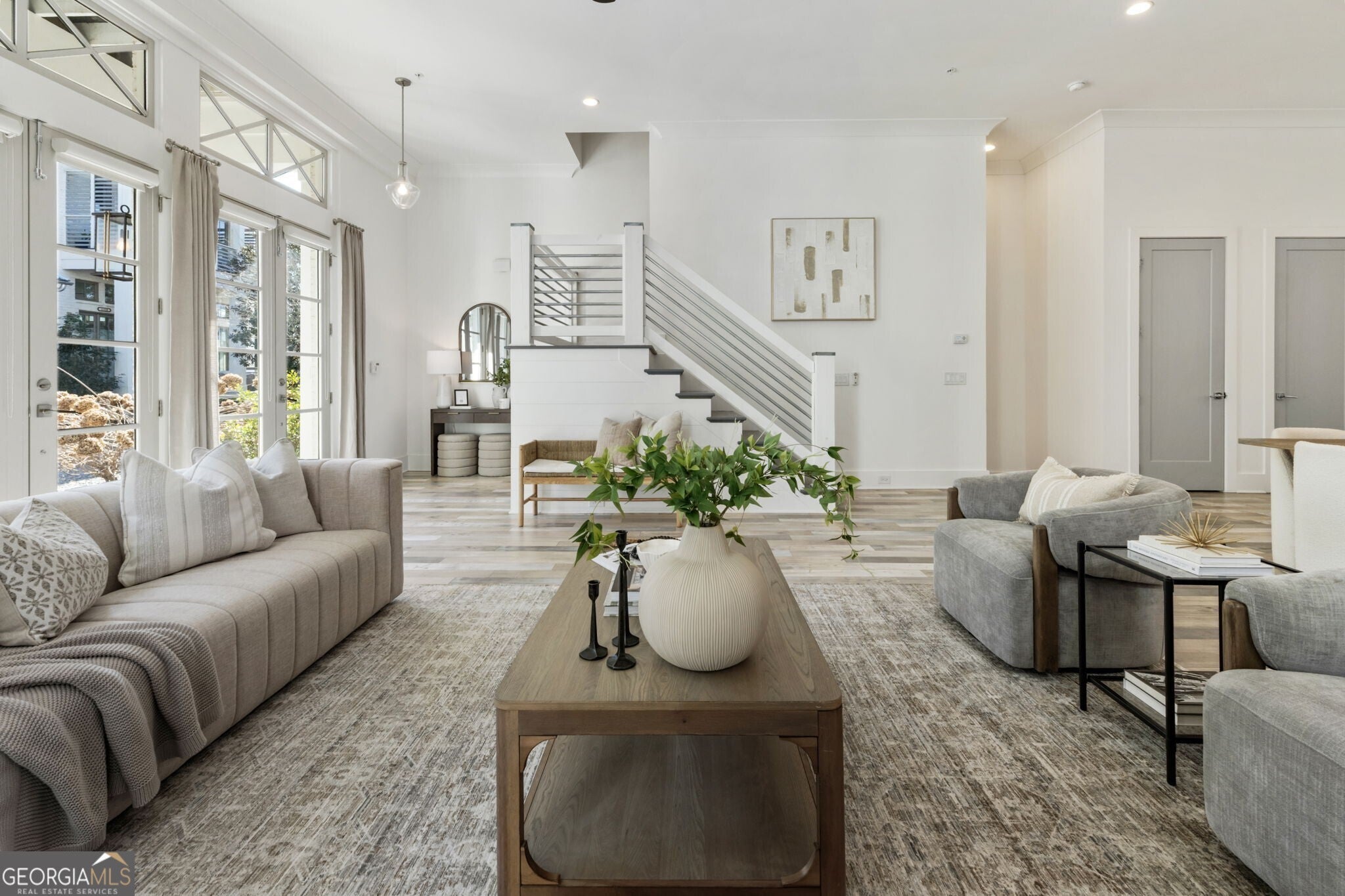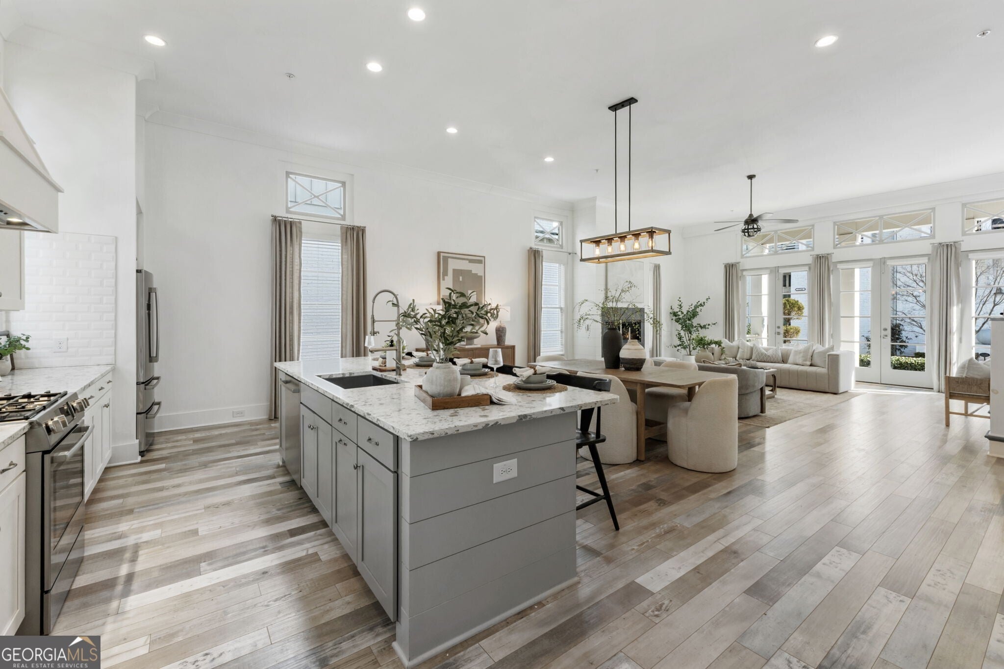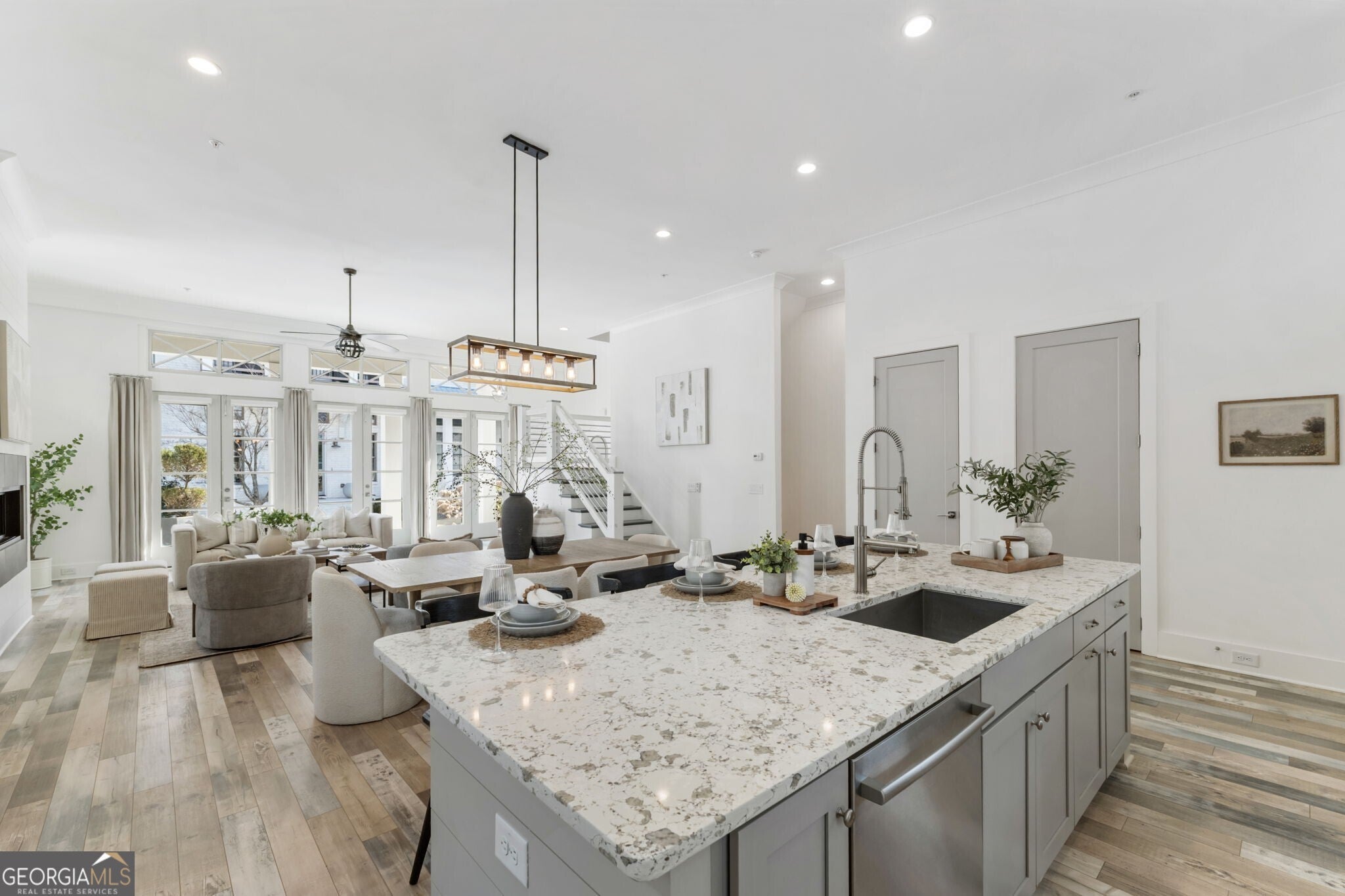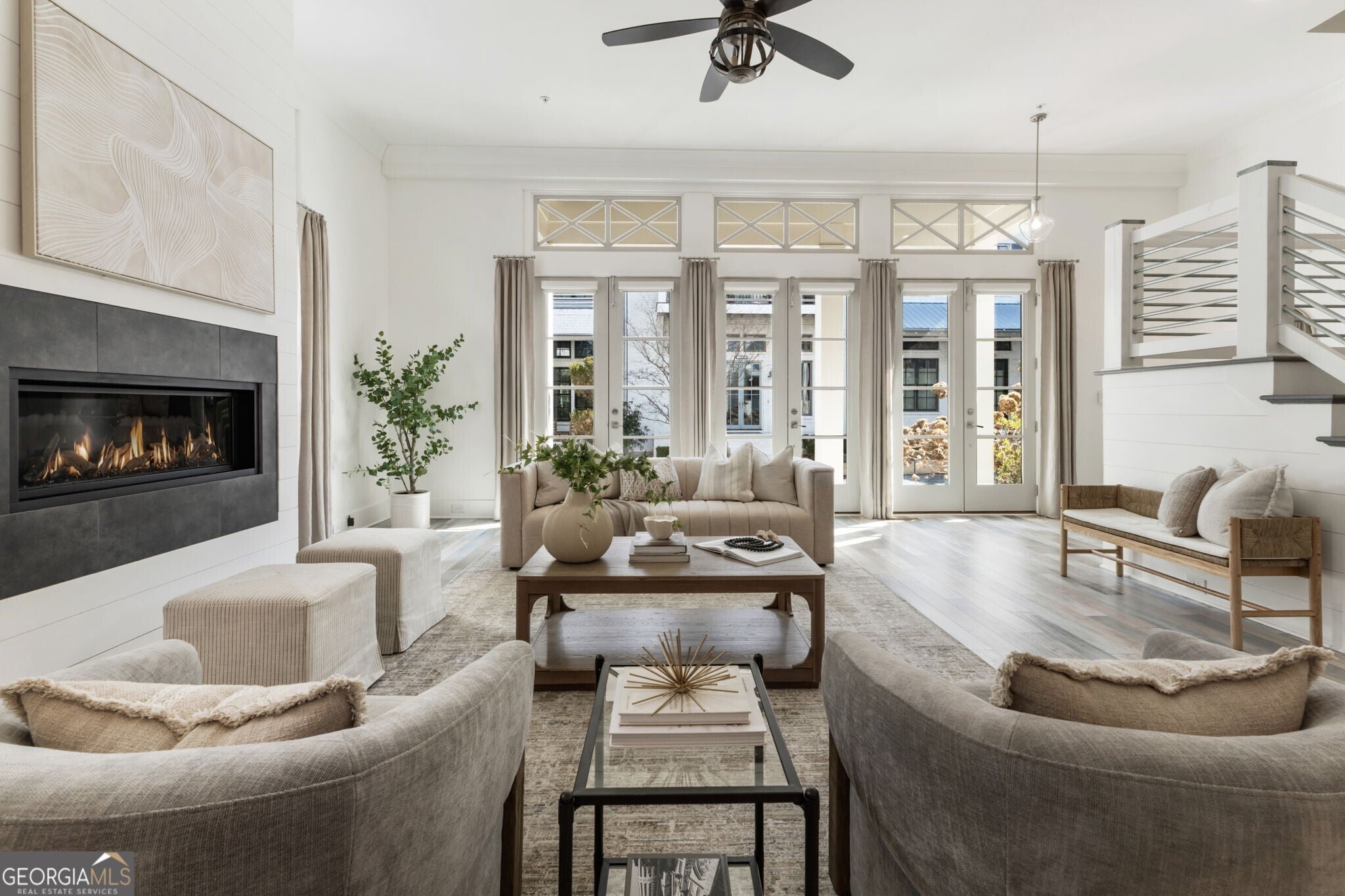 When you enter the home the natural light is pouring in and defined by soaring 12 foot ceilings on the main level, this classic traditional exterior pairs timeless Southern architecture with an easy, coastal inspired elegance. Designed for gracious entertaining, the main level unfolds effortlessly from the inviting front porch overlooking a picturesque courtyard through French doors into a spacious living room anchored by a fireplace. The layout transitions seamlessly into the dining area and well appointed kitchen, where hardwood flooring, curated lighting, an expansive quartz island, stainless steel appliances, a farmhouse sink, and abundant cabinetry create a welcoming setting for gatherings of any scale. An elevator ready closet offers future flexibility or additional storage. The terrace level provides a private bedroom, full bath, and generous storage, ideal for guests, a home office, or flexible living space. A two car garage adds everyday convenience. Upstairs, a sunlit hallway leads to thoughtfully designed secondary bedrooms, including a private suite, along with a spacious primary retreat featuring a freestanding soaking tub, oversized shower, dual vanities, and a custom walk in closet with built ins. Numerous closets throughout the home for all your storage needs. Just minutes from the Avalon, Georgia State Route 400, and downtown Alpharetta, this home offers a low maintenance lifestyle in one of the area's most desirable settings, where comfort and thoughtful design come together beautifully.