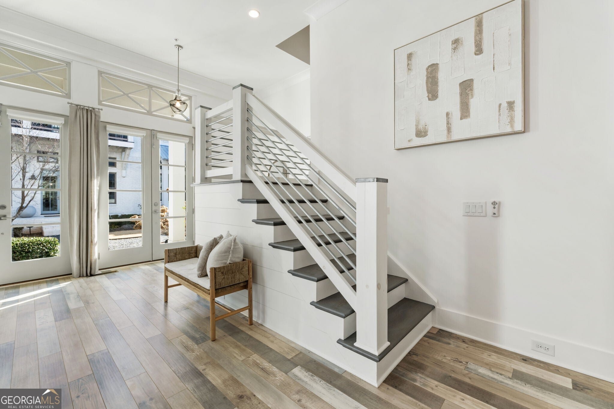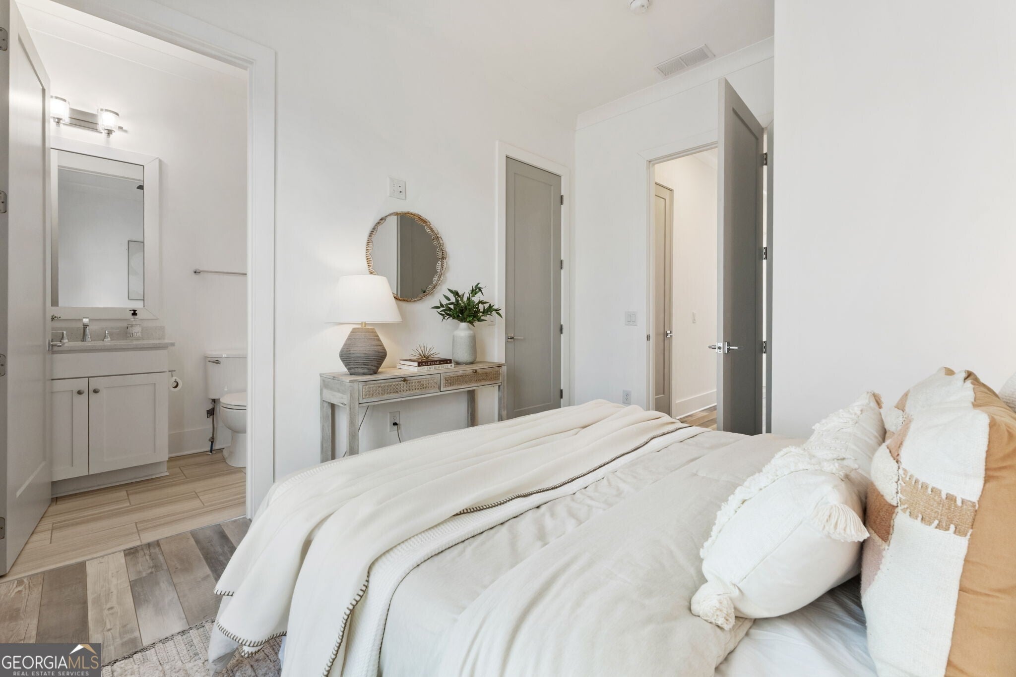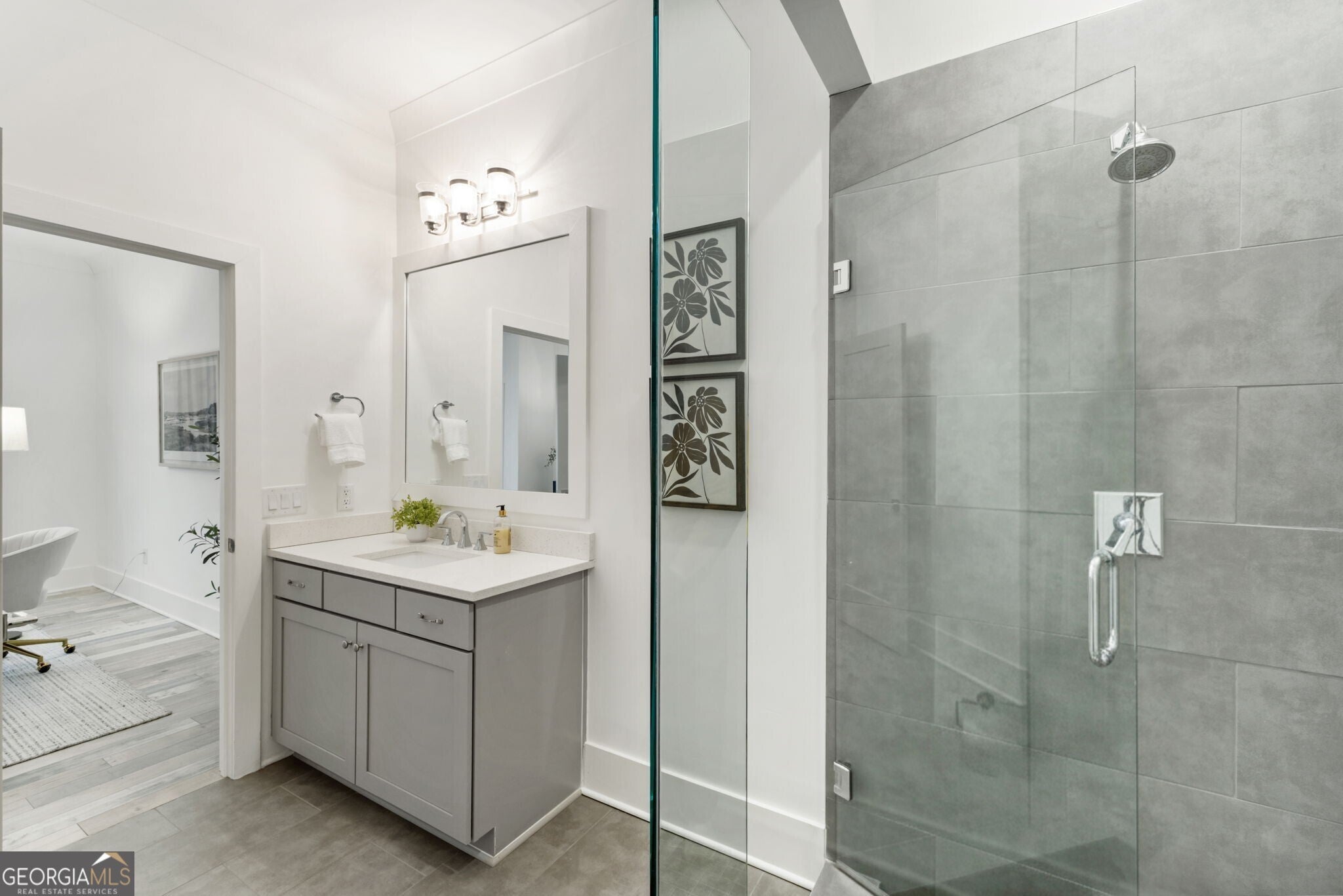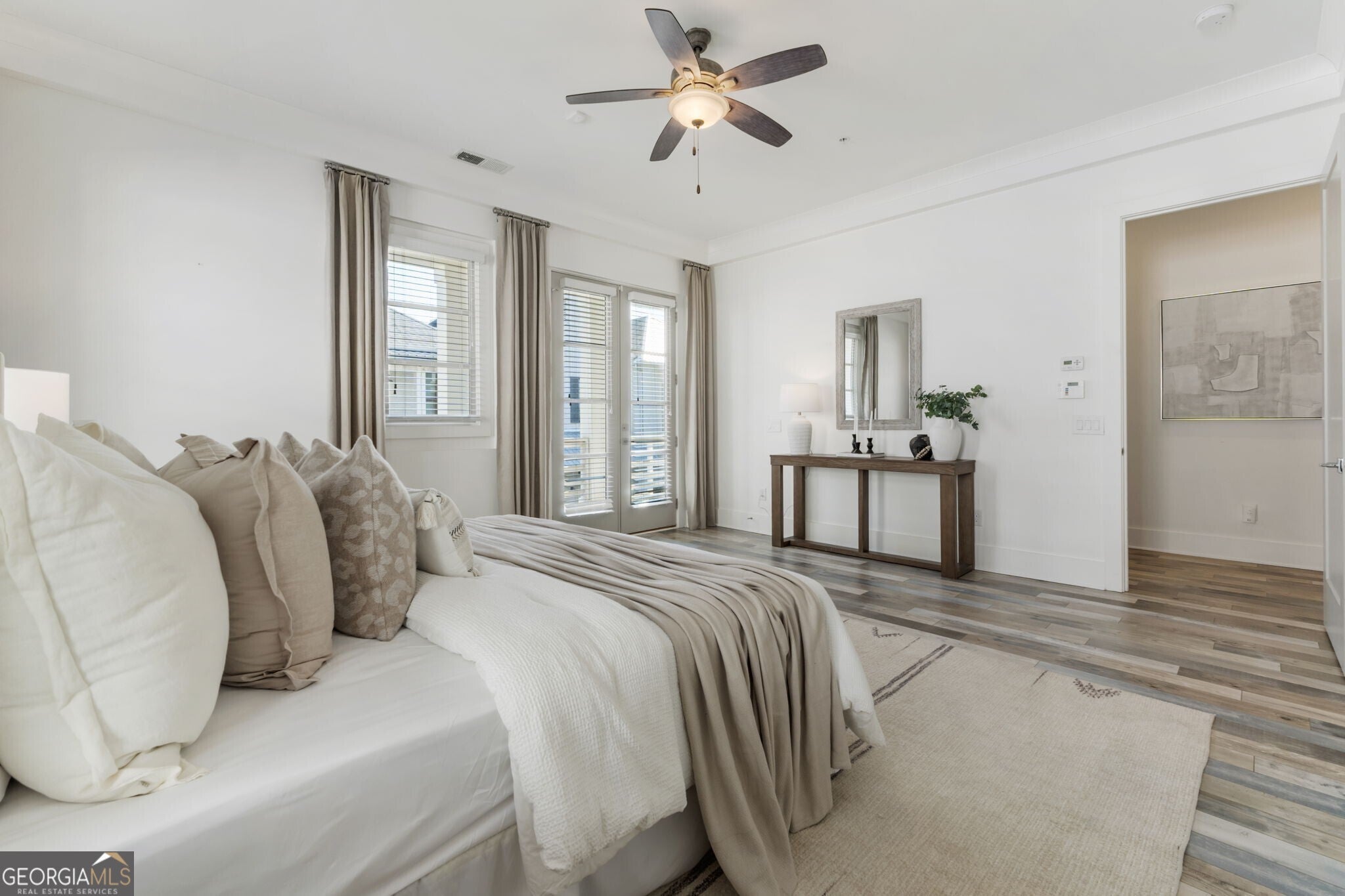 When you enter the home the natural light is pouring in and defined by soaring 12 foot ceilings on the main level, this classic traditional exterior pairs timeless Southern architecture with an easy, coastal inspired elegance. Designed for gracious entertaining, the main level unfolds effortlessly from the inviting front porch overlooking a picturesque courtyard through French doors into a spacious living room anchored by a fireplace. The layout transitions seamlessly into the dining area and well appointed kitchen, where hardwood flooring, curated lighting, an expansive quartz island, stainless steel appliances, a farmhouse sink, and abundant cabinetry create a welcoming setting for gatherings of any scale. An elevator ready closet offers future flexibility or additional storage. The terrace level provides a private bedroom, full bath, and generous storage, ideal for guests, a home office, or flexible living space. A two car garage adds everyday convenience. Upstairs, a sunlit hallway leads to thoughtfully designed secondary bedrooms, including a private suite, along with a spacious primary retreat featuring a freestanding soaking tub, oversized shower, dual vanities, and a custom walk in closet with built ins. Numerous closets throughout the home for all your storage needs. Just minutes from the Avalon, Georgia State Route 400, and downtown Alpharetta, this home offers a low maintenance lifestyle in one of the area's most desirable settings, where comfort and thoughtful design come together beautifully.