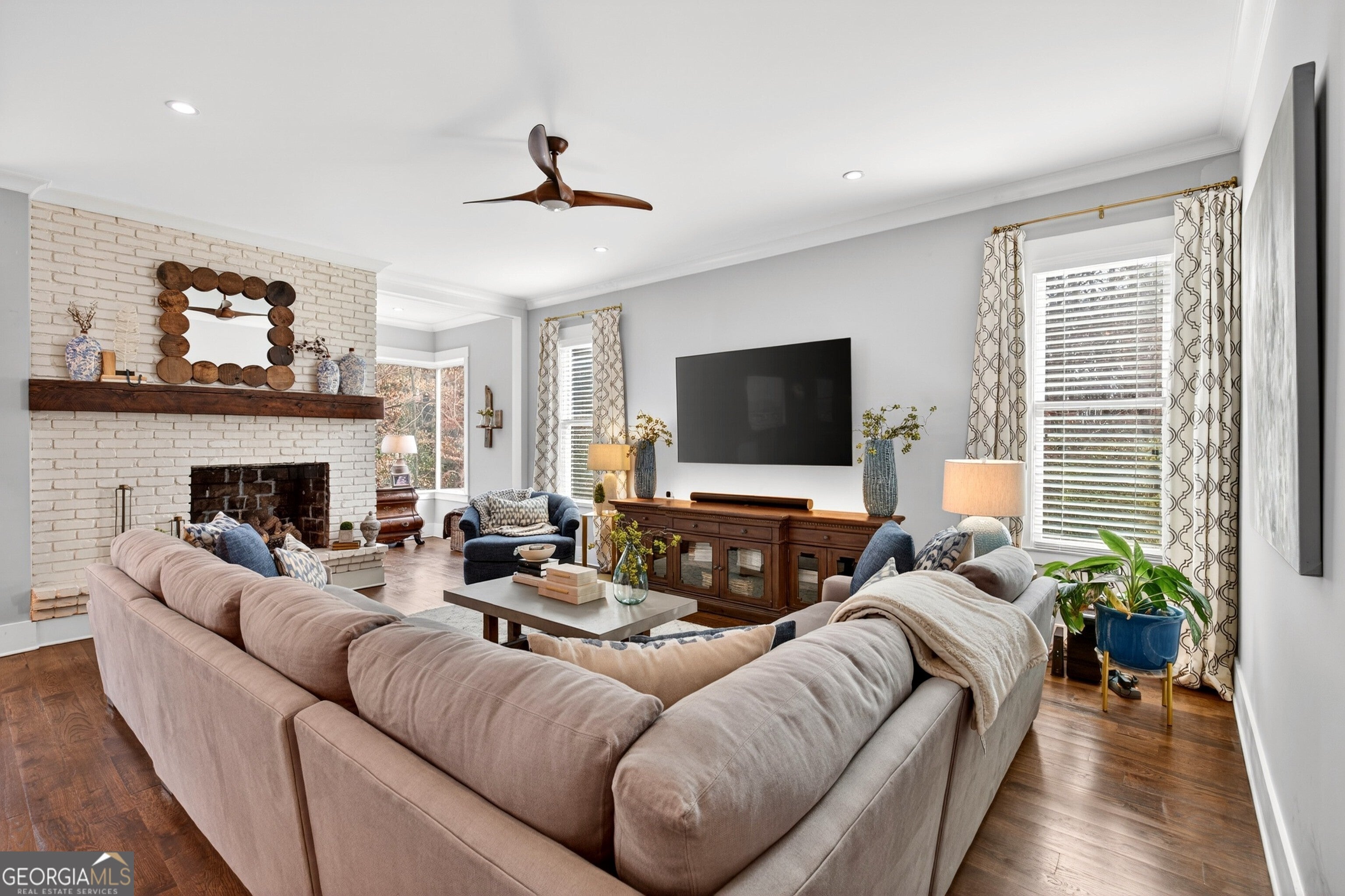 Location, location, location... this home is a stone's throw away from Vinings Jubilee. Blending new construction comfort with reclaimed architectural detail, this Vinings home is tucked among mature trees and designed for refined everyday living. Restored features including reclaimed wood stair treads, custom iron railings, and exposed brick columns add warmth and character throughout. With 7 Bedrooms, and 6 bathrooms, it creates plenty of space for an office and other flex rooms. Natural light washes over the open living and dining areas, with hardwood floors and windows overlooking the tree canopy. The kitchen anchors the main level with custom cabinetry, stone countertops, and a large island suited for gathering and casual dining. The owner's suite offers a sitting area, trey ceiling, and a spa-style bath with a clawfoot tub, multi-jet shower, and a generous walk-in closet. Secondary bedrooms are well-sized, and there are additional living areas on both the upper and terrace levels, including a bourbon bar. With this home being only four houses from Vinings Jubilee, this location is incredibly walkable to shopping and dining, and enjoys quick access to Buckhead, Midtown, and major interstates.