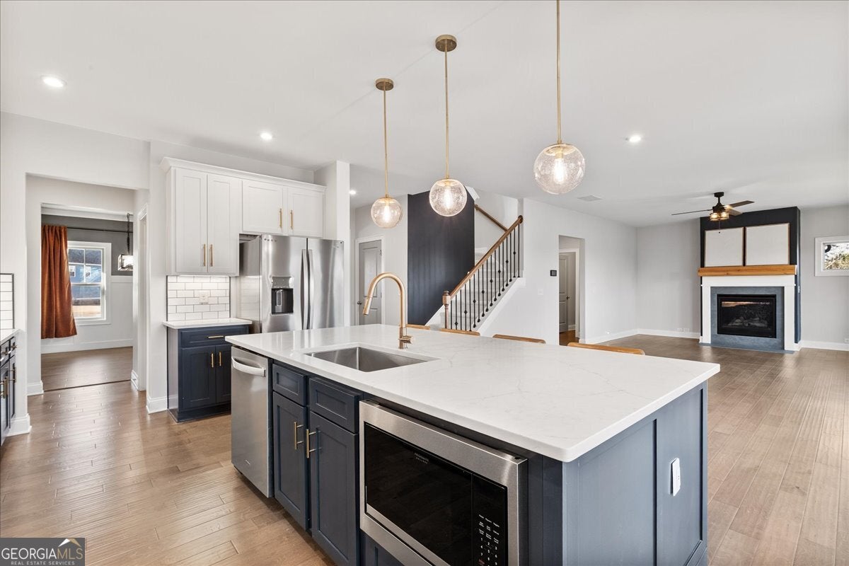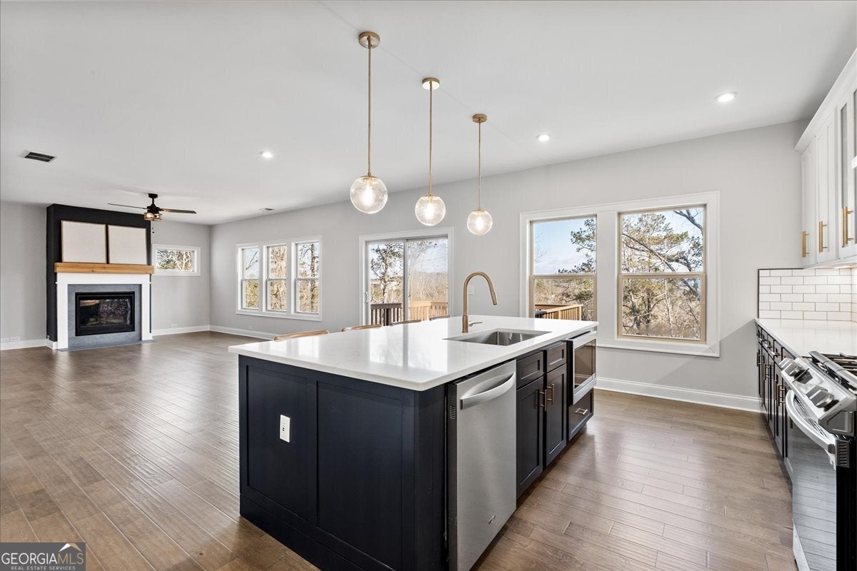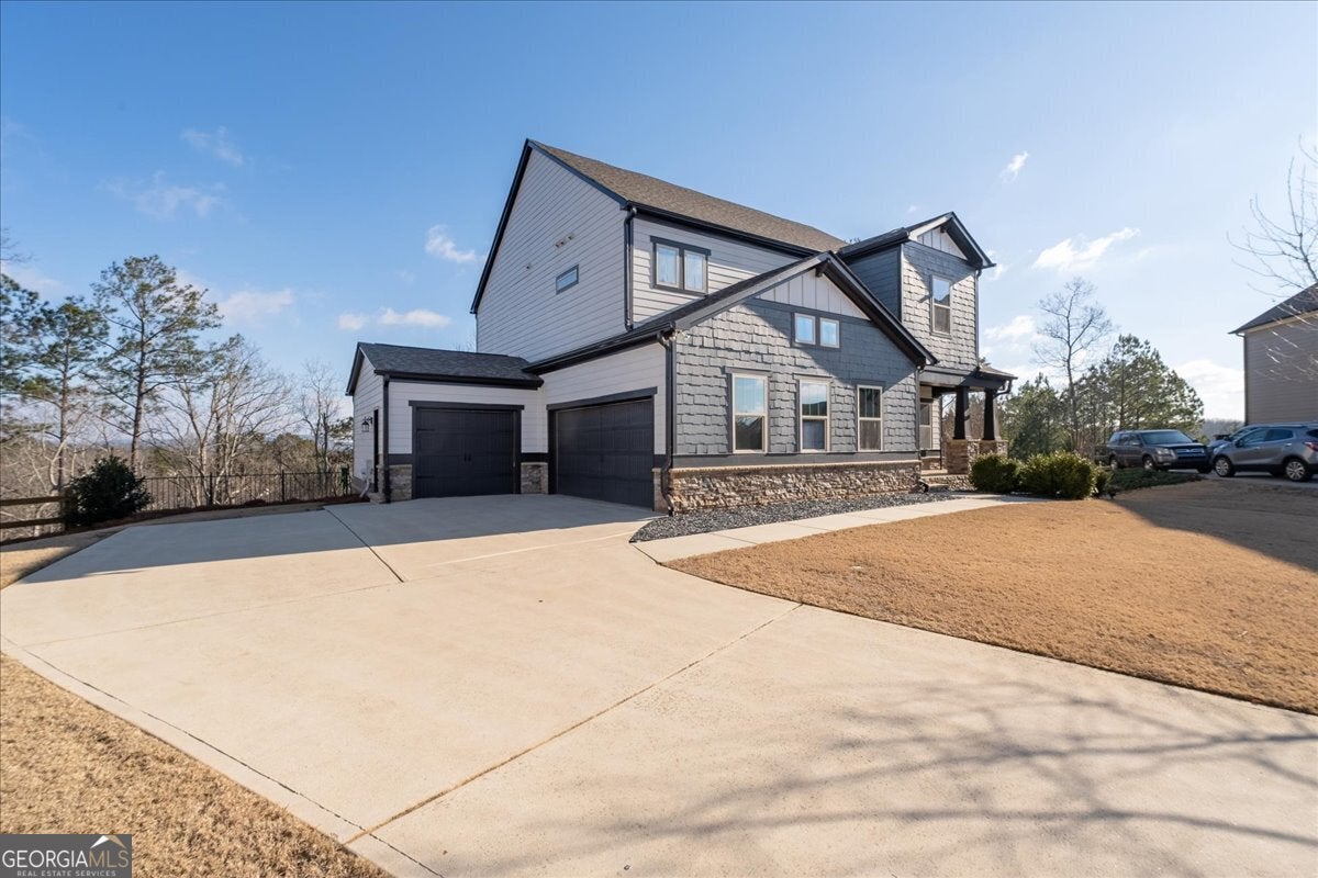 Welcome to this beautifully designed two-story home offering space, style, and exceptional functionality. Situated on a level front yard with a covered front porch, this home boasts impressive curb appeal with cement siding and elegant stone accents, complemented by professional landscaping and slate rock detailing around the island beds. Step inside to an inviting open-concept main level designed for both everyday living and entertaining. The spacious kitchen is the heart of the home, featuring an oversized island with seating for four, upgraded maple cabinets and drawers (September 2022), new range, microwave, and vent hood, abundant cabinet storage, and an oversized walk-in pantry. A butler's pantry connects to the separate formal dining room, offering added convenience for hosting. The living room showcases a cozy fireplace and flows seamlessly to the back deck, where you'll enjoy beautiful views and a private, tree-lined backyard. Upstairs, the primary suite offers a peaceful retreat with a private bath featuring double vanities, a dressing table, walk-in shower, and a generous walk-in closet. Three additional guest bedrooms, a full bathroom, and an upper-level laundry room provide comfort and convenience for family or guests. The fully finished basement (completed in 2025) expands your living space with a large living room, additional bedroom, and full bathroom-perfect for guests, in-laws, or a private home office setup. Additional highlights include a three-car garage, cut-de-sac lot, and thoughtful upgrades throughout. This home truly combines elegance, privacy, and modern convenience.