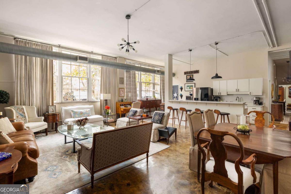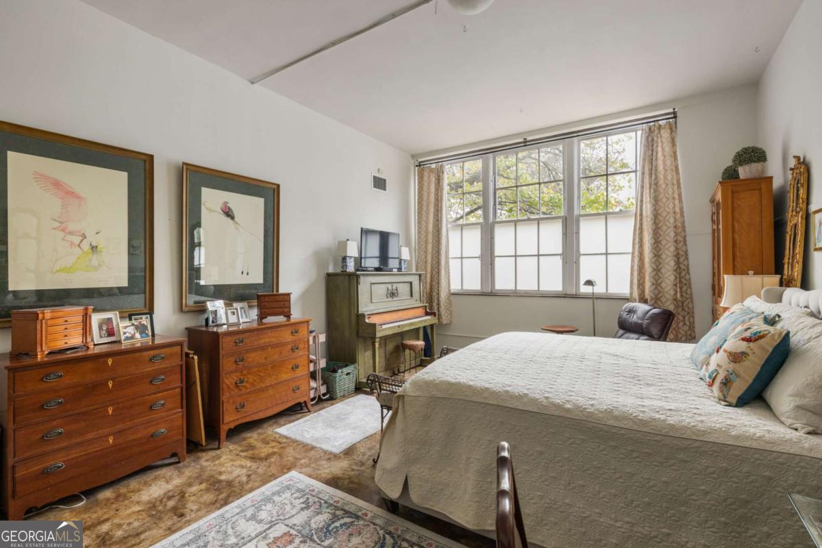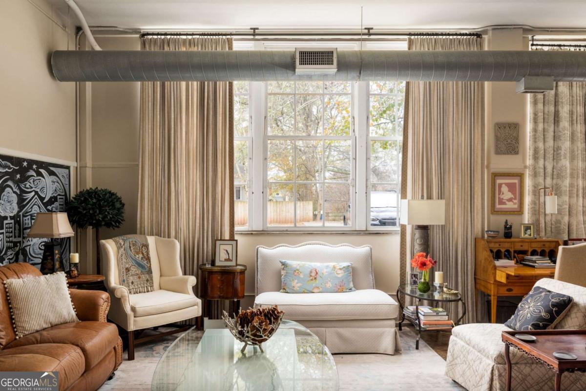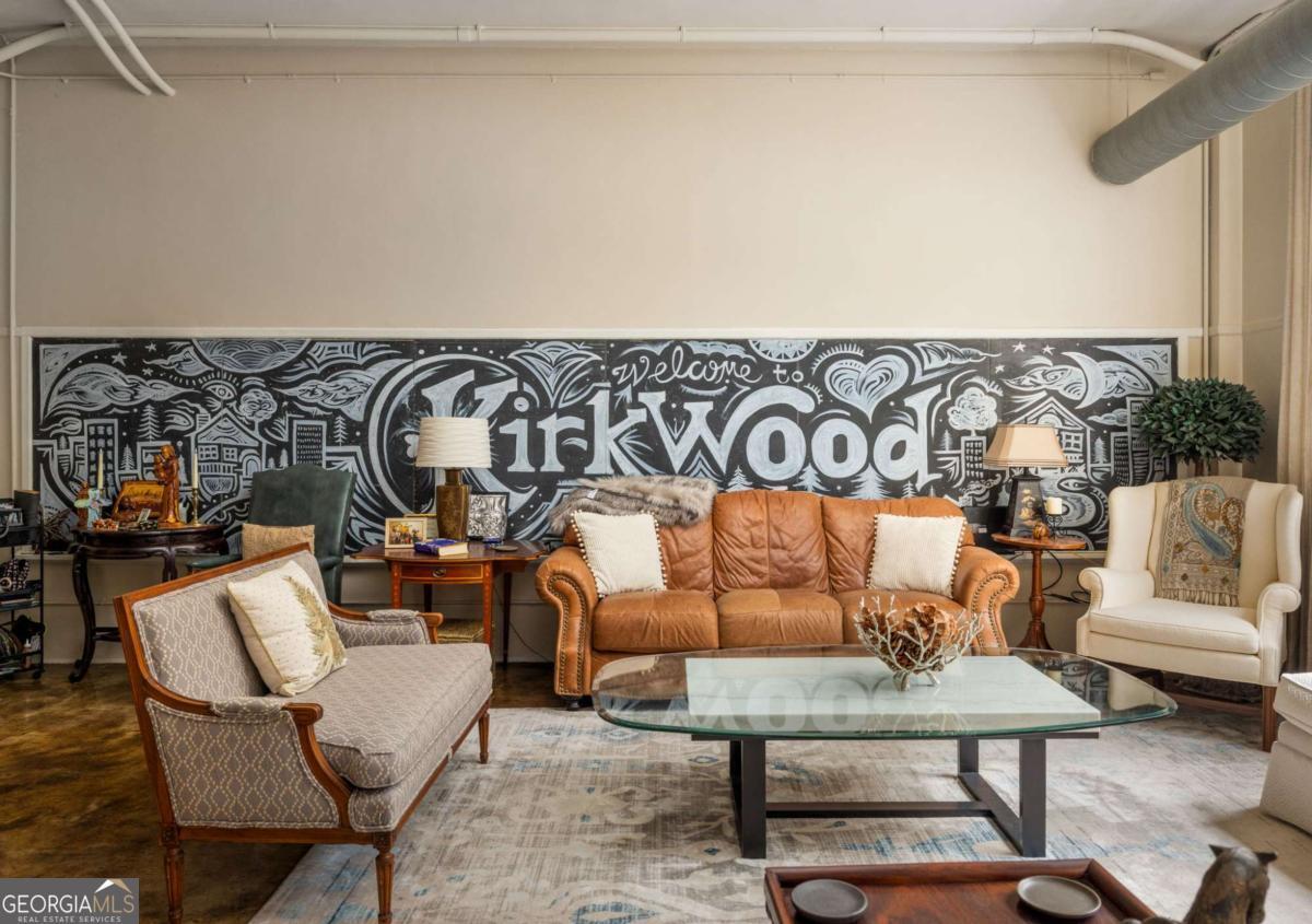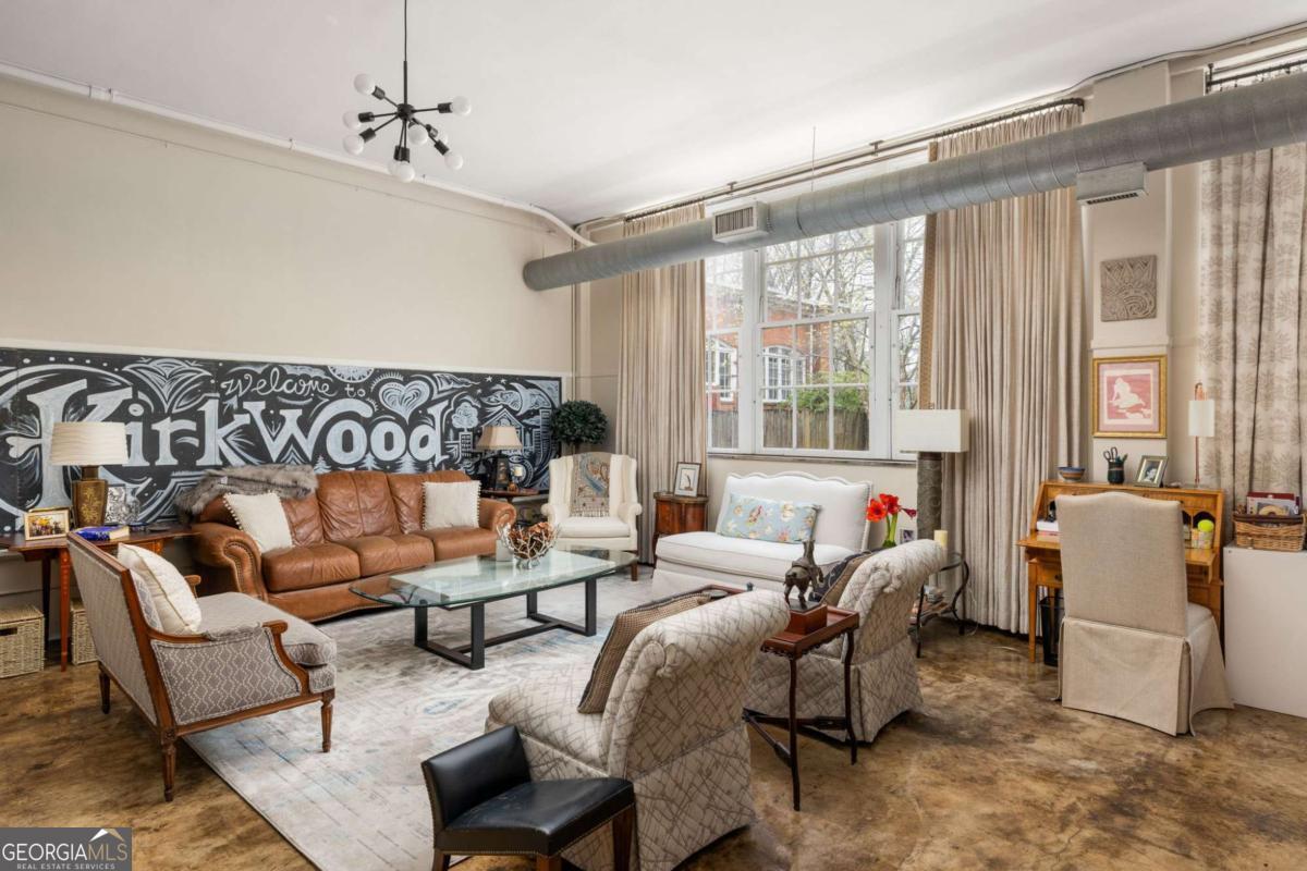 Step into a piece of Kirkwood history with this one-of-a-kind loft in a converted school building, now home to just 21 distinctive residences. Originally the music room, this spacious 2-bedroom, 1-bath loft blends industrial character with creative charm. Inside, you'll find soaring ceilings, expansive windows that flood the space with natural light, and concrete floors that anchor the home with authentic loft style. The open, airy layout offers exceptional flexibility for living, dining, working, and entertaining, all within a setting that feels both dramatic and comfortable. What truly sets this property apart are the incredible grounds - a rarity in intown Atlanta. Residents enjoy sprawling green space, community gardens, and multiple sitting areas that create a peaceful, community feel that's hard to find. The unit also includes two assigned parking spaces plus plentiful parking for guests. The location is just as impressive. Situated directly across from Bessie Branham Park and only a few blocks from the restaurants, shops, and beloved bakery in Kirkwood Village, you get the perfect blend of nature, walkability, and vibrant neighborhood energy. Historic soul, artistic character, and outdoor space you simply won't find elsewhere - this Kirkwood loft is anything but ordinary.