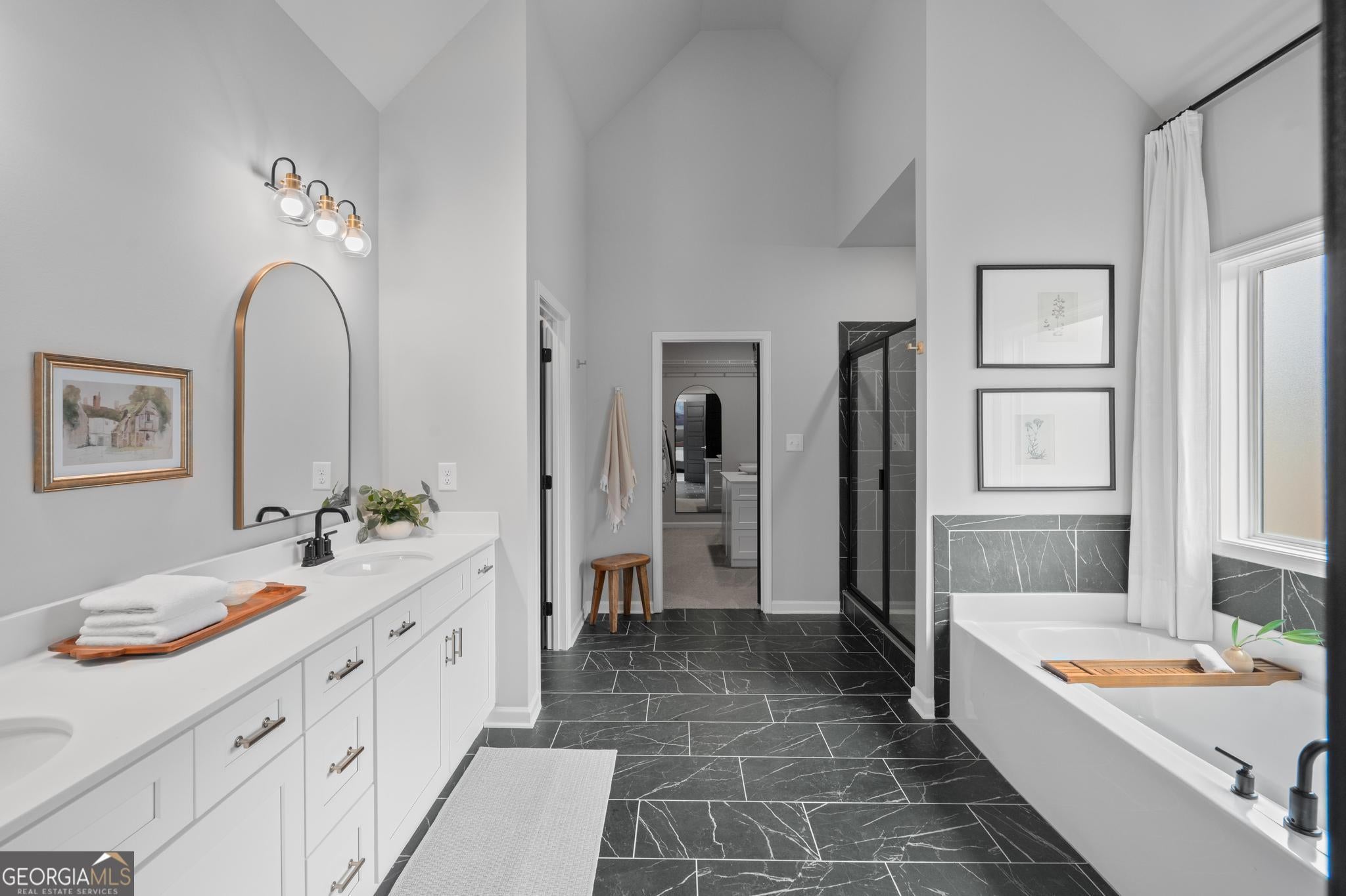 - Interior FeaturesTray Ceiling(s), High Ceilings, Double Vanity, Two Story Foyer, Soaking Tub, Separate Shower, Tile Bath, Walk-In Closet(s), Master On Main Level