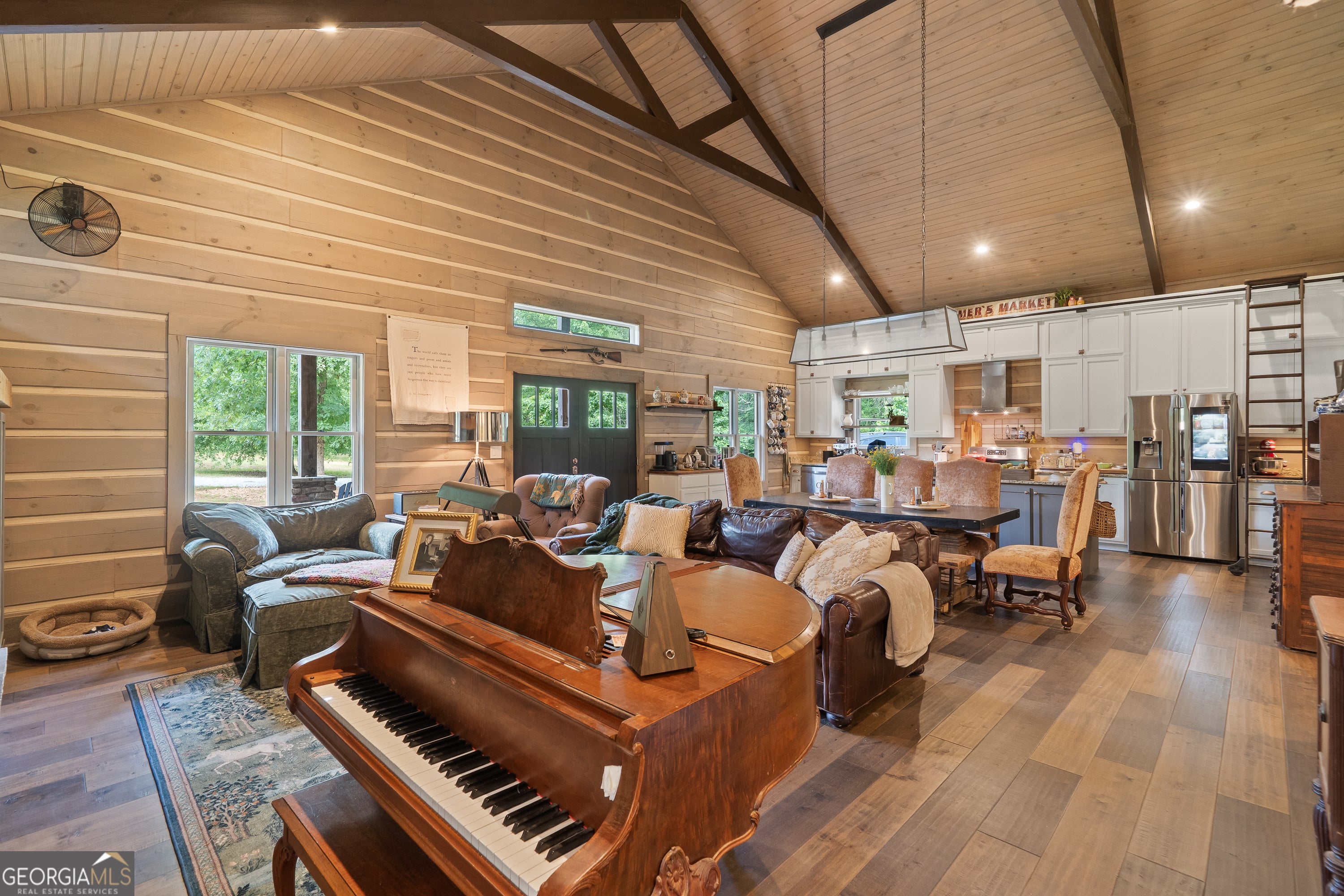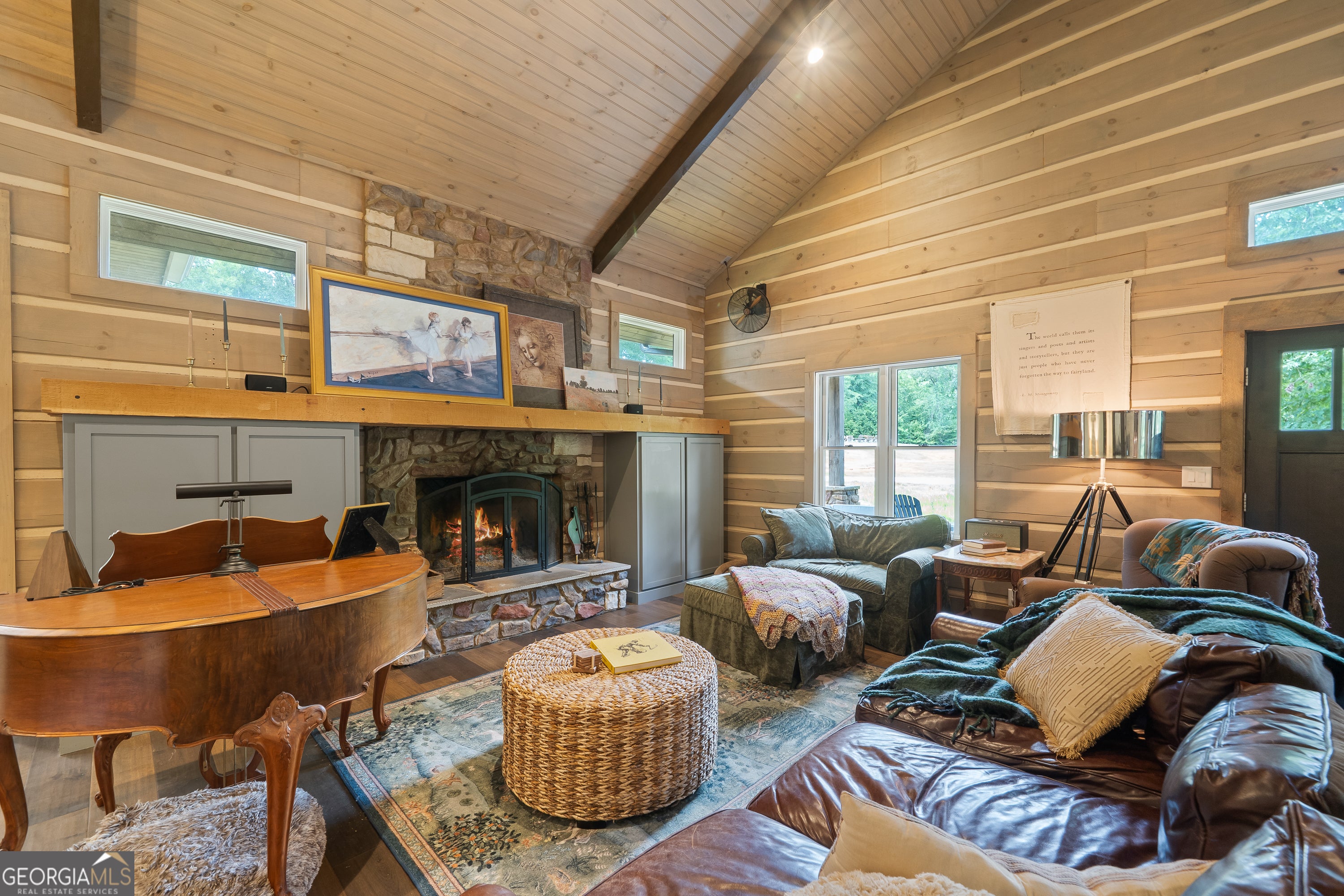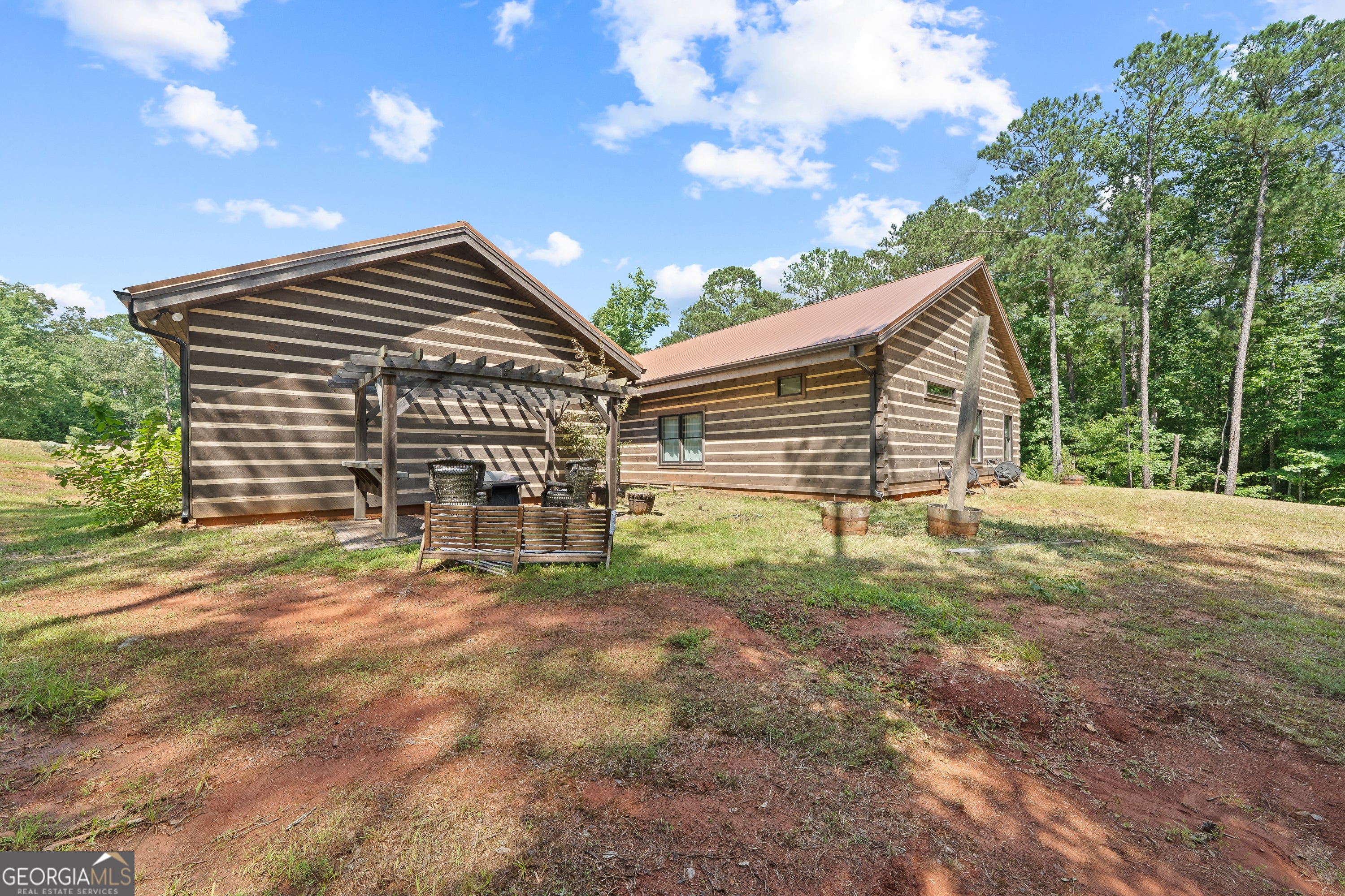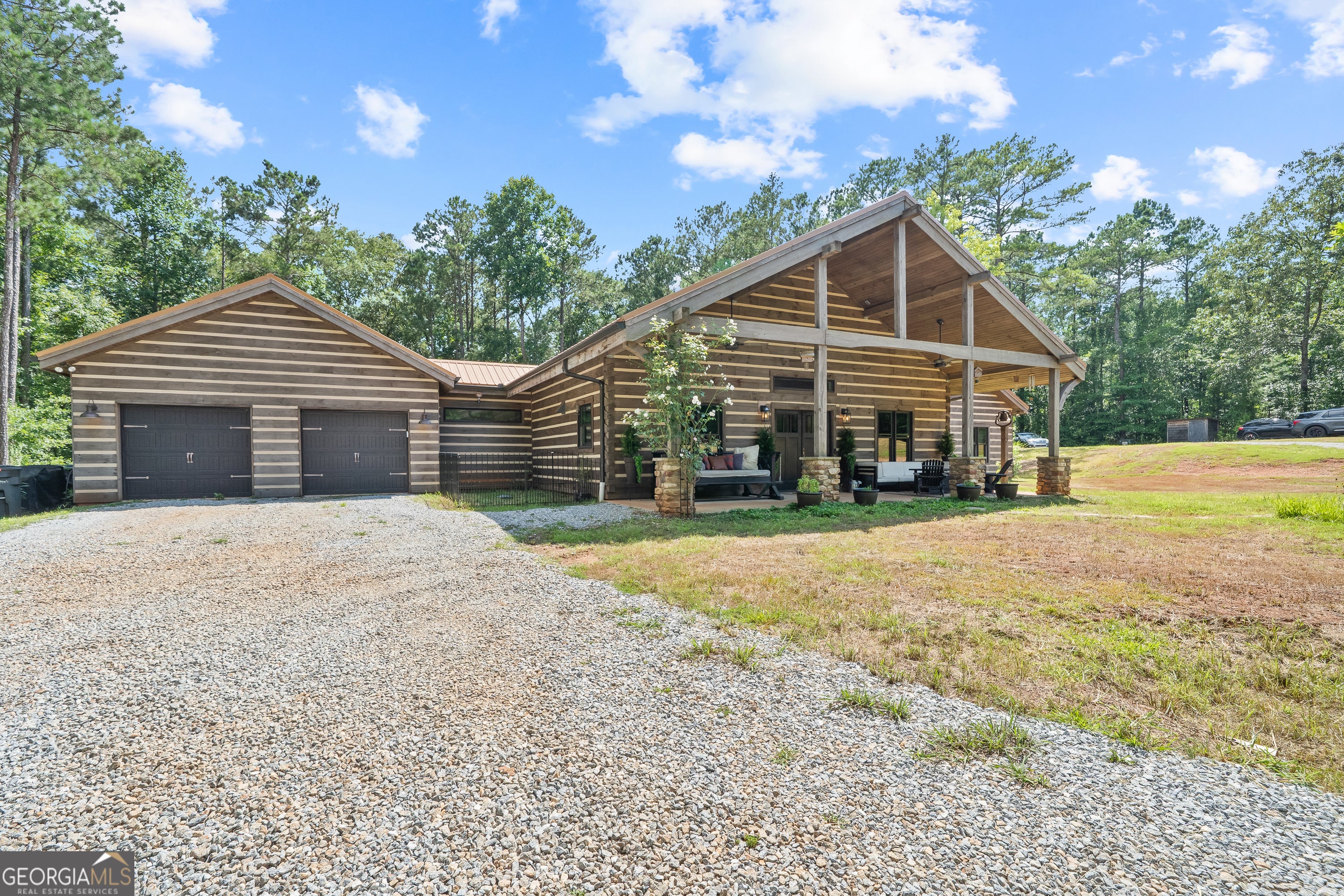 Escape to your dream countryside copper cabin in the woods! Do not miss out on this a meticulously maintained ranch-style log cabin home built in 2018, nestled on a serene 40-acre wooded estate in the upscale River Farm area of Morgan County. Experience country elegance with this beautifully designed 4-bedroom, 3-bath home, ideally set on 40 serene acres. This custom designed home offers over 2,800 square feet of refined comfort, open living, tons of natural light and peaceful outdoor enjoyment. Step inside to an open-concept layout featuring soaring vaulted ceilings, hardwood floors, and a large cozy stone fireplace. The gourmet kitchen is a chef's dream with a large island, granite countertops, stainless appliances, brand new gas stove, under cabinet lighting and generous cabinetry. The spacious primary suite includes vaulted ceilings, walk in closet with custom storage, a spa-like bath with dual vanities, a claw foot tub, and a walk-in shower. Two additional bedrooms offer spacious closets with container storage and plenty of natural light. The 4th bedroom could be a flex space with options for a bonus room, flexibility for guests, a home office, or recreation. This oversized room has endless possibilities! Outside, unwind on the covered patio overlooking your private wooded retreat-perfect for entertaining, relaxing, or watching Georgia sunsets. And lets not forget about the many fruit trees, trails for walking or riding, river fun and more! This home offers RV water and electric hook up, spray foam insulation 2 HVAC units, 8 foot solid doors throughout, wired for whole home generator, 16x40 barn/shop with electricity and stubbed for bath, wood shed and so much more! With mature hardwoods that have never been cruised, trails and over 800 ft of river frontage on the property, its every hunter's dream. Please see additional documents for a list of extras this home has to offer. Do not wait to come see! This is more than a home-it's a lifestyle. Schedule your private tour today and fall in love with the tranquility of Madison living. 1% rate reduction with preferred lender