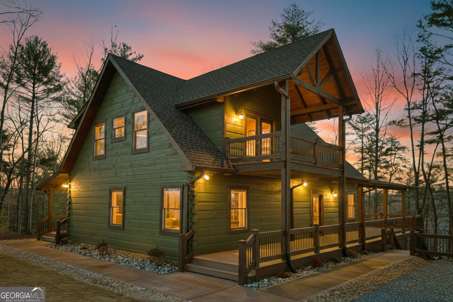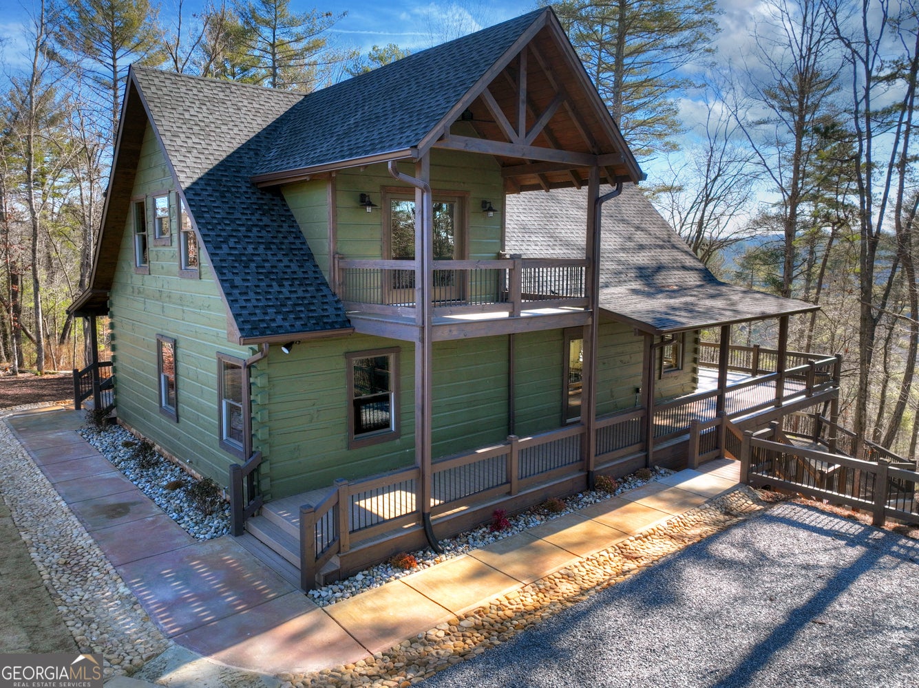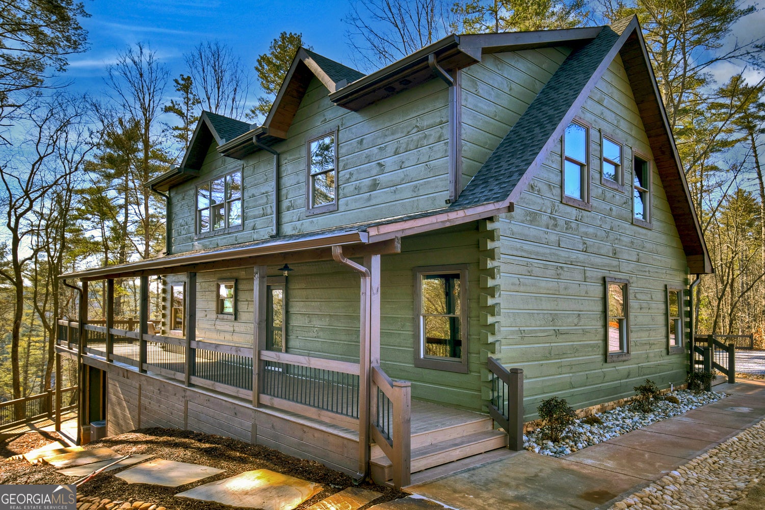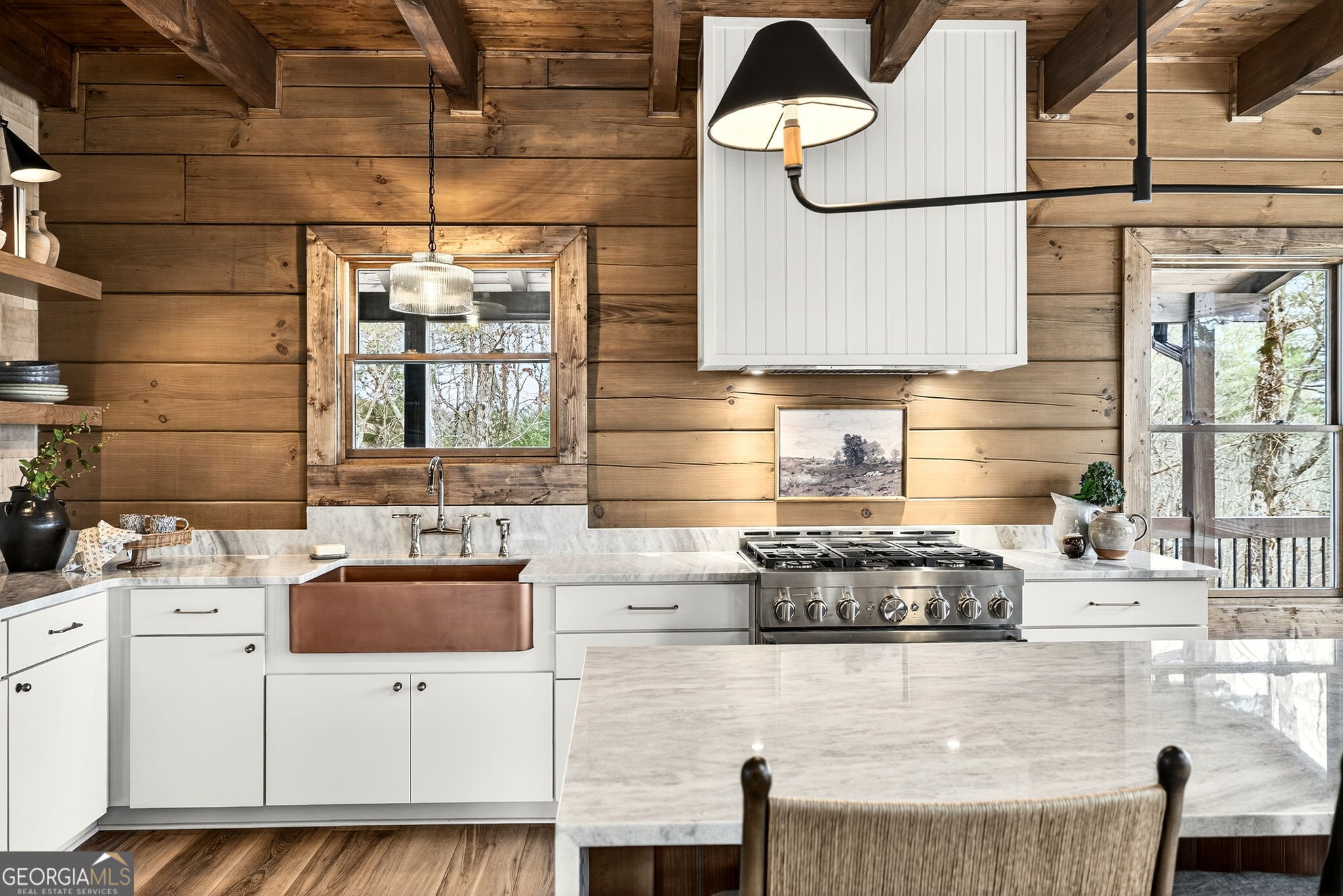 Tucked away in the heart of the mountains, this LUXURY MOUNTAIN RETREAT features authentic true log construction, offering a rare blend of natural beauty and refined craftsmanship on 2.46 acres. Wake each morning to year-round MOUNTAIN & CREEK VIEWS & enjoy the soothing sights & sounds of Mountaintown Creek flowing below, w/ 111 feet of creek frontage. Professionally decorated & selling FURNISHED w/ a curated collection, each piece has been intentionally selected to enhance the home's character & create a warm, cohesive living experience-balancing rustic charm w/ modern luxury. The open-concept great room features vaulted beamed ceilings, shiplap accents, & a modern electric fireplace w/ a porcelain tile feature wall, while the chef's kitchen showcases exposed beams, a marble waterfall island, copper farmhouse sink, 36" stainless gas range, & designer tile backsplash.The main-level primary suite offers dual walk-in closets, a spa-like ensuite w/ marble tile & a double vanity, along with a mudroom, pantry & laundry on the main level. Upstairs includes an oversized LOFT w/ a custom iron railing & mountain & creek views, two additional bedrooms (one w/ a private covered porch), & a full bath. The finished terrace level is built for entertaining, featuring a wet bar w/ wine cooler, gas-log stone fireplace, full spa-like bath, & flexible bonus room ideal for extra sleeping/bunk room, home office, or gym. Outdoor living shines w/ a wrap-around main-level deck, generous patio w/ fire-pit area & professionally landscaped grounds. Enjoy peace of mind w/ a full-house generator & the assurance the home is not located in a flood plain. Located in a small private gated community just 10 minutes from Downtown Ellijay, this property features all-paved access, no steep drives, plentiful parking, & allows short-term rentals. This property is ideal as a full-time residence, second home, or investment property. (An additional adjacent 2.37-acre lot is also available for purchase.)