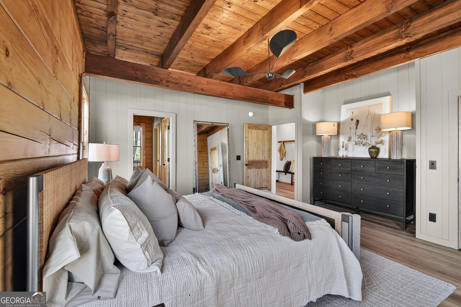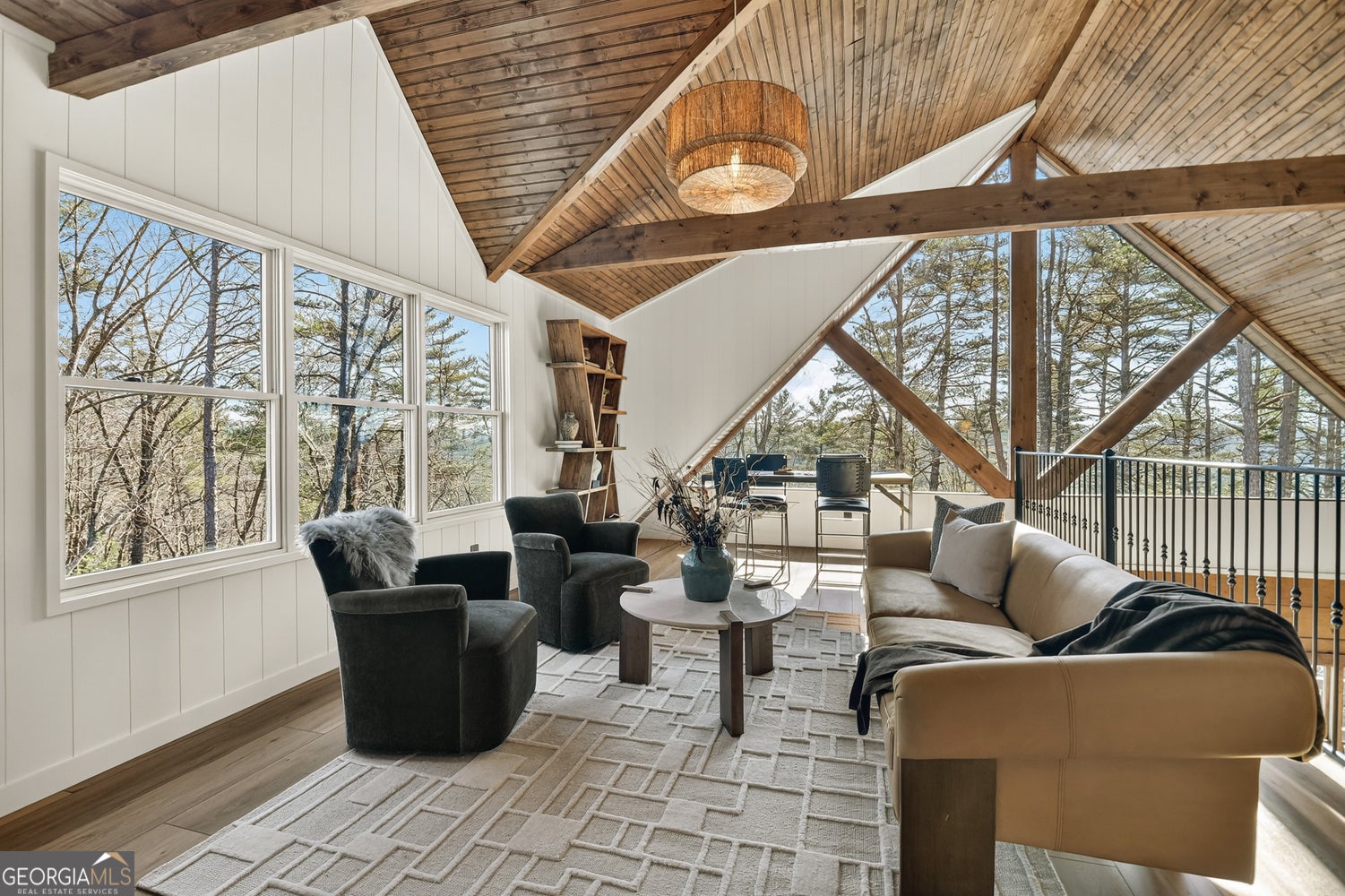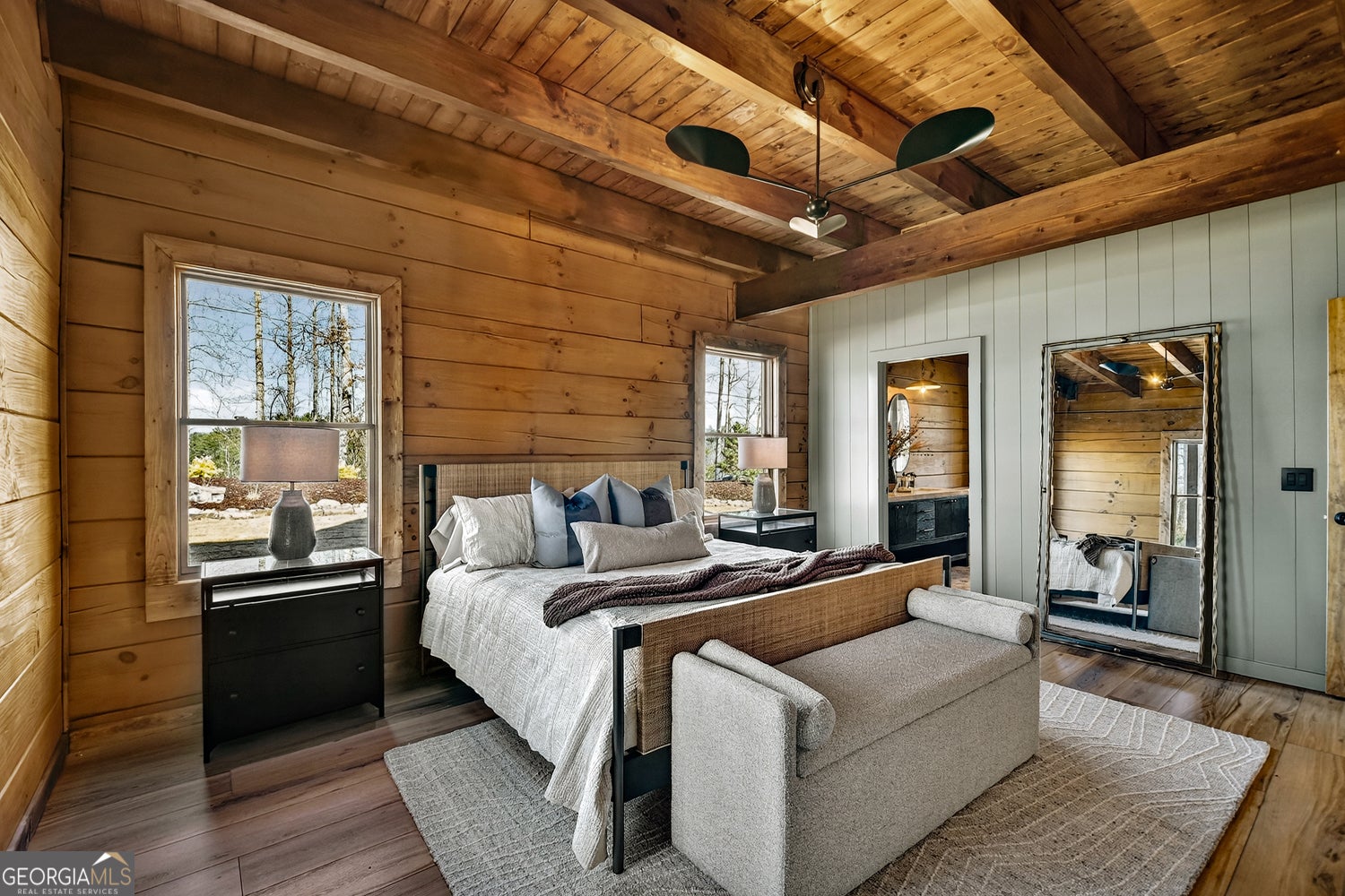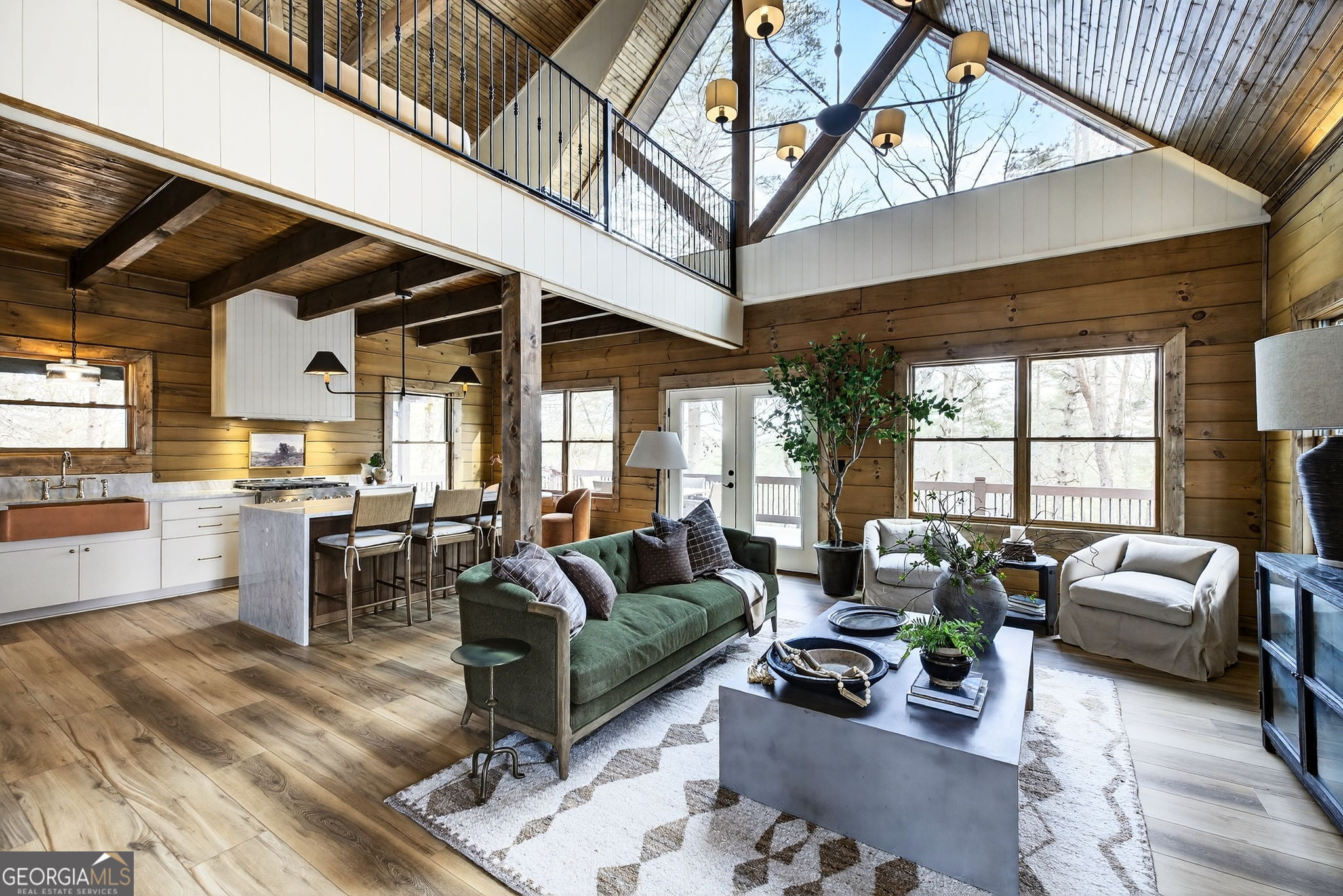 Tucked away in the heart of the mountains, this LUXURY MOUNTAIN RETREAT features authentic true log construction, offering a rare blend of natural beauty and refined craftsmanship on 2.46 acres. Wake each morning to year-round MOUNTAIN & CREEK VIEWS & enjoy the soothing sights & sounds of Mountaintown Creek flowing below, w/ 111 feet of creek frontage. Professionally decorated & selling FURNISHED w/ a curated collection, each piece has been intentionally selected to enhance the home's character & create a warm, cohesive living experience-balancing rustic charm w/ modern luxury. The open-concept great room features vaulted beamed ceilings, shiplap accents, & a modern electric fireplace w/ a porcelain tile feature wall, while the chef's kitchen showcases exposed beams, a marble waterfall island, copper farmhouse sink, 36" stainless gas range, & designer tile backsplash.The main-level primary suite offers dual walk-in closets, a spa-like ensuite w/ marble tile & a double vanity, along with a mudroom, pantry & laundry on the main level. Upstairs includes an oversized LOFT w/ a custom iron railing & mountain & creek views, two additional bedrooms (one w/ a private covered porch), & a full bath. The finished terrace level is built for entertaining, featuring a wet bar w/ wine cooler, gas-log stone fireplace, full spa-like bath, & flexible bonus room ideal for extra sleeping/bunk room, home office, or gym. Outdoor living shines w/ a wrap-around main-level deck, generous patio w/ fire-pit area & professionally landscaped grounds. Enjoy peace of mind w/ a full-house generator & the assurance the home is not located in a flood plain. Located in a small private gated community just 10 minutes from Downtown Ellijay, this property features all-paved access, no steep drives, plentiful parking, & allows short-term rentals. This property is ideal as a full-time residence, second home, or investment property. (An additional adjacent 2.37-acre lot is also available for purchase.)