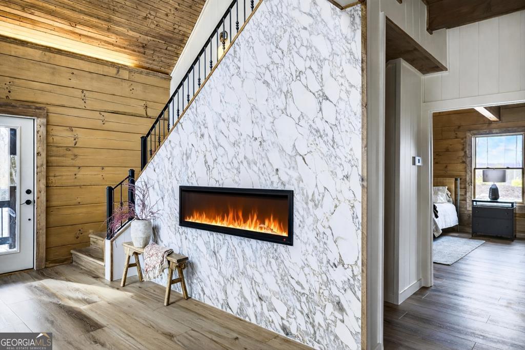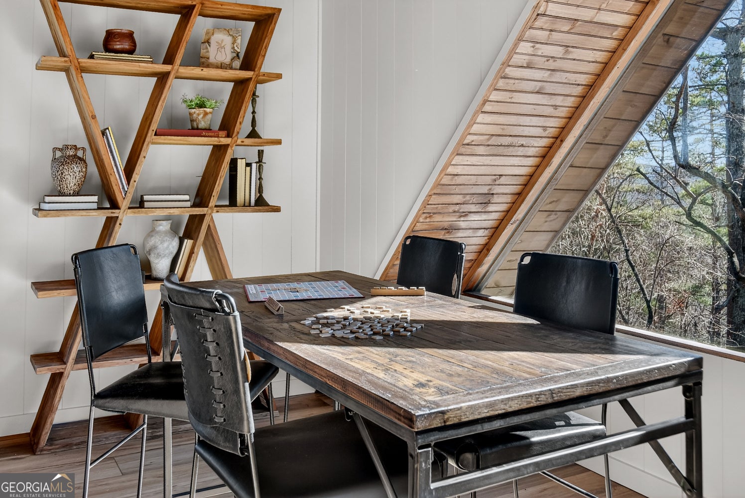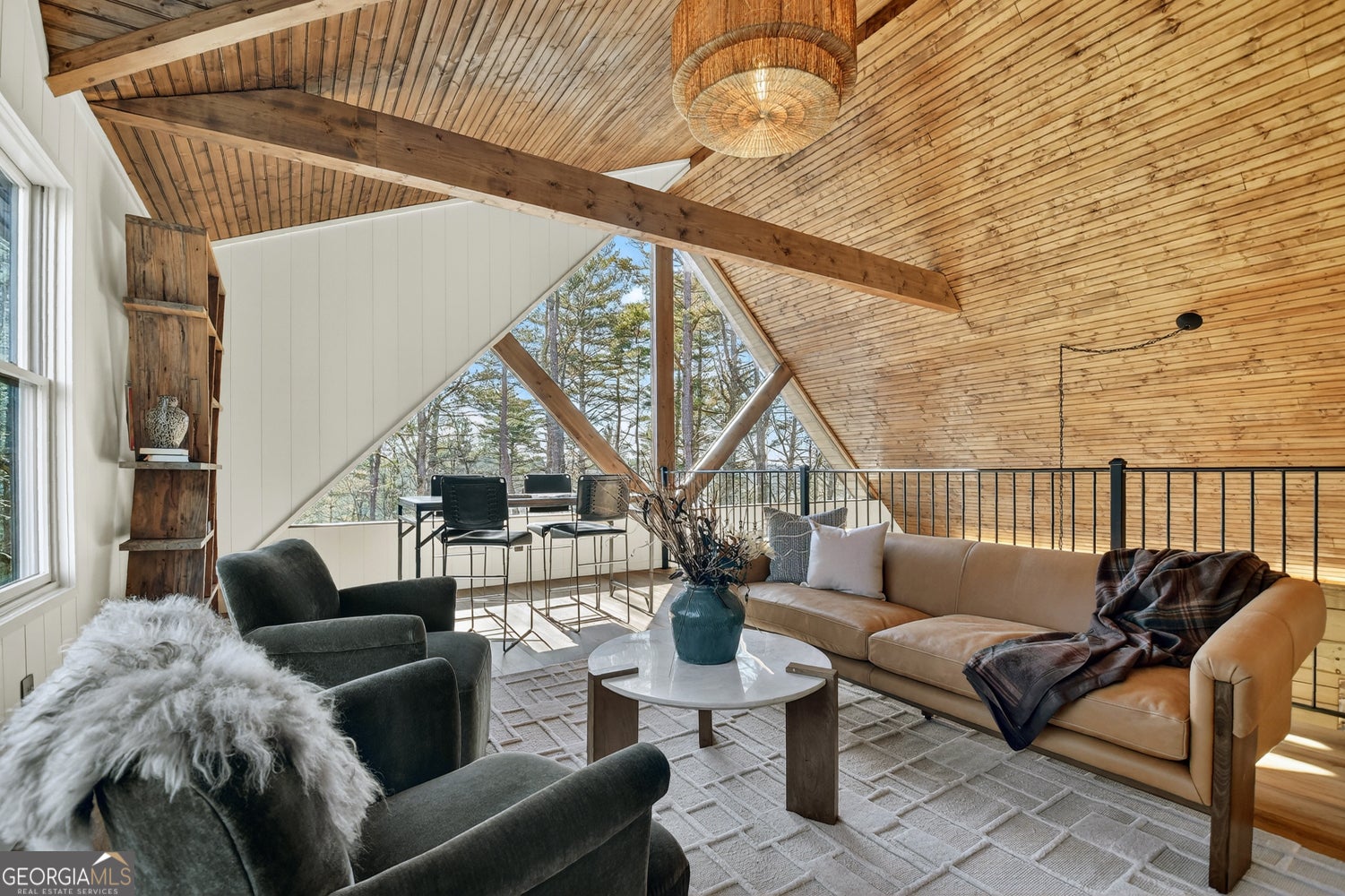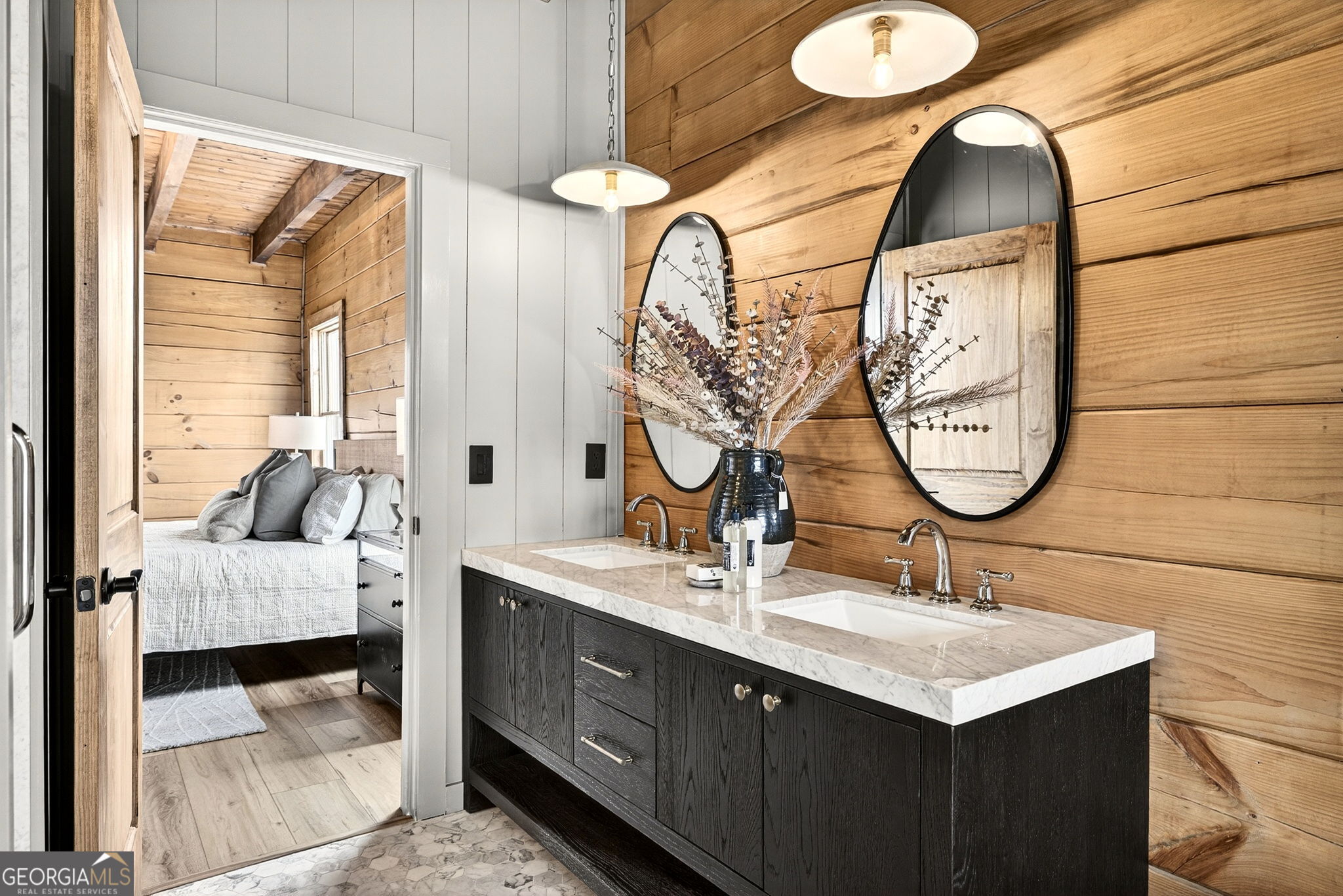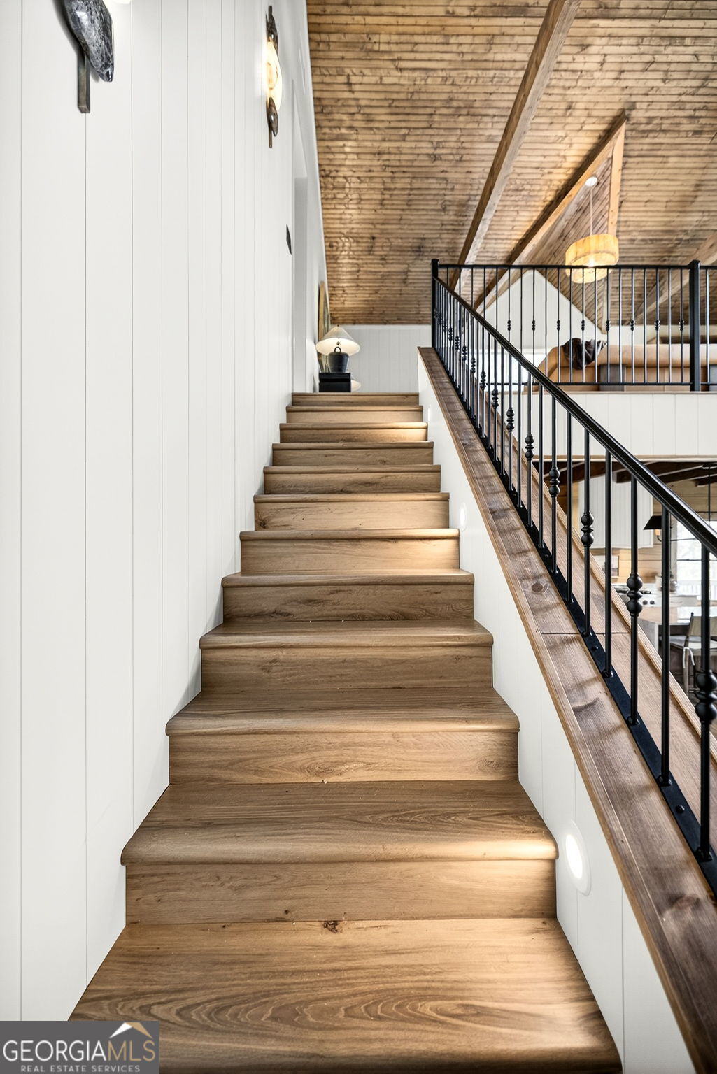 Tucked away in the heart of the mountains, this LUXURY MOUNTAIN RETREAT features authentic true log construction, offering a rare blend of natural beauty and refined craftsmanship on 2.46 acres. Wake each morning to year-round MOUNTAIN & CREEK VIEWS & enjoy the soothing sights & sounds of Mountaintown Creek flowing below, w/ 111 feet of creek frontage. Professionally decorated & selling FURNISHED w/ a curated collection, each piece has been intentionally selected to enhance the home's character & create a warm, cohesive living experience-balancing rustic charm w/ modern luxury. The open-concept great room features vaulted beamed ceilings, shiplap accents, & a modern electric fireplace w/ a porcelain tile feature wall, while the chef's kitchen showcases exposed beams, a marble waterfall island, copper farmhouse sink, 36" stainless gas range, & designer tile backsplash.The main-level primary suite offers dual walk-in closets, a spa-like ensuite w/ marble tile & a double vanity, along with a mudroom, pantry & laundry on the main level. Upstairs includes an oversized LOFT w/ a custom iron railing & mountain & creek views, two additional bedrooms (one w/ a private covered porch), & a full bath. The finished terrace level is built for entertaining, featuring a wet bar w/ wine cooler, gas-log stone fireplace, full spa-like bath, & flexible bonus room ideal for extra sleeping/bunk room, home office, or gym. Outdoor living shines w/ a wrap-around main-level deck, generous patio w/ fire-pit area & professionally landscaped grounds. Enjoy peace of mind w/ a full-house generator & the assurance the home is not located in a flood plain. Located in a small private gated community just 10 minutes from Downtown Ellijay, this property features all-paved access, no steep drives, plentiful parking, & allows short-term rentals. This property is ideal as a full-time residence, second home, or investment property. (An additional adjacent 2.37-acre lot is also available for purchase.)