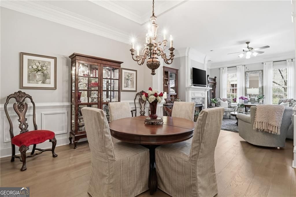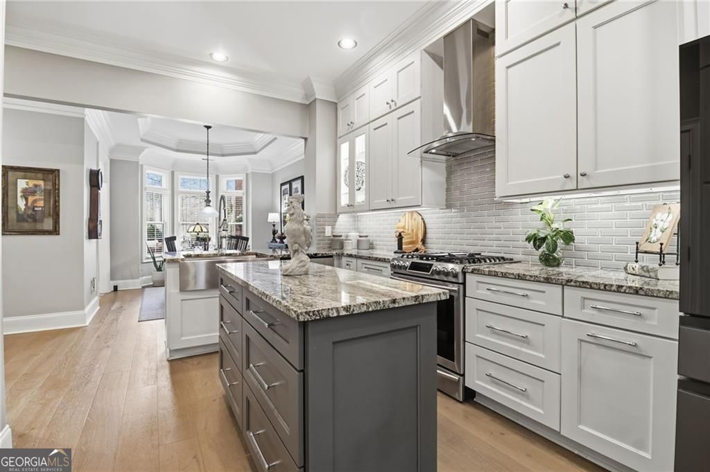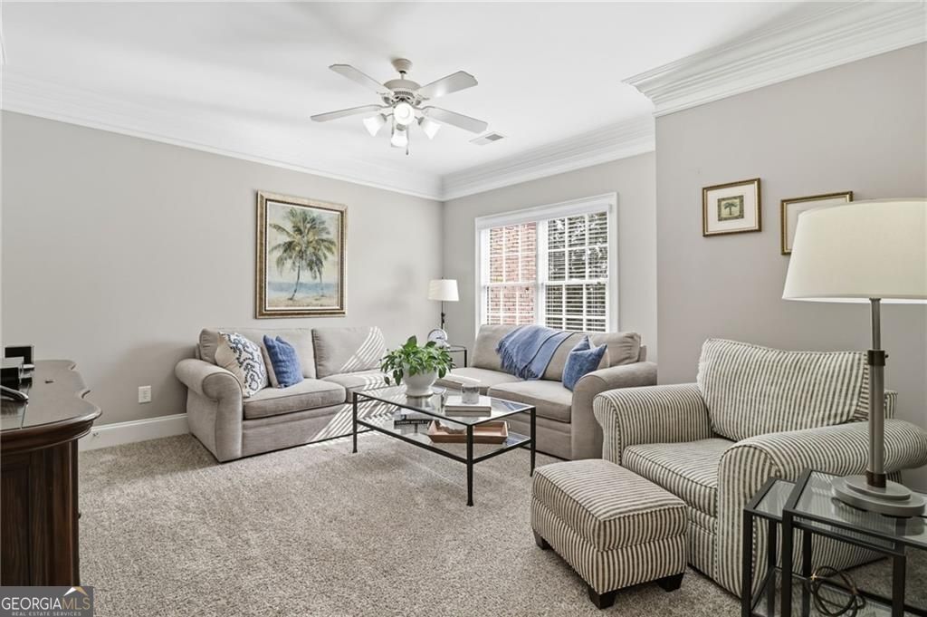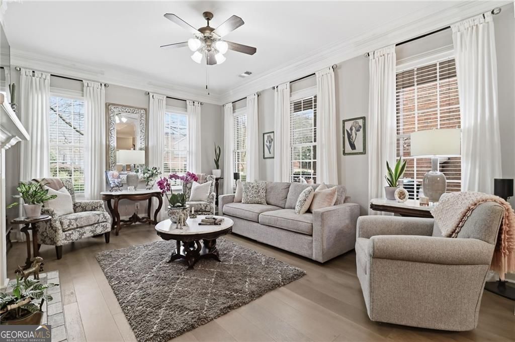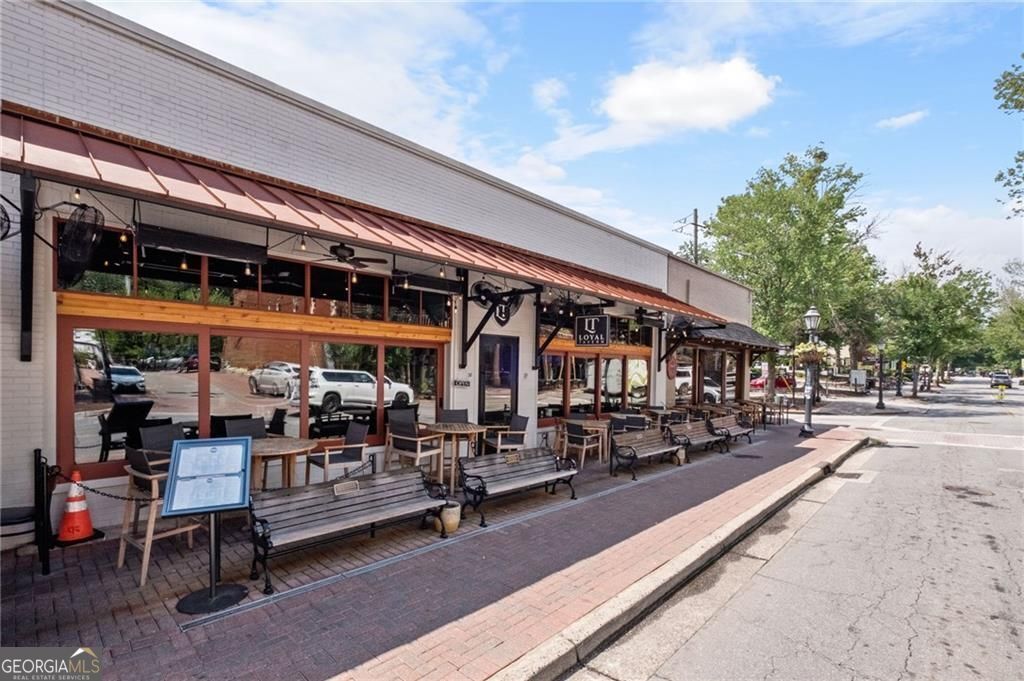 Showstopping custom kitchen * 10 ft ceilings + hardwoods * Rich crown molding * Gas fireplace * Primary suite with sitting room + covered balcony * 2-car garage * All-brick former model townhome in a gated Roswell community. Featuring 3 spacious bedrooms, 2 full baths and 1 half bath, this home delivers quality craftsmanship throughout, including 10-foot ceilings on the main, gorgeous crown molding, and transom foyer windows. The open dining-to-family room plan is anchored by a gas fireplace and flows to the renovated granite kitchen with custom cabinetry, abundant storage, a gas range, and a movable island. The laundry room adds even more storage with doors that conceal the washer and dryer, and it doubles nicely as a mud room. Upstairs, the oversized primary suite includes vaulted ceilings, a separate sitting room, a custom closet, and a private covered balcony. Two additional bedrooms are generously sized with great closet space, plus extra storage throughout. Enjoy the front stone patio with ornamental metal railing, along with a small, level yard. A rear-entry attached 2-car garage on the kitchen level adds everyday convenience and additional storage. Only 1.4 miles to Canton Street restaurants and shops. HOA covers exterior/structure and landscaping for easy, low maintenance living.