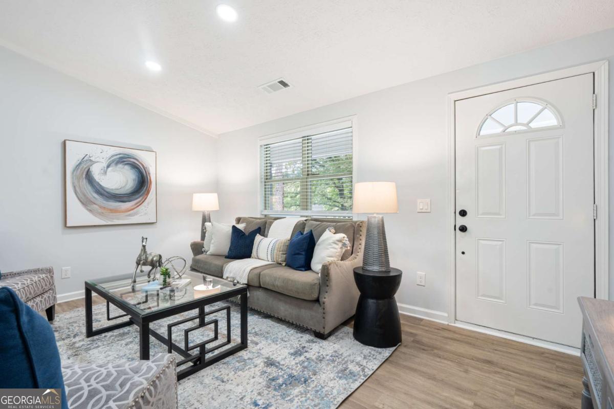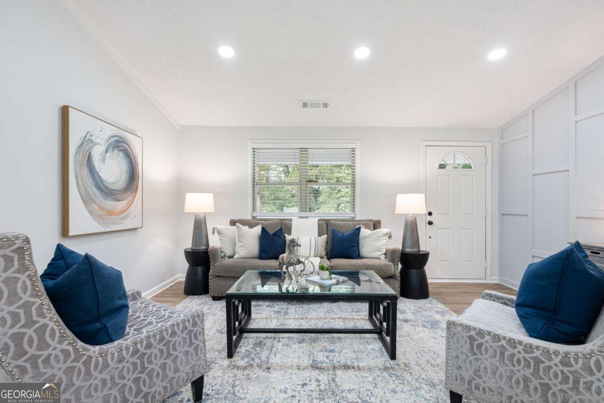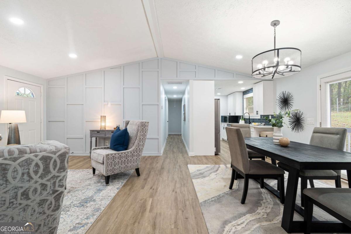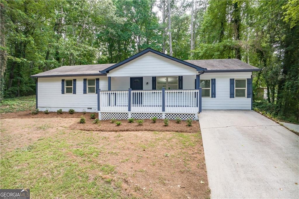 Feel right at home in this renovated modern ranch! This cozy move-in ready 4-bedroom, 2-bath home has been thoughtfully restored. You'll find luxury vinyl plank flooring throughout, fresh interior paint, and an open-concept family room with a stylish accent wall and adjoining dining area-designed perfectly for both family time and relaxing. The new kitchen features stainless steel appliances, quartz countertops, white cabinetry, and a large pantry. Retreat to the primary suite with its beautifully renovated en-suite bath, while the additional bathroom shines with modern tile finishes. Additional notable upgrades are a brand-new water heater, newer roof and AC unit, updated plumbing, HardiePlank siding, new windows, exterior paint and upgraded electrical panels, all within a home that has been lovingly maintained. A separate laundry room adds practicality. Tucked away at the end of a quiet street, this home offers privacy. Set on nearly half an acre, you'll enjoy the spacious front and backyard, a newly renovated deck, and a covered front porch. No HOA. Prime location and only a few miles to historic downtown Douglasville's Main Street with restaurants and shopping, Sweetwater Creek State Park, GreyStone Amphitheater and Douglasville Town Green.