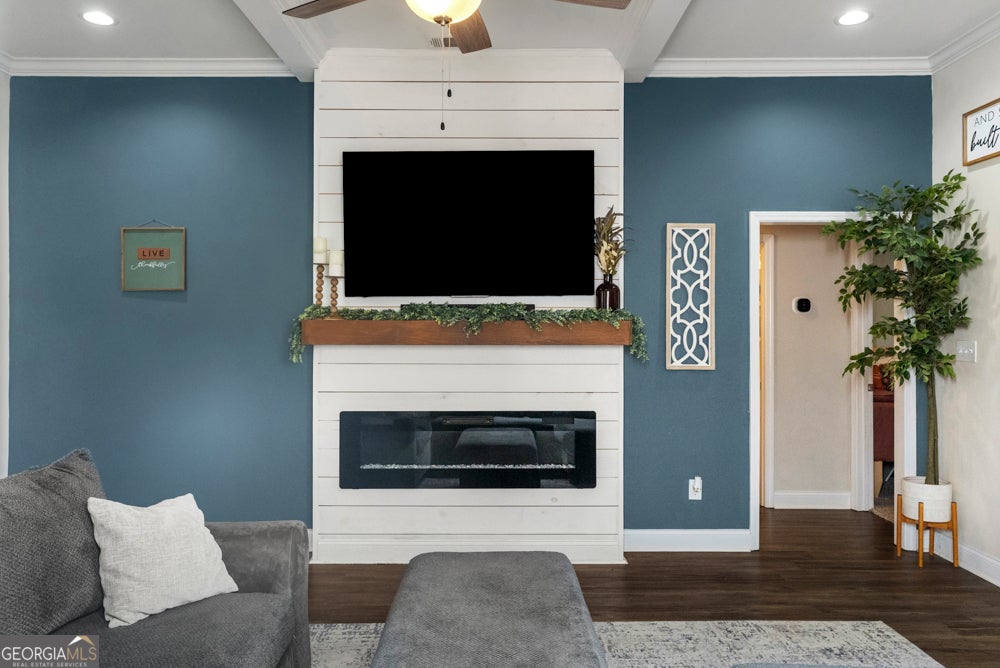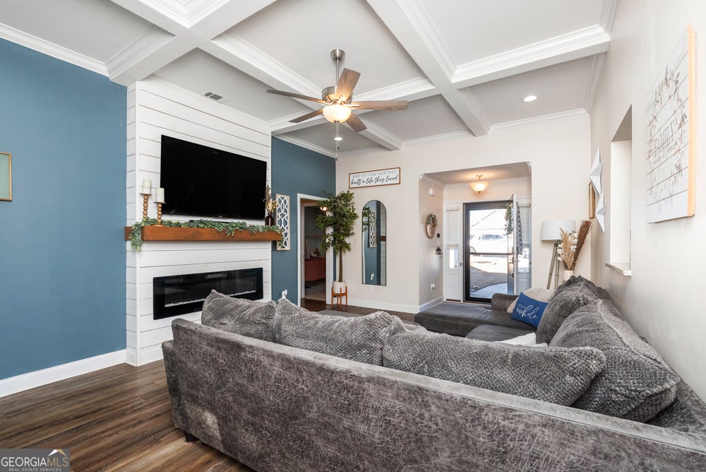 Welcome to this beautifully maintained 4 bedroom, 2 bathroom home located in a highly desirable neighborhood within a sought-after school district. Offering the perfect blend of comfort, functionality, and charm, this home is move-in ready and ideal for families, first-time buyers, or anyone looking for spacious single-level living. Step inside to an inviting open floor plan featuring a spacious living room highlighted by elegant coffered ceilings, abundant natural light, and a cozy fireplace with decorative accent wall. The living area flows seamlessly into the dining space and kitchen, creating the perfect layout for both everyday living and entertaining guests. The kitchen provides ample cabinetry, generous counter space, and modern appliances, along with convenient access to the dining area. Just off the main living area, the split-bedroom design offers privacy for the primary suite, complete with a private bath and walk-in closet. Three additional bedrooms offer flexibility for guest rooms, a home office, or hobby space. Enjoy outdoor living in the backyard retreat featuring a patio and firepit seating area - perfect for relaxing evenings, entertaining friends, or weekend gatherings. The home also includes a two-car garage and a welcoming curb appeal with covered entry. Conveniently located near shopping, dining, and Robins Air Force Base, this home combines location, space, and comfort all in one.