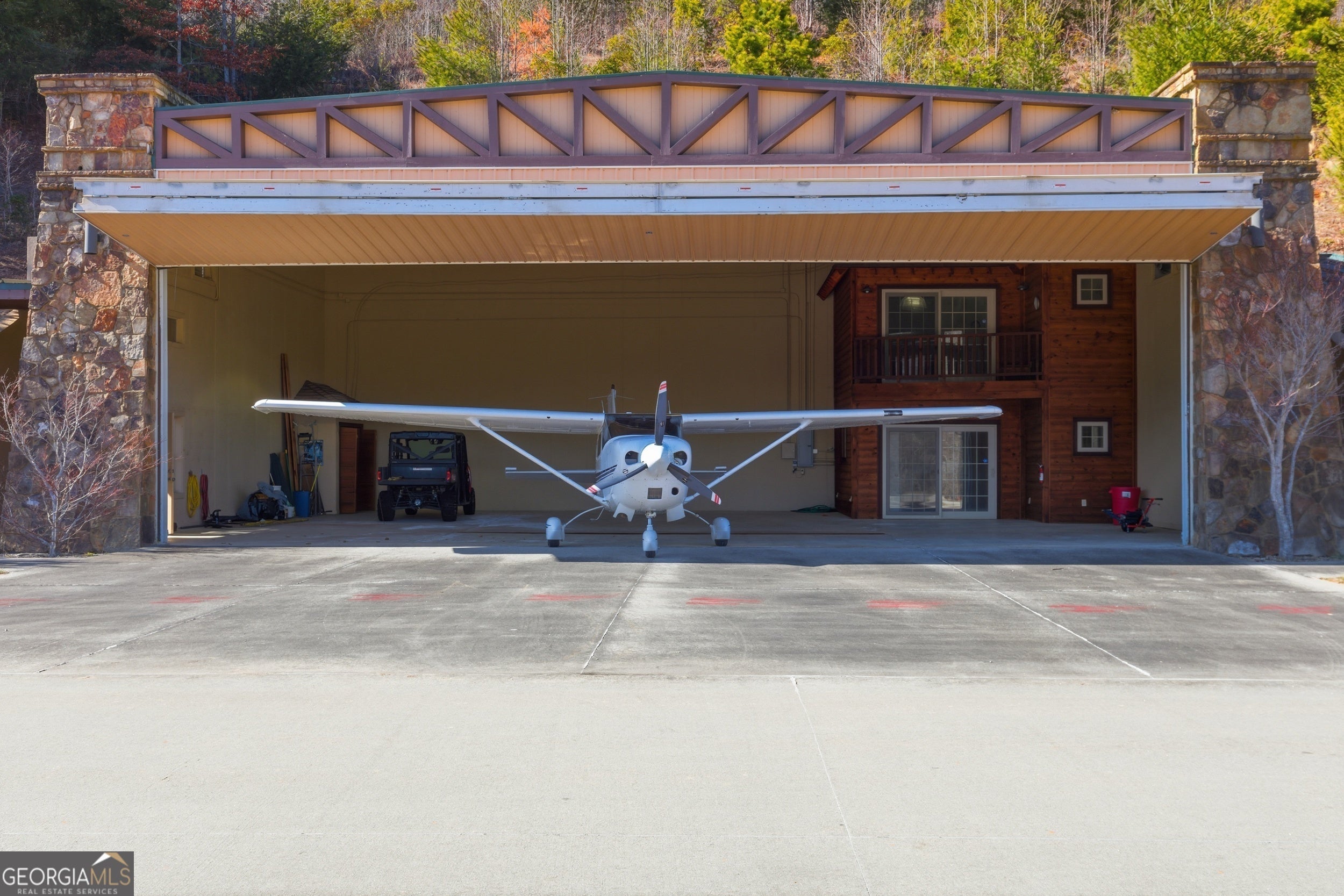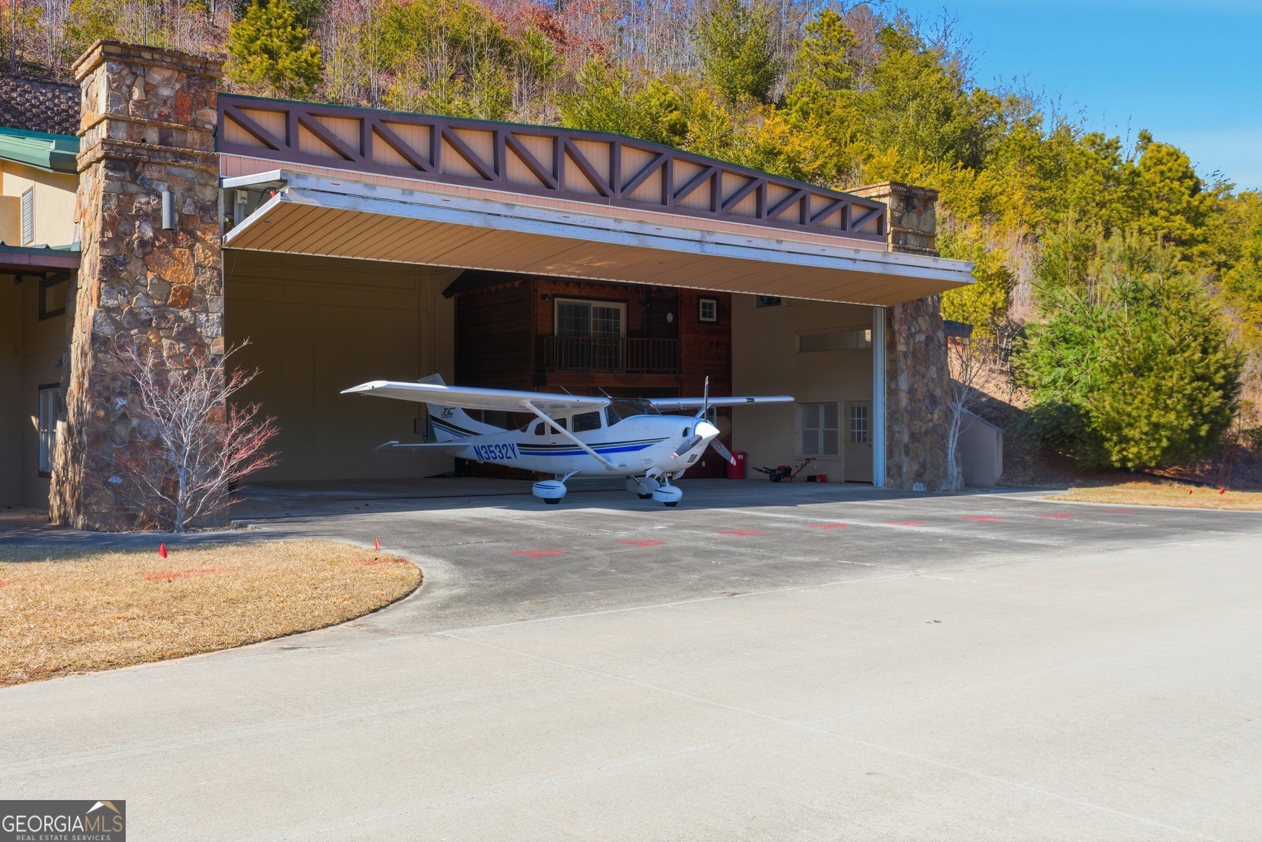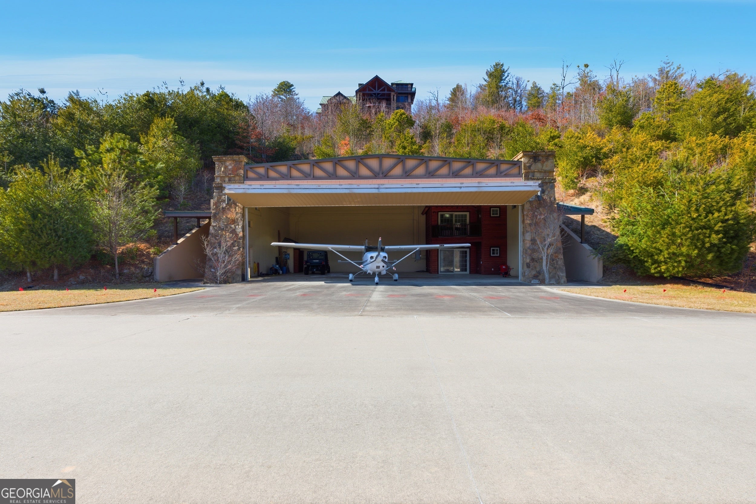 Sky-High Luxury at Heaven's Landing | Premier Fly-In Estate Experience the pinnacle of aviation living in the North Georgia Mountains. Situated in the prestigious Heaven's Landing community, this estate offers a rare combination of direct taxiway access and breathtaking panoramic mountain views. The Ultimate Pilot's Setup - For the aviation enthusiast, the property features a separate 50x60 custom hangar fronting the taxiway. More than just storage, it includes a dedicated pilot's retreat complete with a kitchen and bath-perfect for post-flight relaxation or hosting fellow aviators. Architectural Masterpiece -Accessed via a private cul-de-sac, this 5,700 sq. ft. residence is a study in rustic elegance. The interior is defined by massive beams and exquisite heart pine finishes. A three-stop elevator ensures effortless access across all levels. - Main Level: A soaring vaulted great room anchored by a massive stone fireplace and a rounded window bay. The chef's kitchen with a center island flows into a formal dining room and a dedicated office/flex space. The primary suite features a private balcony and a spa-like bath. - Terrace Level: Designed for entertaining, this floor boasts a large family room with its own fireplace and wet bar, opening to a stone-floored porch. Includes three bedrooms, 2.5 baths, and a second laundry facility. - The Upper Tiers: The third level offers a versatile bedroom with a half bath, while the crowning jewel is the enclosed "crow's nest" with a three-sided deck, offering unrivaled views of the runway and the Blue Ridge Mountains. Property Highlights - Exterior: Standing seam metal roof and expansive covered porches. - Upgrades: New HVAC systems have been ordered for the home. - Outdoor Living: Large elevated porches designed to capture the mountain breeze and runway activity. Location & Lifestyle Located in Rabun County, you are surrounded by over 60% National Forest land, four pristine lakes, and the Wild and Scenic Chattooga River. Enjoy the peace of the mountains with the convenience of Clayton just 4 miles away, famous for its award-winning dining and boutique shopping. The concrete airstrip is 5068 feet long. FAA Identifier is GE99.