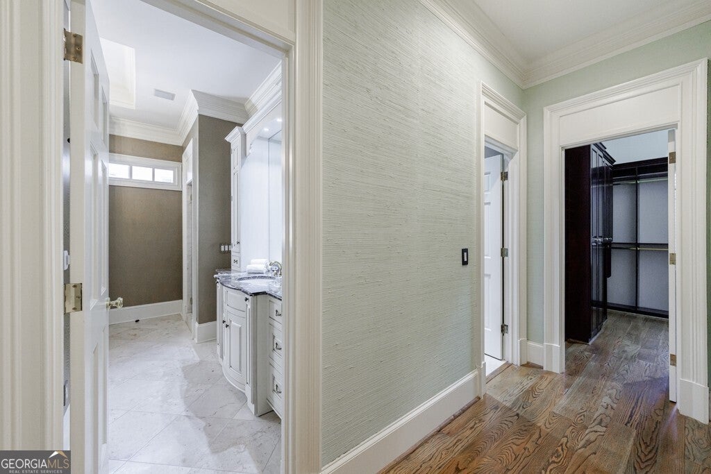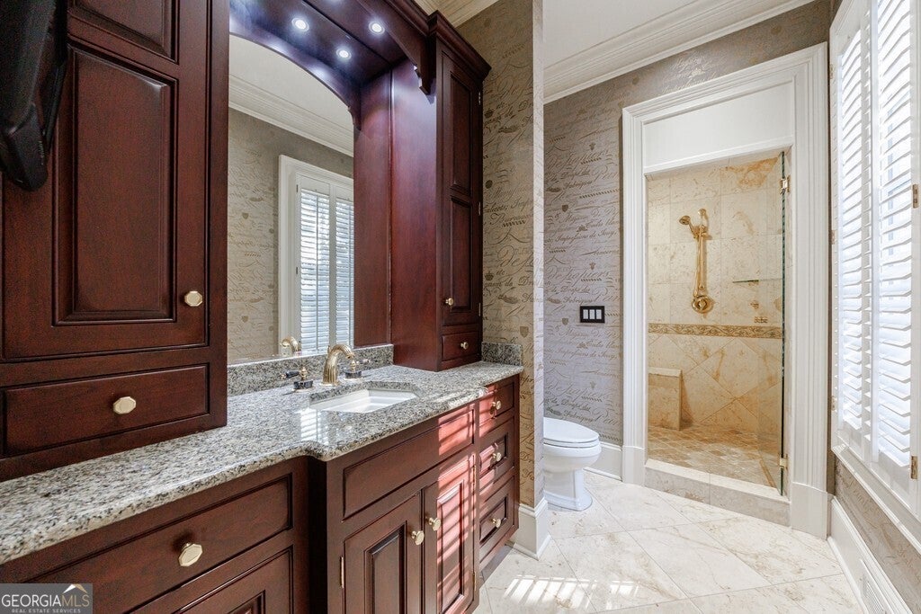 Magnificent stone estate offering timeless European elegance and exceptional walkability. This beautifully refreshed residence features five bedrooms, six full baths, two half baths, and five fireplaces, with newly painted interiors and a stunning white chef's kitchen that opens seamlessly to expansive living and entertaining spaces. A dramatic marble foyer welcomes you into light-filled rooms with walls of windows, rich Brazilian walnut and cherry floors, custom cabinetry, and exquisite designer details throughout. The main-level owner's suite is a private retreat with sitting room, dual spa-inspired baths connected by a walk-through shower, heated floors, and generous custom closets. Resort-style outdoor living includes a PebbleTec pool and hot tub, outdoor fireplace, kitchen, and beautifully landscaped grounds with private walking trails now extending both north and south of the home, connecting to the newly opened 400 Trail. Enjoy a true European lifestyle - stroll to dinner, shopping, fitness, schools, and entertainment, then walk home to your private sanctuary.
