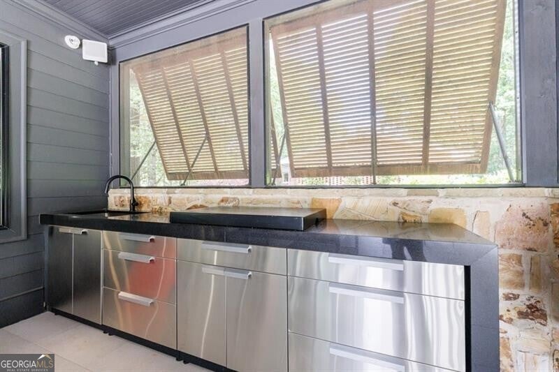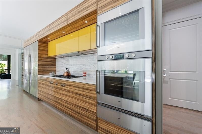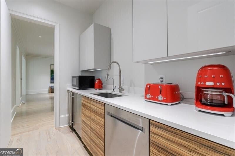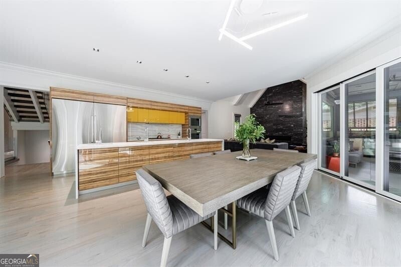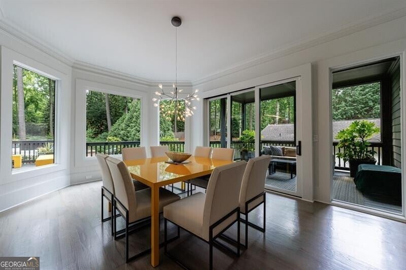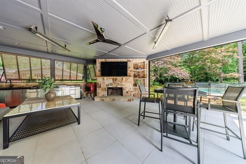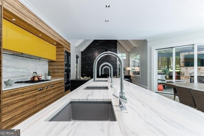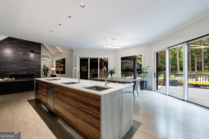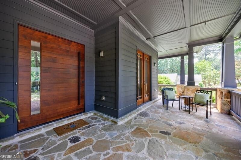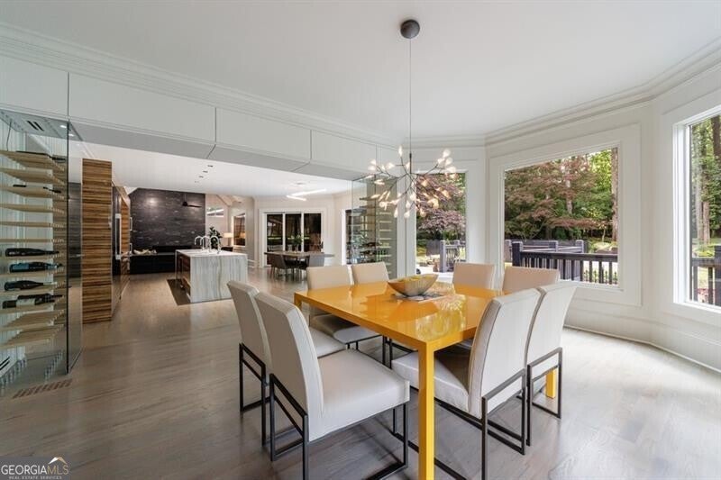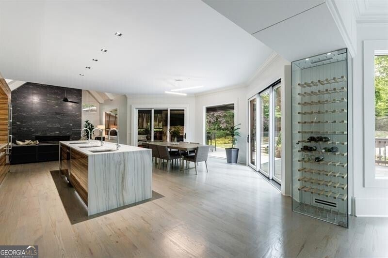 This incredible jewel box in Pine Hills was thoughtfully redesigned by renowned architect Jeffrey Bruce Baker. The extraordinary interior modern renovation has left no detail untouched. Large front porch leads to a custom wood pivot door. Light filled entry leads to living room with fireplace, private study and guest bedroom with full bath. The back of the house is breathtaking and unmatched with sunny dining room, two wine cellars with climate control, perfectly situated between the dining room and kitchen for entertaining. The kitchen is truly one-of-a-kind with a sleek waterfall island of Antolini's Bianco Lasa Fantastico marble, custom zebra wood cabinetry, oversized refrigerator, 3 dishwashers and Gaggenau appliances. There is a separate prep kitchen with plenty of storage as well as a breakfast area in the kitchen that overlooks the backyard. Kitchen opens to the keeping room with dramatic stone fireplace. The transition between indoor and outdoor is seamless with sliding doors from the kitchen transitioning to the covered porch with grilling area, stone fireplace and plenty of room for seating. Stunning custom staircase leads to 4 bedrooms and 3 full baths including oversized primary suite with gold leaf accent wall. Luxurious spa-like bathroom with dual vanities, separate tub and shower. The closet is state-of-the-art with glass cabinetry and large island fitted with a backlit onyx top. The terrace level is finished and has all the amenities including built in bar, media room, living room, bedroom, full bath, bonus room and separate pool shower. The backyard is truly special with manicured grounds, pool, level yard with mature landscaping. Truly a special home is a quiet neighborhood minutes away from all that Buckhead has to offer.