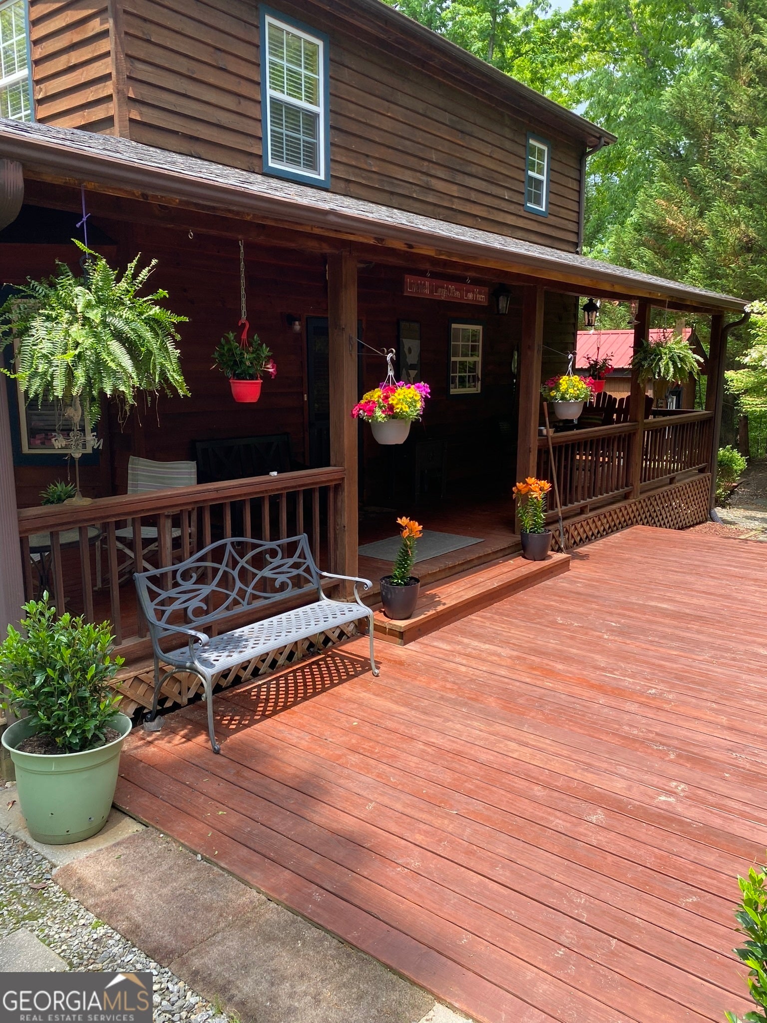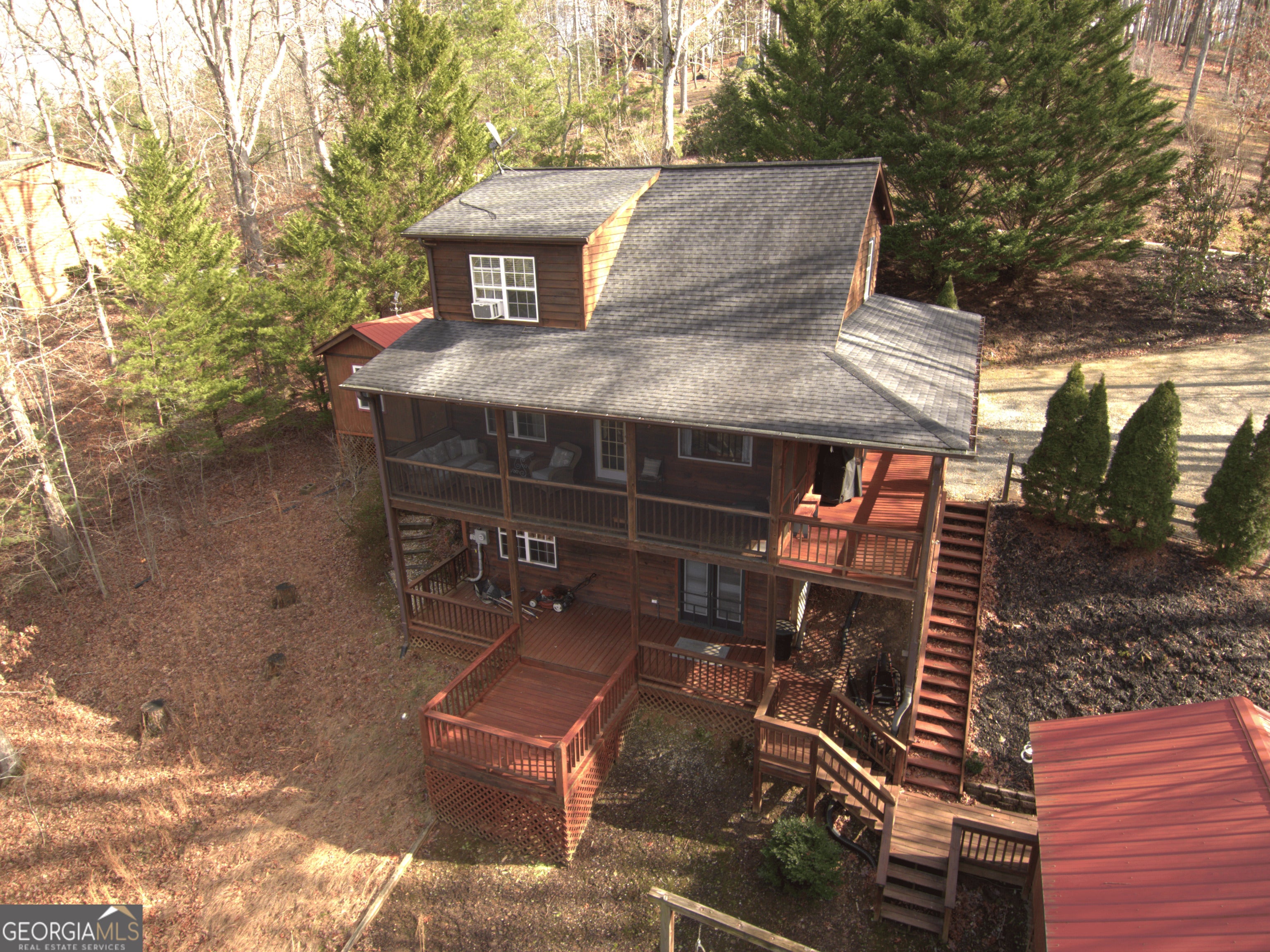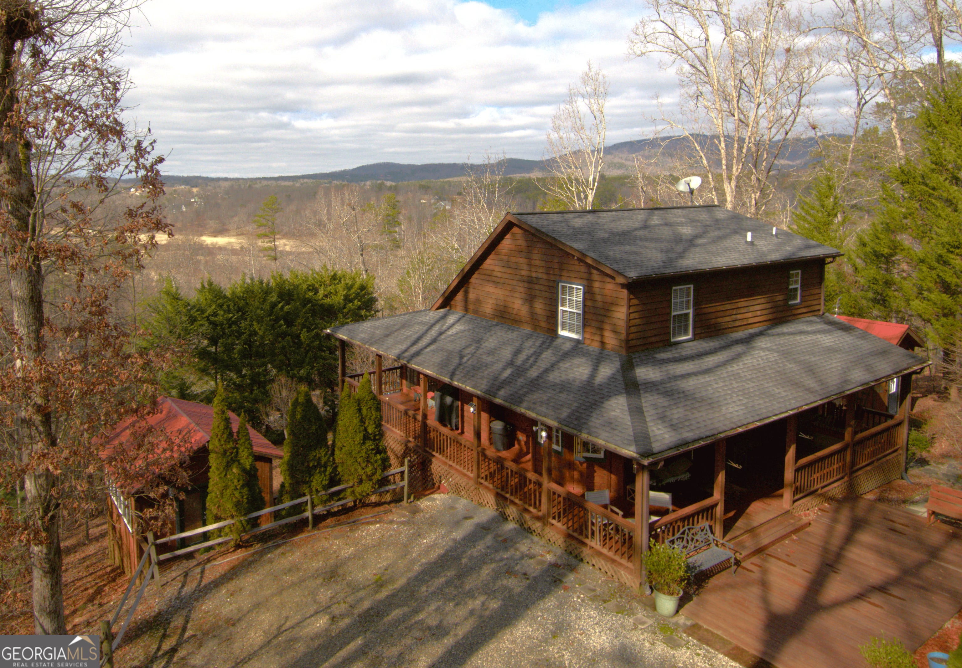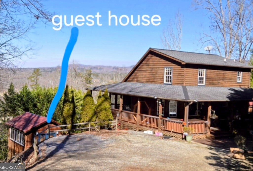 NEW Stainless Steel Appliances and Live Edge Counters and Handcrafted Island (2025). Mountain Views including close up, long range mountain and Golf Course Views. Exceptional privacy, and beautifully updated living spaces. Recently remodeled, the home features a fully redesigned kitchen including a handcrafted island with pull outs, live edge countertops, and new stainless steel appliances. The great room showcases vaulted ceilings, a gas log fireplace, and stunning layered mountain vistas, flowing seamlessly onto a spacious screened porch ideal for relaxing or entertaining. The main level also includes a comfortable bedroom with a walk-in closet and a full bath with shower. The upper level offers a light filled primary suite with a walk-in closet and full bath, along with a newly enclosed loft that would make a great bonus room, office, 4th bedroom, or additional living space. The fully finished lower level includes a bedroom with a newly remodeled ensuite bath featuring an added shower and vanity, plus a laundry area and storage. There is also a second living room with a kitchenette. Outdoor living is equally impressive, with an expansive deck, hot tub, and a separate guest house equipped with heat/air, a wall mounted television, and a kitchenette. It could also be a great game room, artist studio or man cave. The beautifully landscaped grounds include a potting shed/workshop and ample space to enjoy the peaceful surroundings. This well maintained property is a rare opportunity to experience luxury mountain living with comfort, privacy, and exceptional amenities. Arrange your showing today!
