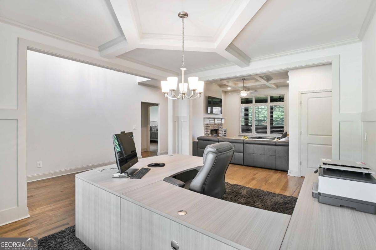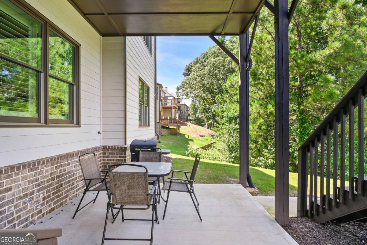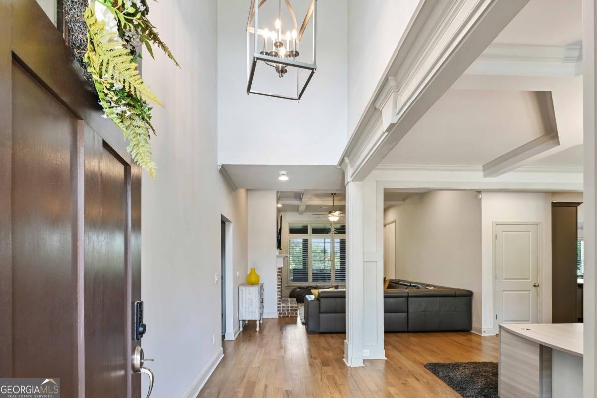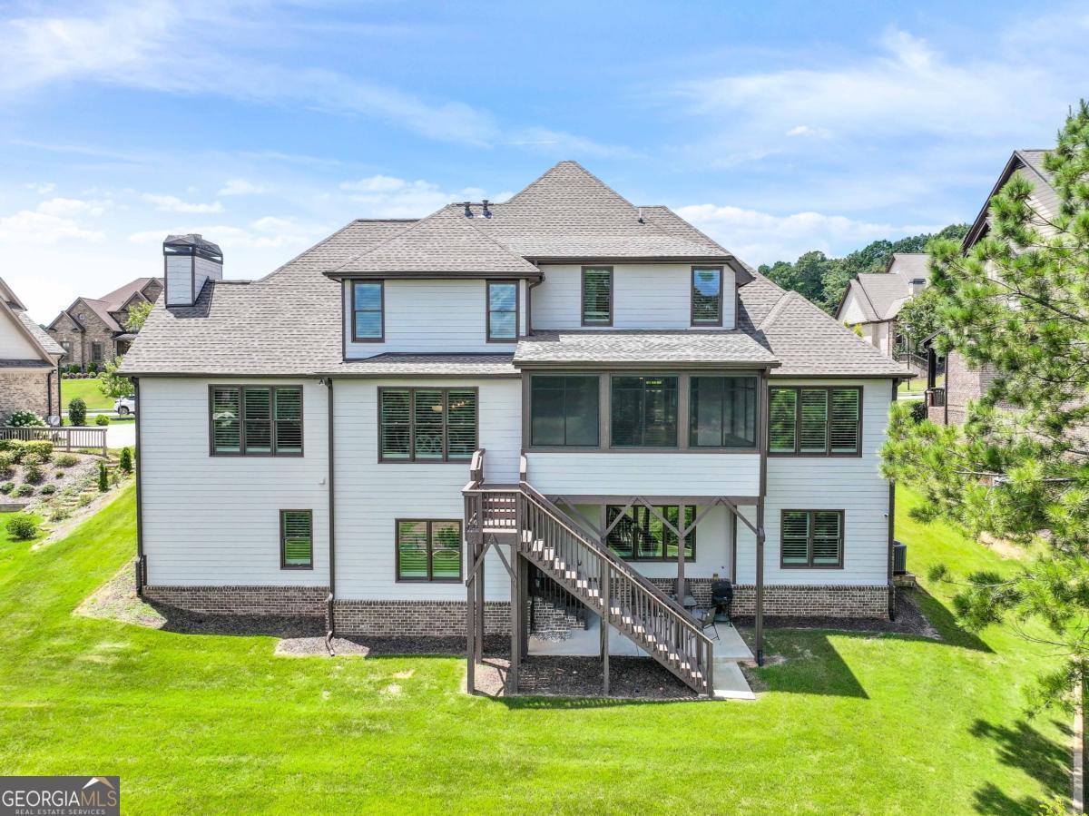 Discover the pinnacle of luxury living in this magnificent 6,756 square foot, 7-bedroom, 7-bathroom smart home-the largest residence in the community. Every detail has been thoughtfully designed to blend timeless elegance with modern innovation, offering unparalleled space, comfort, and sophistication. Wrapped in stately three-sided brick, the home welcomes you with true, site-finished hardwood floors that span the entire main and upper levels-offering timeless beauty, durability, and craftsmanship that set this home apart. These exceptional floors are complemented by custom basswood interior shutters, adding an additional layer of warmth and sophistication to every room. The main-level primary suite is a luxurious retreat, featuring a freestanding soaking tub, spa-style tiled shower with a built-in bench, and dual vanities that combine beauty with practicality. At the heart of the home lies a chef's dream kitchen, complete with a show stopping 14-foot island, soft-close cabinetry, farmhouse sink, double ovens, gas cooktop, and gleaming granite countertops. Adjacent to the kitchen is a vaulted keeping room with a cozy fireplace, while the formal dining room boasts an elegant coffered ceiling. The living room is equally impressive, with a second fireplace and stunning coffered ceilings, creating a perfect blend of grandeur and comfort. Music lovers will especially enjoy the in-ceiling speaker system located throughout the enclosed deck, providing the perfect soundtrack for year-round enjoyment in the Eze-Breeze screened outdoor living space. Upstairs, you'll find three spacious bedrooms-each with its own private ensuite-and a versatile loft ideal for a home office, lounge, or study area. Built-in Wi-Fi access points on every level ensure lightning-fast connectivity for all your smart home needs. The daylight terrace level is a fully finished extension of the home, accessible from both the interior and exterior. This expansive space features a full kitchen with island, an open-concept living and dining area, a private primary suite with an ensuite tiled shower, an additional guest bedroom with a neighboring bath, and luxury vinyl plank flooring throughout. An additional 728 square feet of unfinished space offers endless possibilities for a home gym, studio, or storage. A covered patio completes the lower level, perfect for outdoor entertaining or peaceful retreat. Additional premium features include a spacious three-car garage equipped with overhead storage and custom shelving. The main-level laundry room features cabinetry and a utility sink, while a second laundry area is conveniently located in the basement. A well-appointed guest suite on the main floor, with an adjacent full bathroom, makes this home ideal for visitors or multi-generational living. Smart home features are integrated throughout, delivering seamless control and efficiency. This exceptional estate offers unmatched space, elegance, and thoughtful design-an extraordinary opportunity to own the crown jewel of the community.