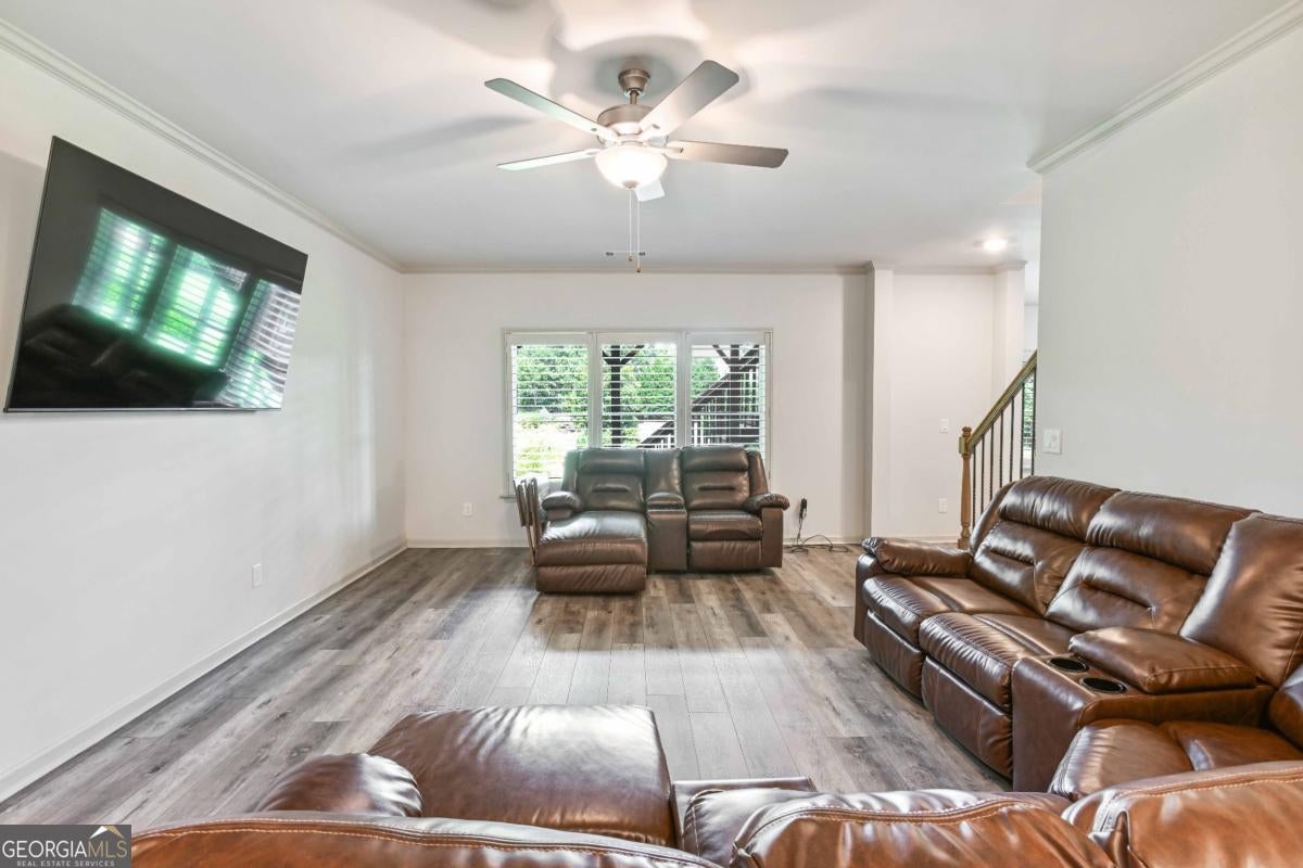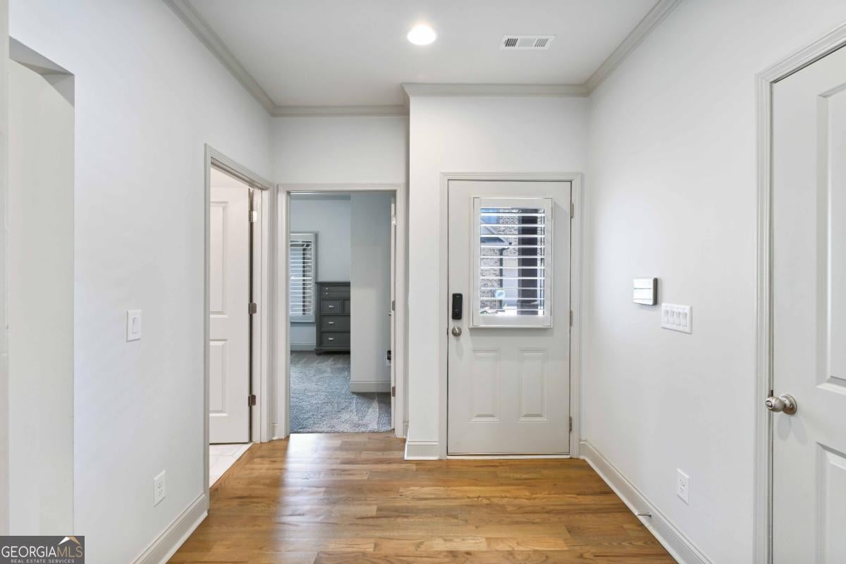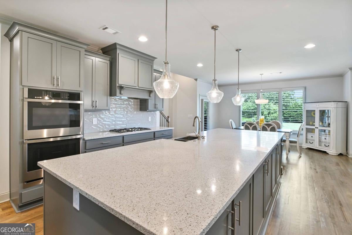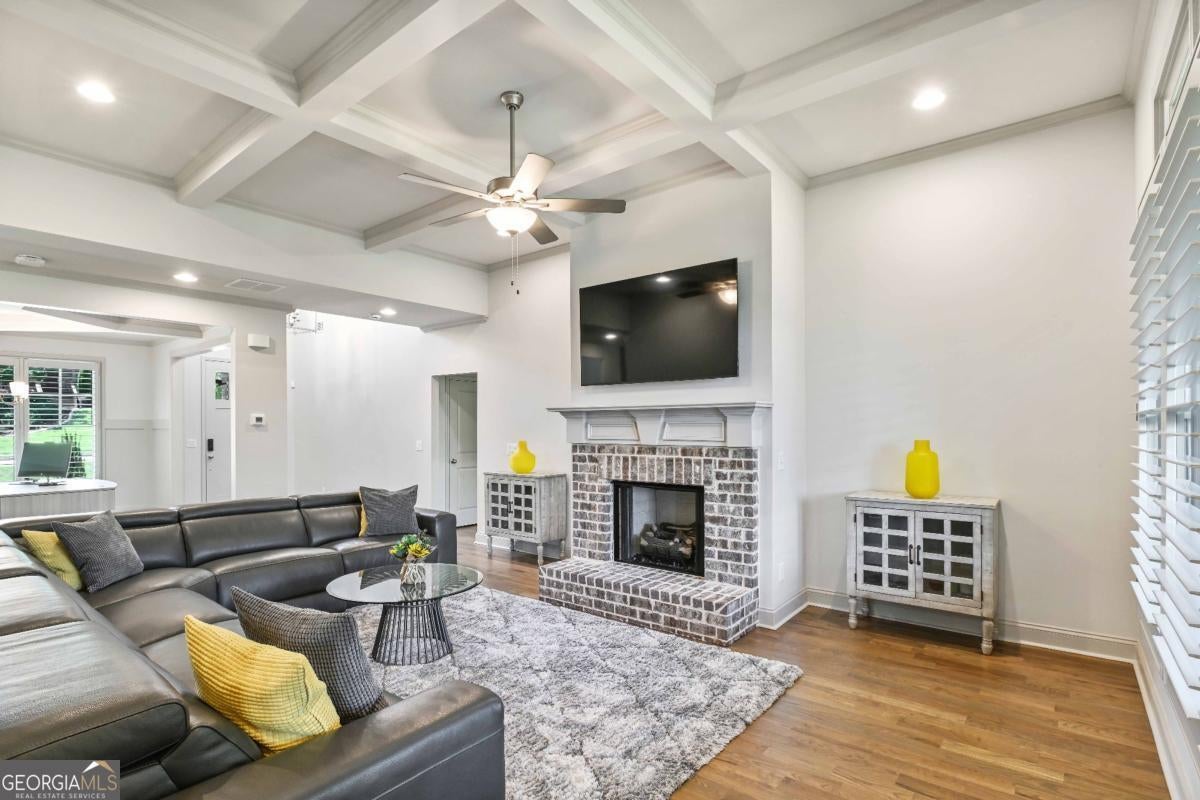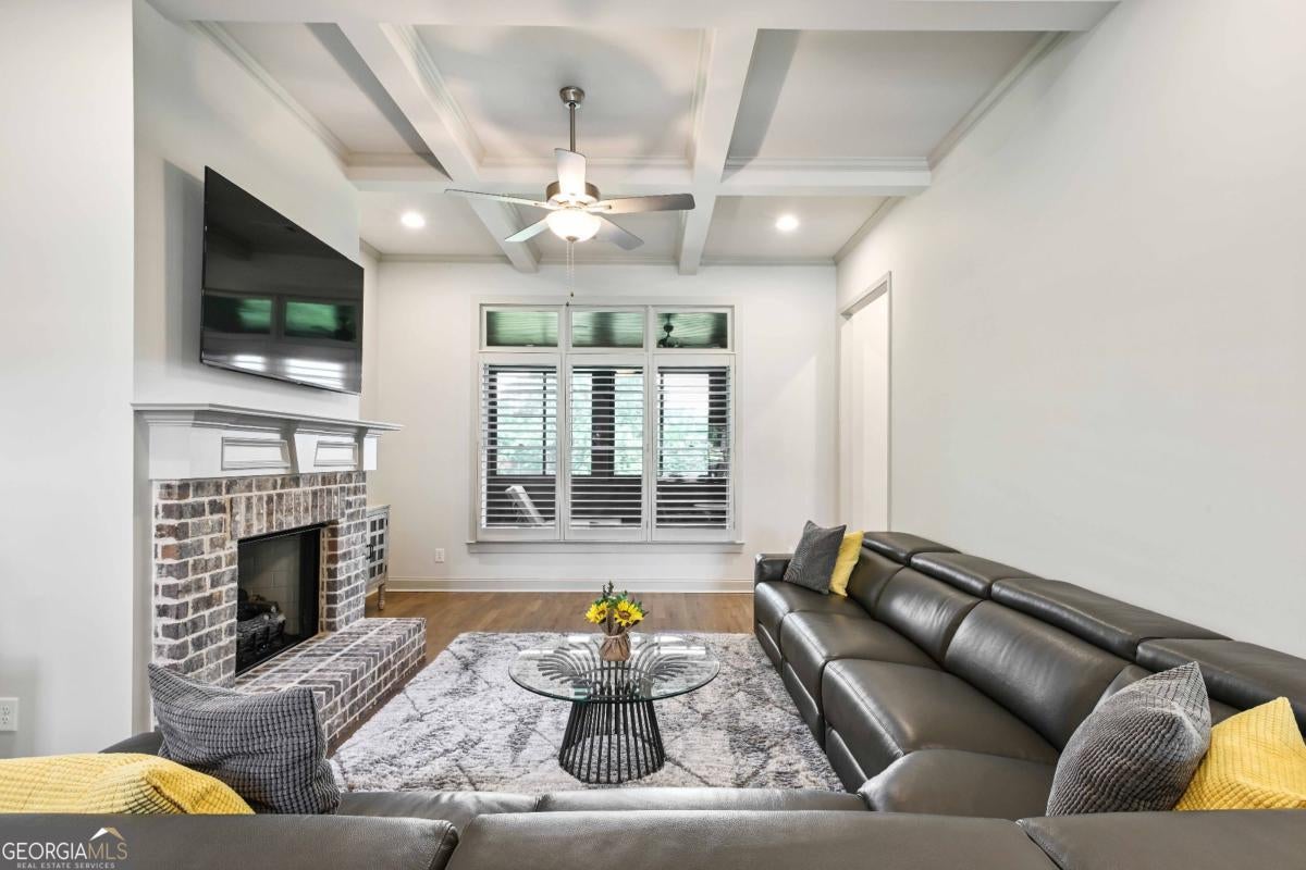 Discover the pinnacle of luxury living in this magnificent 6,756 square foot, 7-bedroom, 7-bathroom smart home-the largest residence in the community. Every detail has been thoughtfully designed to blend timeless elegance with modern innovation, offering unparalleled space, comfort, and sophistication. Wrapped in stately three-sided brick, the home welcomes you with true, site-finished hardwood floors that span the entire main and upper levels-offering timeless beauty, durability, and craftsmanship that set this home apart. These exceptional floors are complemented by custom basswood interior shutters, adding an additional layer of warmth and sophistication to every room. The main-level primary suite is a luxurious retreat, featuring a freestanding soaking tub, spa-style tiled shower with a built-in bench, and dual vanities that combine beauty with practicality. At the heart of the home lies a chef's dream kitchen, complete with a show stopping 14-foot island, soft-close cabinetry, farmhouse sink, double ovens, gas cooktop, and gleaming granite countertops. Adjacent to the kitchen is a vaulted keeping room with a cozy fireplace, while the formal dining room boasts an elegant coffered ceiling. The living room is equally impressive, with a second fireplace and stunning coffered ceilings, creating a perfect blend of grandeur and comfort. Music lovers will especially enjoy the in-ceiling speaker system located throughout the enclosed deck, providing the perfect soundtrack for year-round enjoyment in the Eze-Breeze screened outdoor living space. Upstairs, you'll find three spacious bedrooms-each with its own private ensuite-and a versatile loft ideal for a home office, lounge, or study area. Built-in Wi-Fi access points on every level ensure lightning-fast connectivity for all your smart home needs. The daylight terrace level is a fully finished extension of the home, accessible from both the interior and exterior. This expansive space features a full kitchen with island, an open-concept living and dining area, a private primary suite with an ensuite tiled shower, an additional guest bedroom with a neighboring bath, and luxury vinyl plank flooring throughout. An additional 728 square feet of unfinished space offers endless possibilities for a home gym, studio, or storage. A covered patio completes the lower level, perfect for outdoor entertaining or peaceful retreat. Additional premium features include a spacious three-car garage equipped with overhead storage and custom shelving. The main-level laundry room features cabinetry and a utility sink, while a second laundry area is conveniently located in the basement. A well-appointed guest suite on the main floor, with an adjacent full bathroom, makes this home ideal for visitors or multi-generational living. Smart home features are integrated throughout, delivering seamless control and efficiency. This exceptional estate offers unmatched space, elegance, and thoughtful design-an extraordinary opportunity to own the crown jewel of the community.