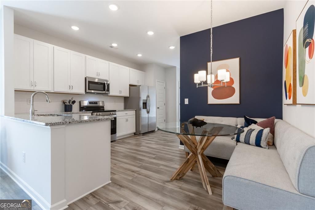 Move-In Ready May! The Ryman in The Andros community by Smith Douglas Homes. This home offers an efficient yet inviting cottage-style layout with a welcoming entry that immediately feels like home. At the heart of the home, a light-filled family room flows seamlessly into a beautifully appointed kitchen featuring granite countertops, upgraded cabinetry, tile backsplash, stainless steel appliances, and generous counter space perfect for both everyday living and entertaining. A stylish linear fireplace anchors the living room, while durable LVP flooring runs throughout the main living areas for both elegance and easy maintenance. Tucked privately at the rear of the home, the spacious primary suite boasts a tray ceiling and ensuite bath with a walkin closet, double bowl vanity, and a tiled walk-in shower. Two additional bedrooms and a full bath provide comfortable accommodations for family, guests, or a home office, while a conveniently located laundry room adds everyday functionality. Step outside to enjoy your morning coffee or evening relaxation on the covered patio overlooking the backyard. Ideally located just minutes from downtown Dalton, top-rated schools, popular restaurants, and local parks, with quick access to I-75 and only 30 minutes to Chattanooga-this home perfectly blends comfort, style, and convenience.