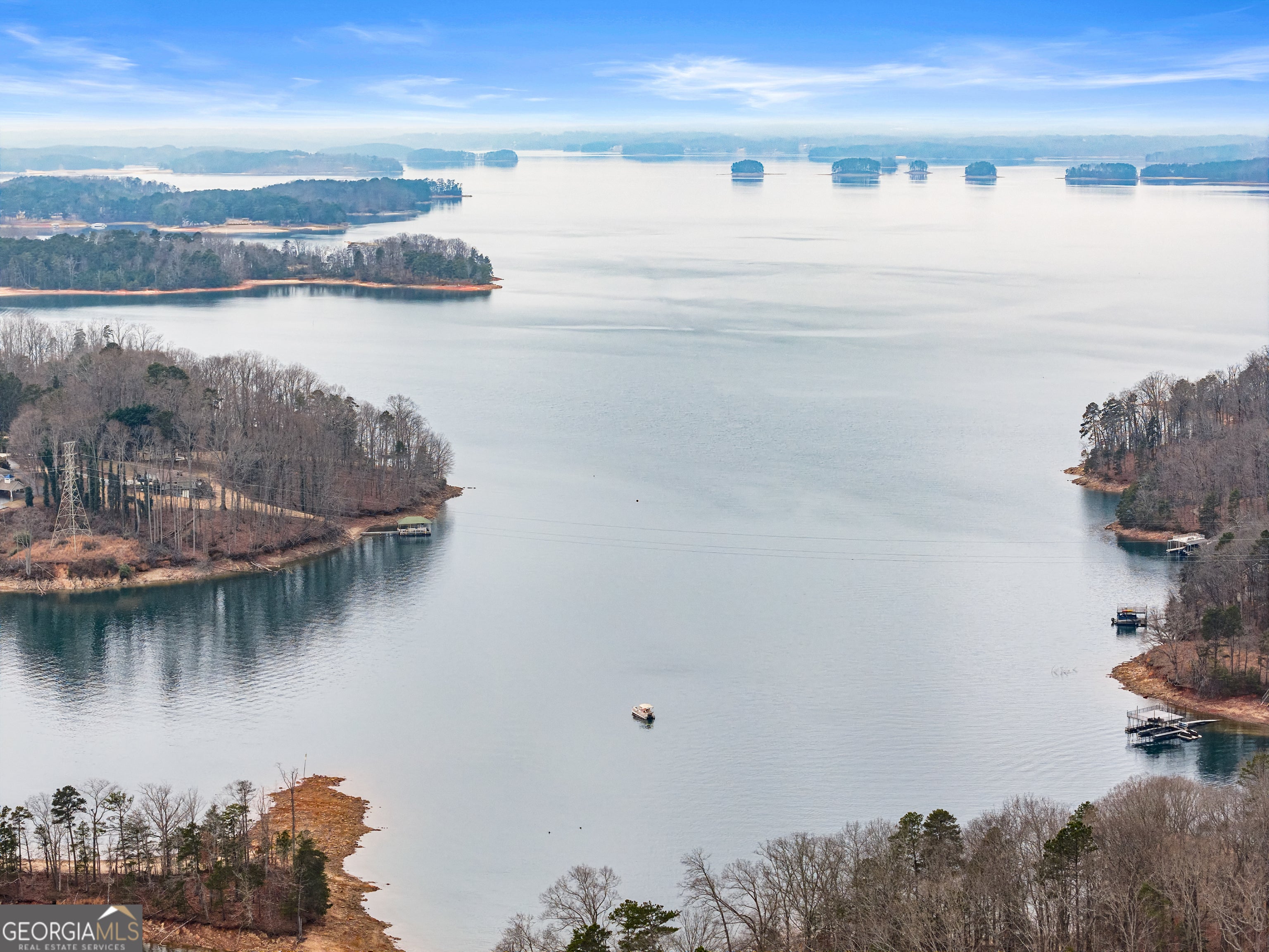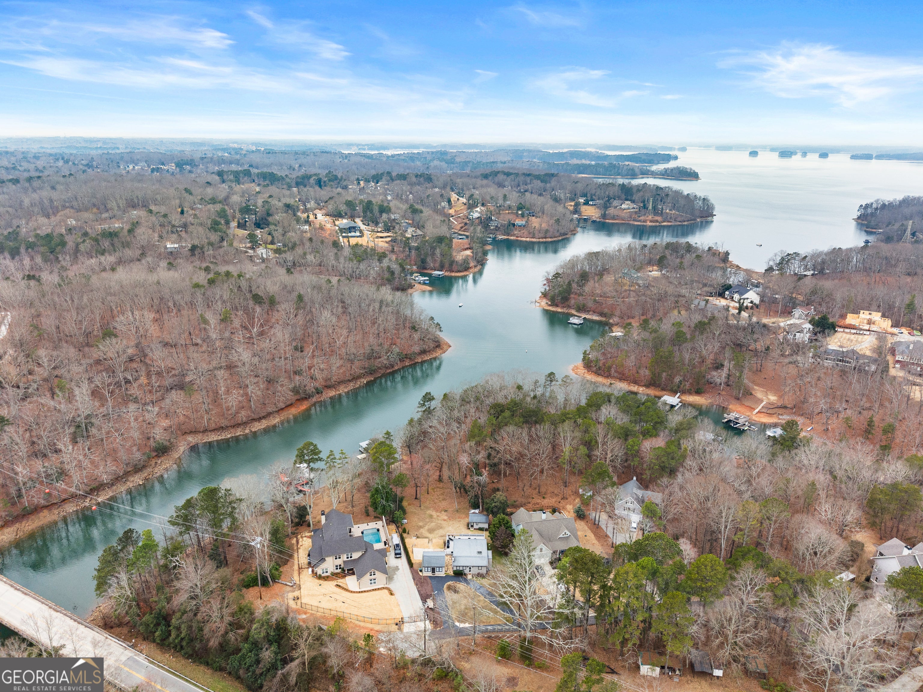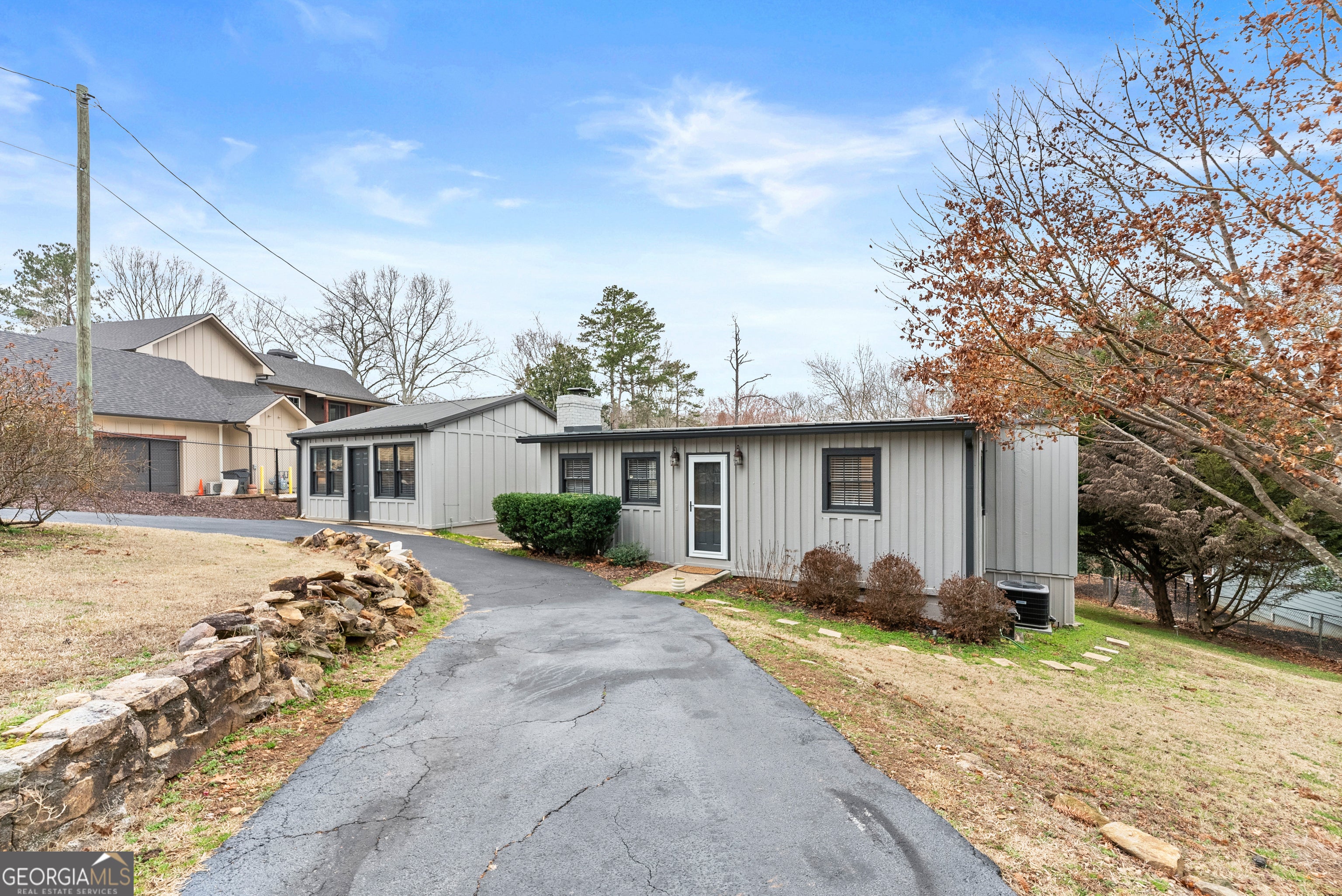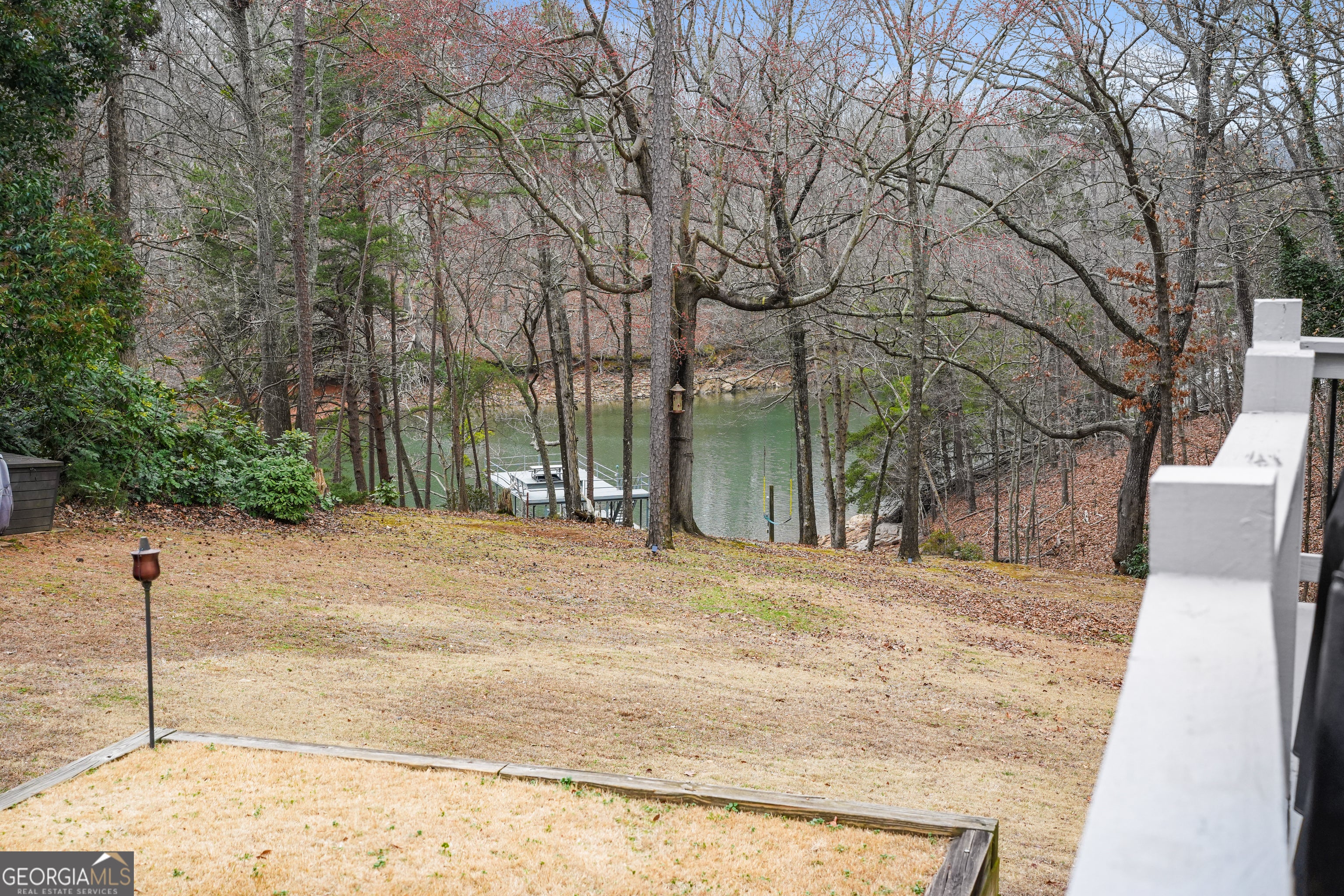 Charming lake cottage in a prime deep water location on the south end of Lake Lanier featuring a cleared, grassed backyard with big water views and year-round deep water. This private lot offers no HOA and is positioned in a no wake zone, helping protect your dock and shoreline while creating the perfect setting for floating, entertaining, and enjoying beautiful sunsets. Expansive entertaining decks overlook the water and provide ideal outdoor living space for gathering with family and friends. The main level includes two bedrooms and one full bath, a fireside family room with a wood-burning fireplace, a dining area, and a bright den designed for easy entertaining. The terrace level offers a spacious bedroom and second full bath and a detached recreation room can be used as 4th bedroom or game room plus an additional storage building offer even more flexibility and space for all your lake toys. Dock approval has been upgraded to a 30x32 double slip party dock with an existing 7,500 lb boat lift and new floats. Dock Watch annual contract began in January. Additional features include central heating and air with a split unit downstairs, walk-in crawl space access, and Haynes Pest Control service. Conveniently located near I-985, restaurants, and shopping, this property also offers excellent Airbnb or VRBO potential. A rare opportunity to own a year-round deep water property in one of the most desirable areas of south Lake Lanier.