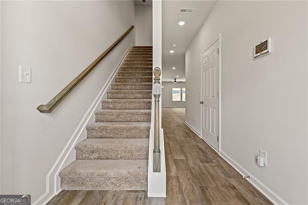 Welcome to The Grove at Mundy Mill, a modern townhome community in Gainesville, Georgia. Conveniently located just one mile from I-985, this community offers easy access to Lake Lanier, downtown Gainesville, and major highways, combining the best of location and lifestyle. The Grove at Mundy Mill features spacious 3- and 4-bedroom, 2.5-bathroom townhomes with approximately 1,600 square feet of living space. The floor plans boast 9-foot ceilings on the main level and hard surface flooring throughout. The family room includes a recessed fireplace and smart ceiling fan. The kitchen is designed for modern living with a large granite island, pull-out faucet, cup wash station, pendant lighting, and ample cabinet space. The spa-inspired owner's bathroom offers high-end finishes such as a freestanding tub, smart toilet, vessel sinks, rain head shower with bench, and LED mirrors with Wi-Fi and defroster. Secondary bathrooms feature granite countertops and rain head showers. All homes include full blinds, smart home technology with a smart home panel and smart thermostat, a UV HVAC air purification system for improved indoor air quality, and garages pre-wired for electric vehicle charging stations.
