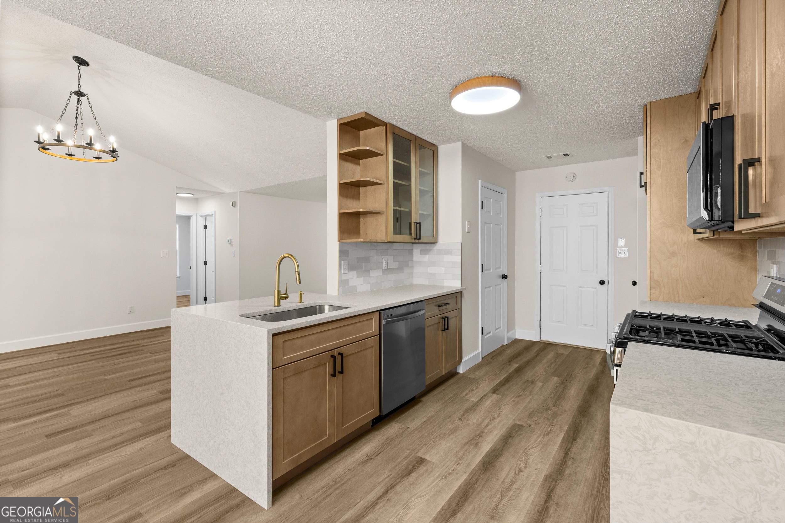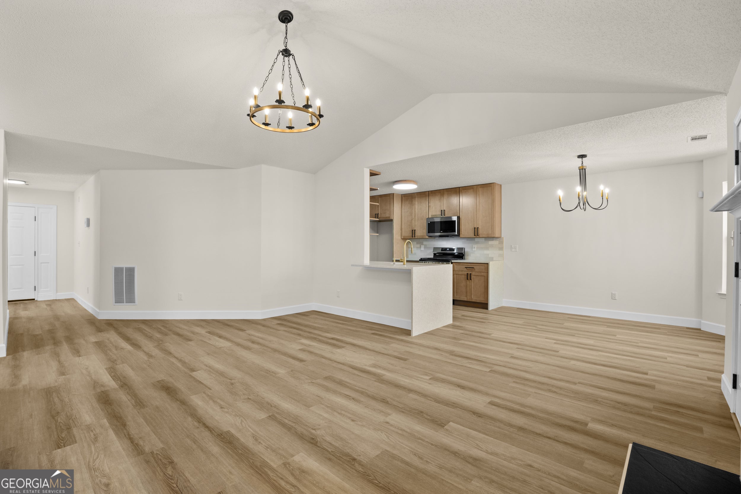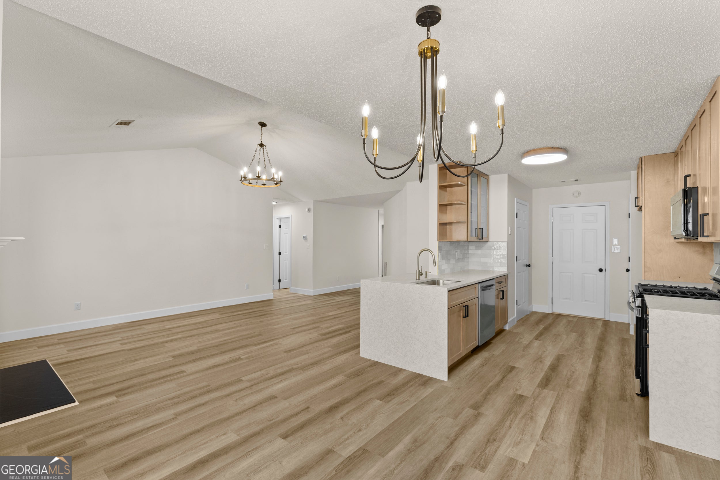 Renovated and move-in ready ranch nestled on a private, wooded lot. This beautifully updated home features an open-concept layout with vaulted ceilings and abundant natural light throughout. The spacious family room is anchored by a modern fireplace with custom accent wall and wood mantle, creating a striking focal point. New LVP flooring flows seamlessly through the main living areas, complemented by fresh neutral paint and updated lighting fixtures. The redesigned kitchen offers light wood cabinetry, sleek quartz countertops, stainless steel appliances, subway tile backsplash, and a large peninsula with bar seating and statement gold fixtures. Adjacent dining area features bay windows overlooking the private backyard and provides direct access to the rear deck - perfect for everyday living and entertaining. The primary suite showcases a dramatic designer accent wall and modern chandelier. Secondary bedrooms are generously sized with updated bathrooms featuring new vanities, mirrors, lighting, and fixtures. Exterior highlights include fresh paint, updated front door, two-car garage, and a spacious driveway. The wooded backyard provides privacy and a peaceful setting. This turnkey home blends contemporary finishes with comfortable single-level living - ideal for buyers seeking style, functionality, and low maintenance.
