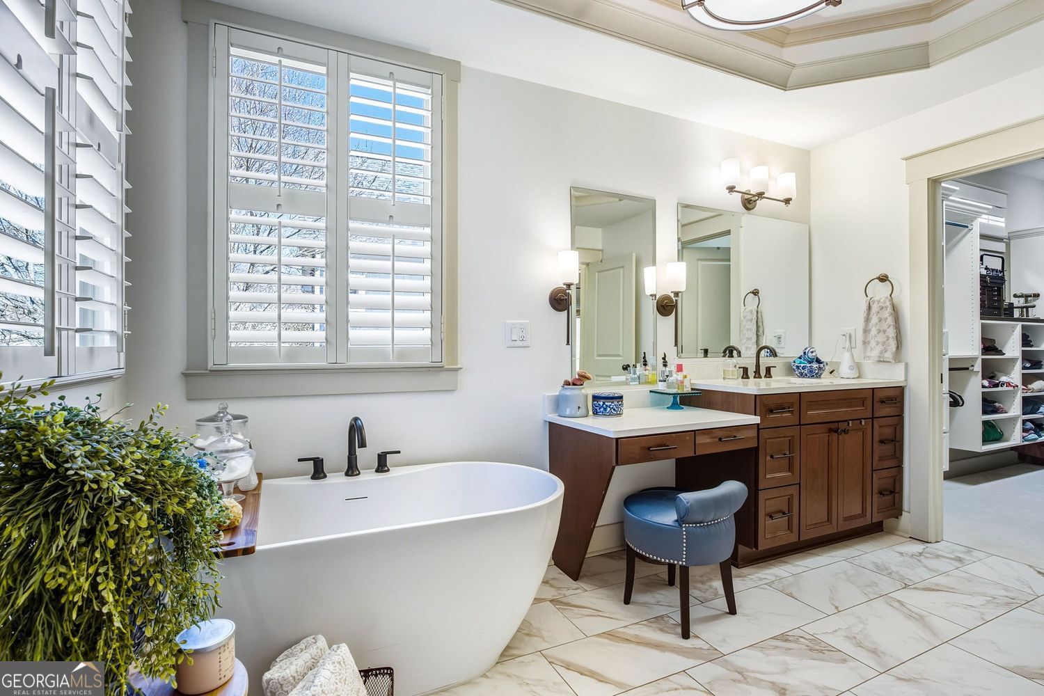 - Interior FeaturesBookcases, Double Vanity, Beamed Ceilings, Tray Ceiling(s), Walk-In Closet(s)