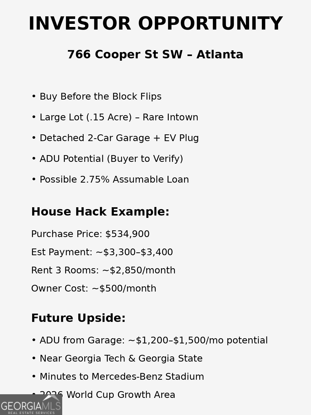 Welcome to 766 Cooper Street SW - a beautifully maintained, two-level Craftsman-style home built in 2019 by an award-winning builder and lovingly cared for by its original owner. Situated on a generous ~0.15-acre lot, this home blends timeless charm, modern upgrades, and a thoughtfully designed floor plan ideal for today's living. A welcoming front porch sets the tone, leading into a bright interior featuring hardwood floors, elegant finishes, and abundant natural light throughout. The main level offers a spacious open-concept living and dining area, a chef-inspired kitchen with granite countertops, walk-in pantry, and ample storage, plus a guest bedroom and full bath - perfect for visitors or flexible living. Multiple closets on the main level add convenience and functionality. Upstairs, the oversized primary suite serves as a private retreat with beautiful lighting, dual granite vanities, a soaking tub, separate shower, and a generous walk-in closet. Two additional bedrooms are thoughtfully positioned in a split-floor layout with a full bath between them. The laundry room is conveniently located on the second level. Step outside to a rear deck overlooking a private fenced backyard - ideal for relaxing or entertaining. The detached two-car garage features EV charging capability, abundant parking, and potential for future ADU conversion (buyer to verify zoning and permitting), offering flexibility for additional living space or long-term value. Ideally located near Downtown Atlanta, major interstates, and Hartsfield-Jackson International Airport, this home offers exceptional accessibility. With global events such as the upcoming World Cup expected to bring continued investment and growth to the area, now is an excellent time to secure intown property and build long-term equity. This well-cared-for home offers charm, space, modern convenience, and future potential in one compelling package. Seller's Property Disclosure available.