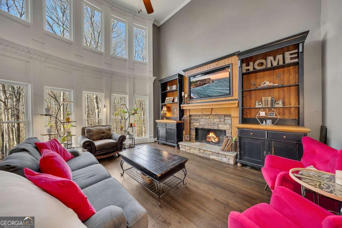 Tucked at the end of a quiet cul-de-sac and embraced by more than an acre of mostly level, lawn and maintained woods, this 4 bedroom, 3.5 bathroom home offers a rare blend of privacy and connection to nature, backing directly to a tranquil preserve where mature trees sway gently and a peaceful creek winds along the rear of the property. A soaring vaulted foyer welcomes you inside, where warm natural light pours across rich floors and guides you past an elegant formal dining room on the left and a sun-drenched sunroom or office on the right-perfect for quiet mornings with coffee or focused afternoons. The great room opens with cathedral ceilings, a striking stone fireplace, and a dramatic wall of windows that frame serene woodland views and invite the outdoors in. The spacious kitchen is both beautiful and functional, featuring gleaming granite counters, gorgeous cabinetry with abundant storage, a gas range, double ovens, stainless steel appliances, a generous pantry, and a welcoming eat-at bar that flows effortlessly into a bright breakfast area and the heart of the home. Nearby, a laundry room and mudroom area offer everyday convenience. Upstairs, the expansive primary suite feels like a private retreat, with tray ceilings, large sunlit windows, and a spa-inspired ensuite bath featuring double vanities, a sit-at counter, a deep soaking tub, and a separate shower. Three additional bedrooms provide comfortable accommodations, including a Jack-and-Jill bath shared between two rooms and a private bath for the third. Outdoor living is equally inviting, with a covered back deck overlooking the peaceful preserve, a welcoming covered front porch, and a patio with a firepit area. Completing the home is a spacious three-car garage and access to community amenities including a fishing pond, covered pavilion, and playground, along with the opportunity for an optional associate golf membership initiation to nearby Woodmont, adding yet another layer of lifestyle appeal to this serene and beautifully appointed property. This property won't be available for long... schedule your showing today!!