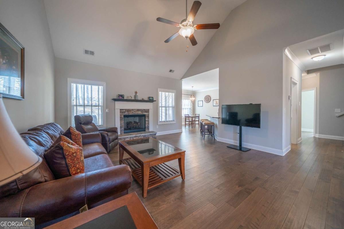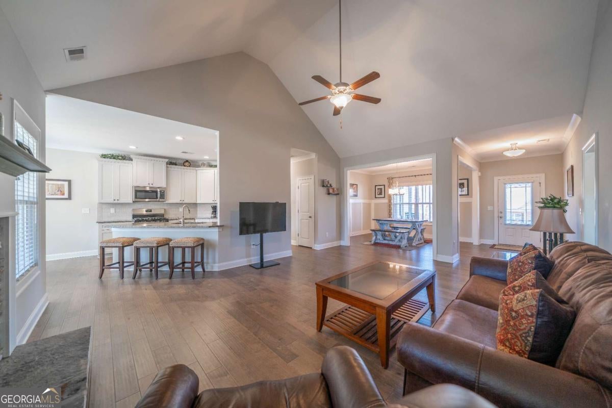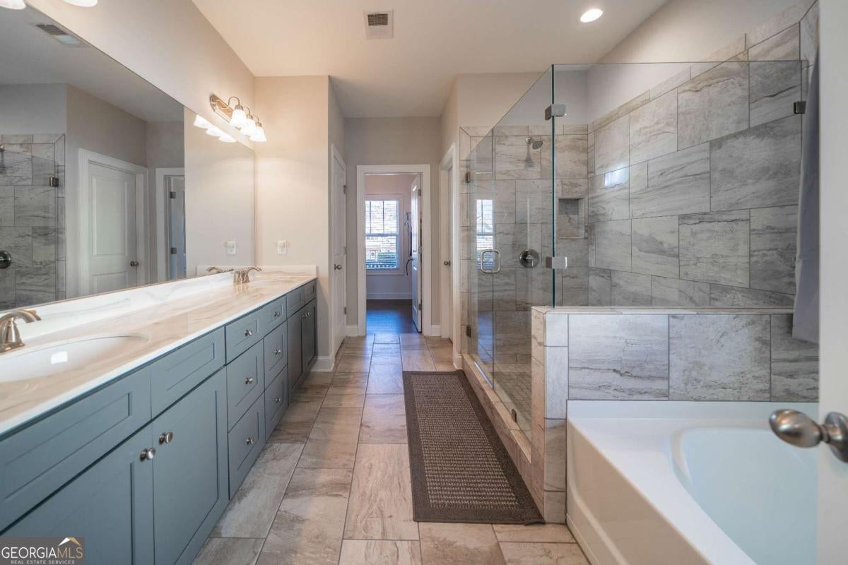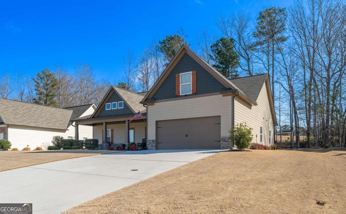 Beautiful lakefront home featuring 3 bedrooms on the main level, a spacious kitchen with center island, backsplash, and ample storage, plus a cozy fireplace and natural color palette throughout. The primary suite offers a separate tub and shower, dual sinks, and plenty of storage. Upstairs includes a finished bonus room with full bath. Access to community lake and dock. Quick access to Hwy 120 and Marietta.