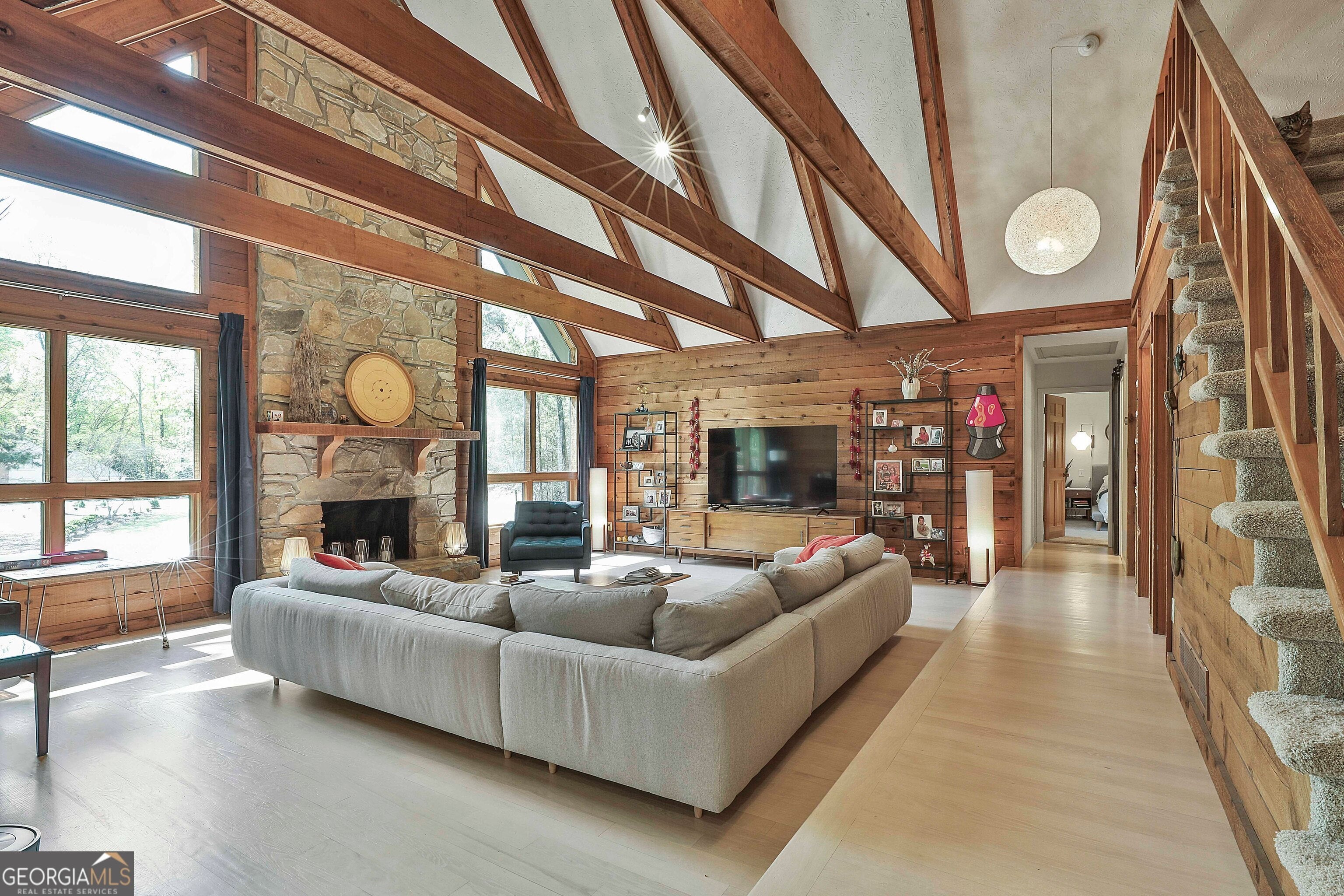 Tenants had to leave early! Stunning mid century style in central Peachtree City. Large acre+ private lot with large deck & yard (w/ fire pit) great for entertaining! (and yard care is included) 5 bedrooms (or 4+bonus) 4 baths, incl master + 2 bedrooms on the main - 1 upstairs & 1 in the finished lower level. A fantastic home offering a light filled open floorplan, a spacious greatroom with beamed ceiling, wet bar & stone fireplace, kitchen with all appliances (refrigerator, DW, micro, range, vent hood) an island breakfast bar + separate dining area, a huge mud/ laundry room with washer & dryer included & a master suite with a custom walk-in closet & bath & it's own screened porch! The finished lower level is perfect for a teen get away or guest suite & offers tons of space for playing & unfinished space for storage. Stylish decor' & appointments throughout including designer tile work, graphite stainless appliances, quartz counters, upgraded lighting, custom closet built-ins. Excellent schools - some of the best around! (Kedron Elem, Booth Middle & McIntosh High) Plus offering all of Peachtree City's wonderful amenities - miles & miles of carts paths for a leisurely stroll or ride, Lakes Peachtree & Kedron, The Fred Amphitheater, The Pavilion for concerts & The Night Market, many parks + lots of shopping & restaurants. Just a great place to call home!