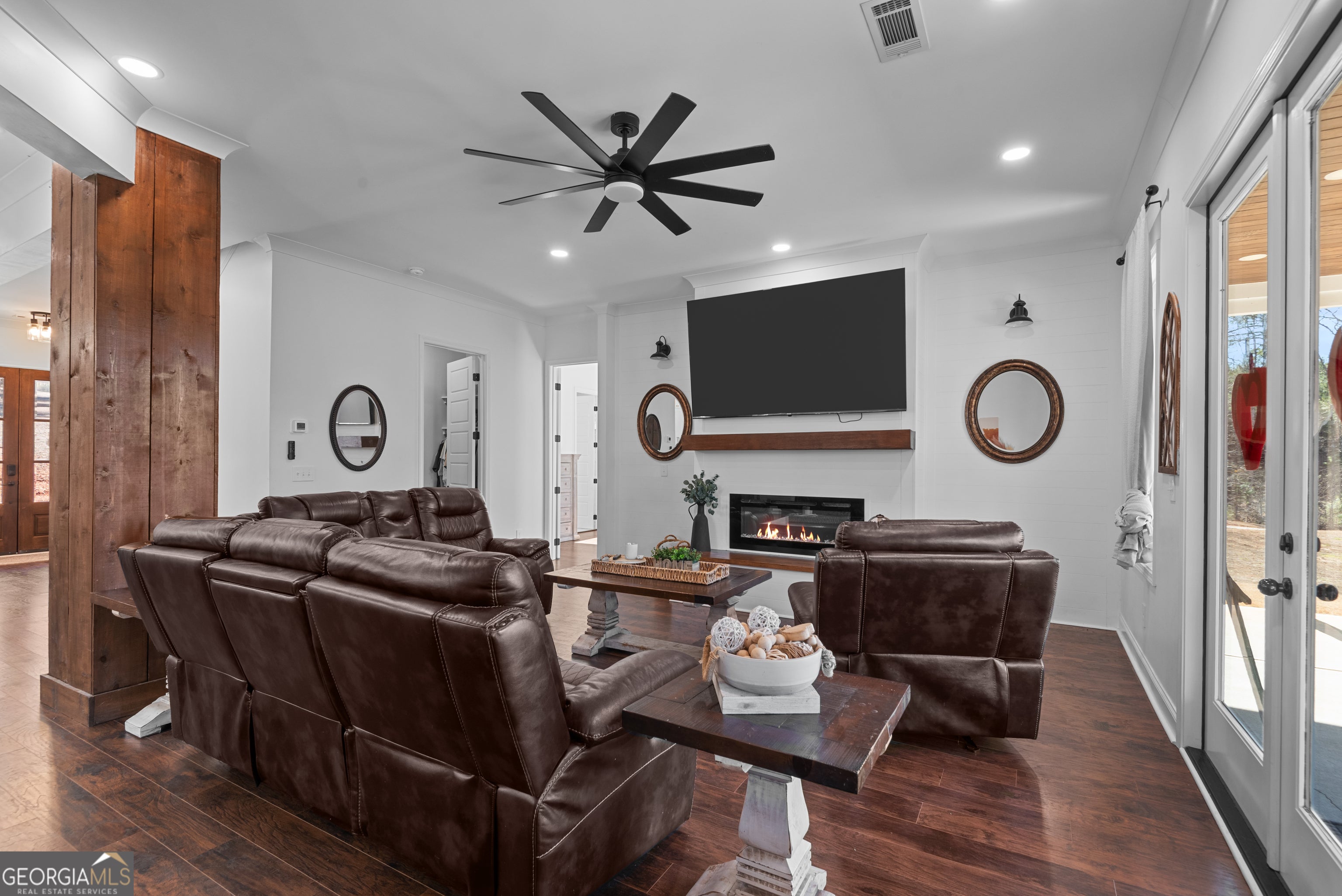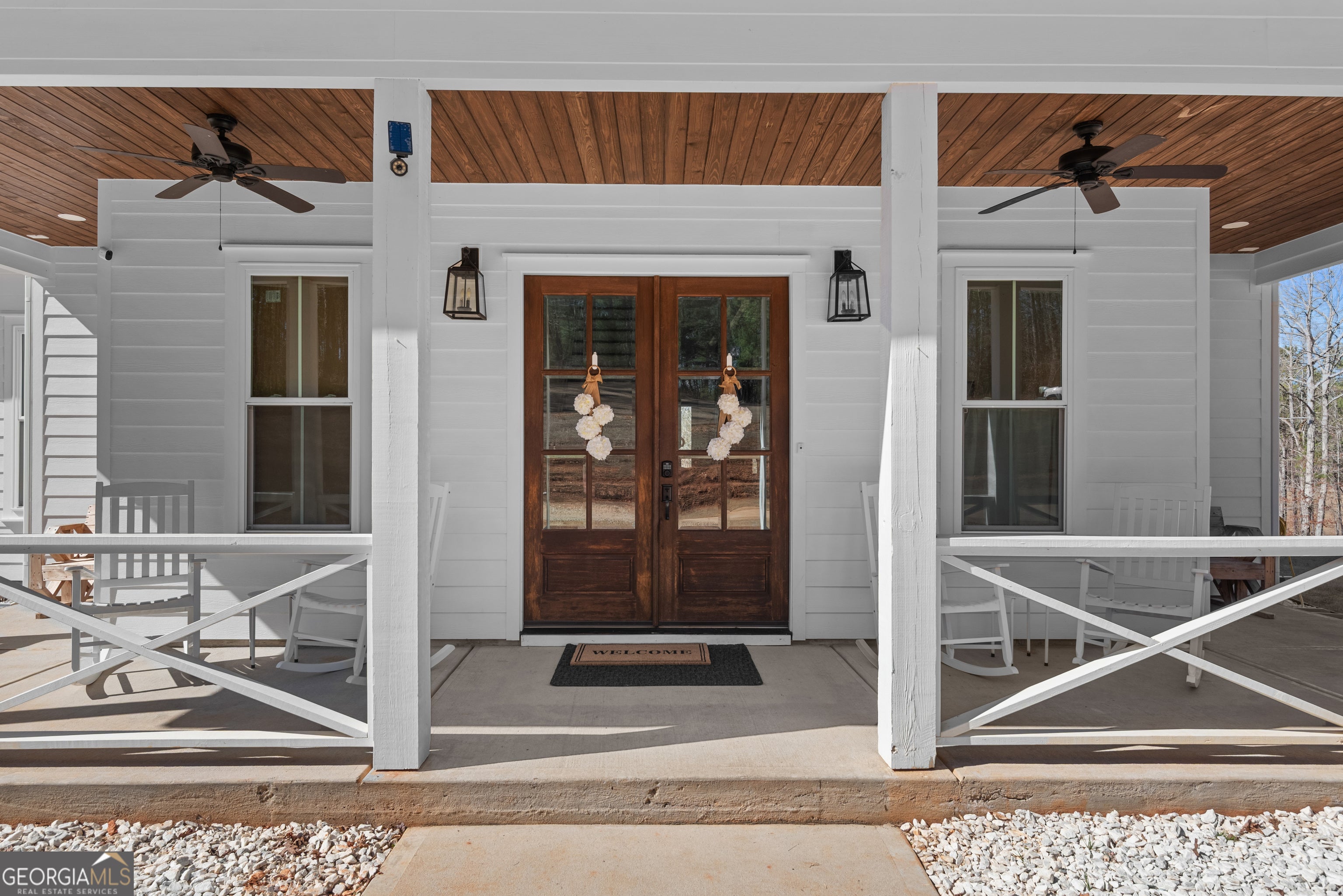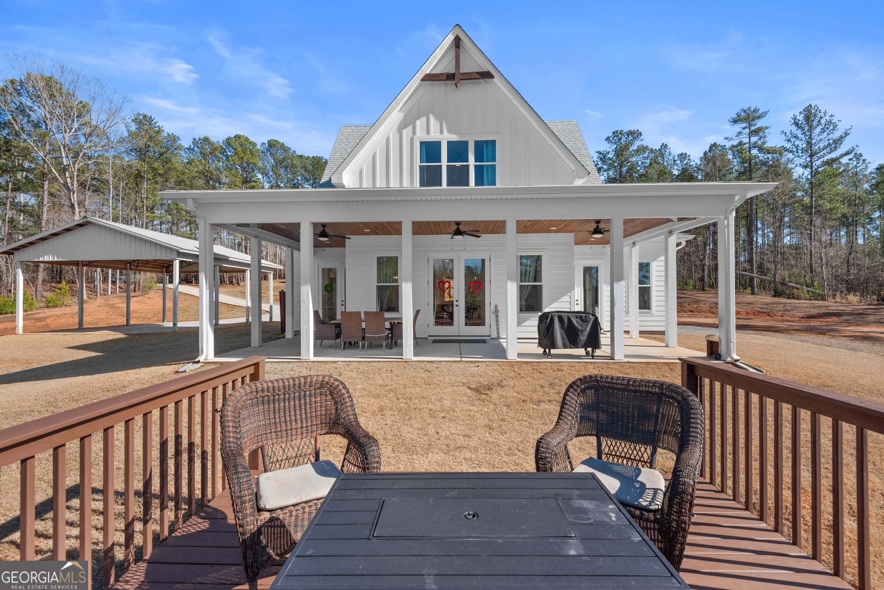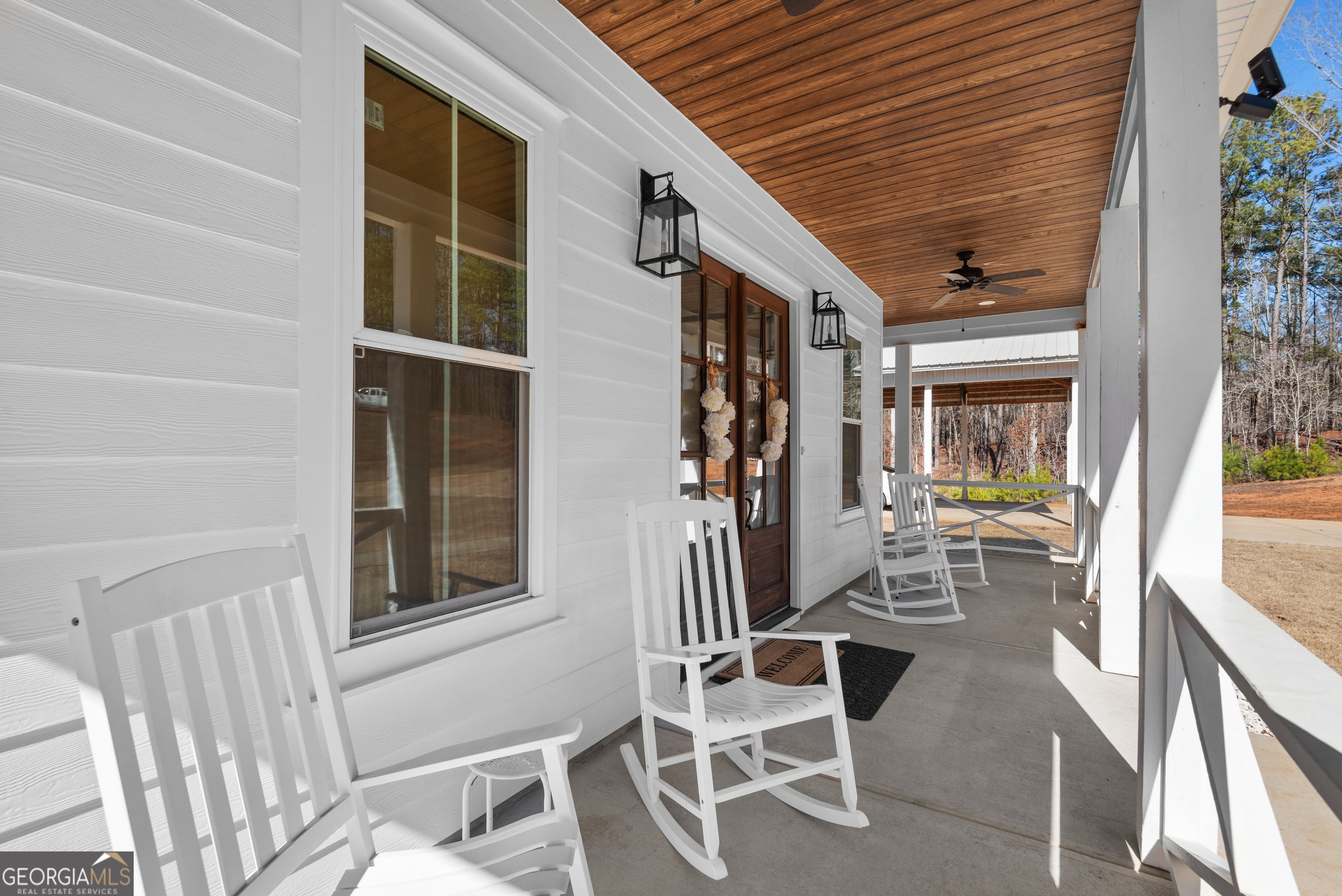 Welcome home to 700 GA Hwy 87 Flovilla, GA 30216 - a stunning custom residence set on over 18 private acres with timeless charm and modern luxury. Built in 2022, this elegant 4-bedroom, 3.5-bath home offers over 2,300 square feet of thoughtfully designed living space, plus more than 850 square feet of covered porch space for seamless indoor-outdoor living. A gated entrance and winding drive lead to a classic rocking-chair front porch and French door entry. Inside, the open-concept layout blends comfort and sophistication. The kitchen features quartz countertops, an oversized island with seating, custom cabinetry with glass accents, brushed gold hardware, a statement vent hood, herringbone backsplash, walk-in pantry, and premium Forno stainless steel appliances. The spacious family room is anchored by a dramatic shiplap fireplace and flows effortlessly to the expansive rear wraparound porch. The main-level primary suite is a true retreat with private porch access and a spa-inspired bath showcasing marble tile floors, a fully tiled oversized shower with dual heads including a rain feature, freestanding soaking tub, his and hers vanities, and a generous walk-in closet. Upstairs, three additional bedrooms each offer walk-in closets, with two featuring private ensuite baths. No carpet - only beautiful hard-surface flooring throughout. Outdoors, enjoy wide-open cleared space framed by peaceful wooded acreage for privacy. A matching four-car covered carport and a 40x24 detached three-bay shop provide exceptional space for hobbies, storage, or business use. Located in the quiet countryside of Flovilla, just minutes to Jackson and Forsyth and convenient to Jackson Lake, High Falls State Park, Indian Springs State Park, and Lake Juliette, this one-of-a-kind property delivers luxury, privacy, and elegance in perfect balance.