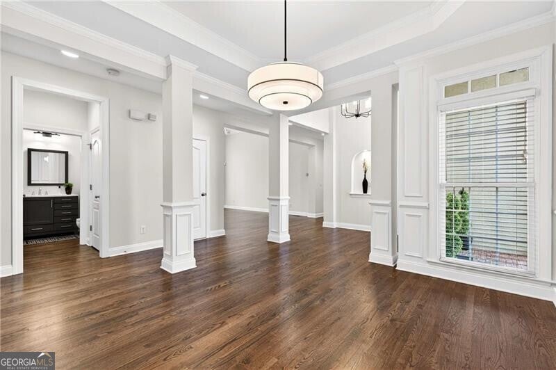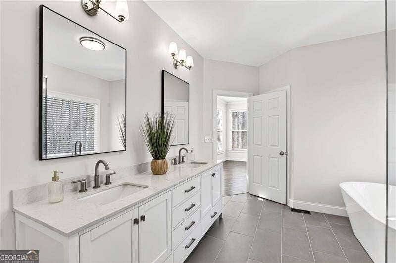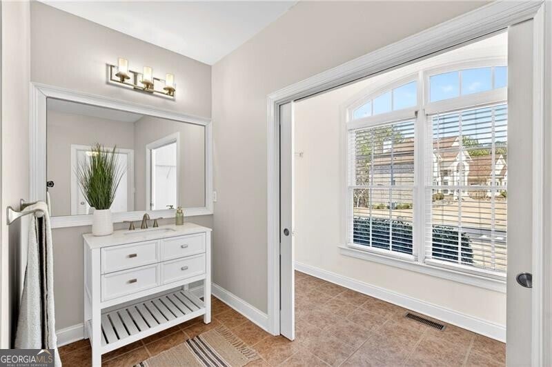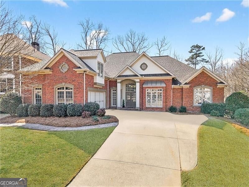 This elegant three-sided brick residence blends timeless architecture with refined modern updates, offering a thoughtfully designed floor plan ideal for both everyday living and gracious entertaining. Rich hardwood floors span the main level, where two primary bedroom suites provide exceptional flexibility and comfort. The main primary retreat features a custom-designed walk-in closet with a dedicated sitting area and a serene, spa-inspired bathroom newly remodeled with double vanities, quartz countertops, crisp white cabinetry, a frameless glass shower, a soaking tub, and modern wide tile for a seamless, sophisticated finish. A second main-level primary suite offers a stepless shower, new vanity, and an oversized walk-in closet-perfect for guests or multigenerational living. The heart of the home is the beautifully appointed kitchen, showcasing granite countertops, a striking herringbone backsplash, stainless steel appliances, and a gas cooktop with a vented hood. A large center island with dining area opens to a separate grilling porch, creating an effortless indoor-outdoor flow. Adjacent living areas include a dining room with a trey ceiling, a light-filled great room with bay windows, and a vaulted keeping room with a fireplace, all designed to feel both inviting and elevated. Additional main-level highlights include a stylish powder room, a well-equipped laundry room with sink, and a two-car garage conveniently located off the kitchen level and outfitted with a Tesla charger. Upstairs, two generously sized bedrooms-each with walk-in closets-share a Jack & Jill bathroom, offering comfort and privacy. The expansive unfinished terrace-level basement spans 2,737 square feet,stubbed for a full-bath and walks out to a covered patio, providing endless possibilities for recreation, entertaining, or future customization. An upper-level deck off the keeping room extends the living space outdoors. The community enhances the lifestyle with resort-style amenities including a pool, playground, meeting room and tennis courts. Top rated Gwinnett public schools. Conveniently located near I-85.