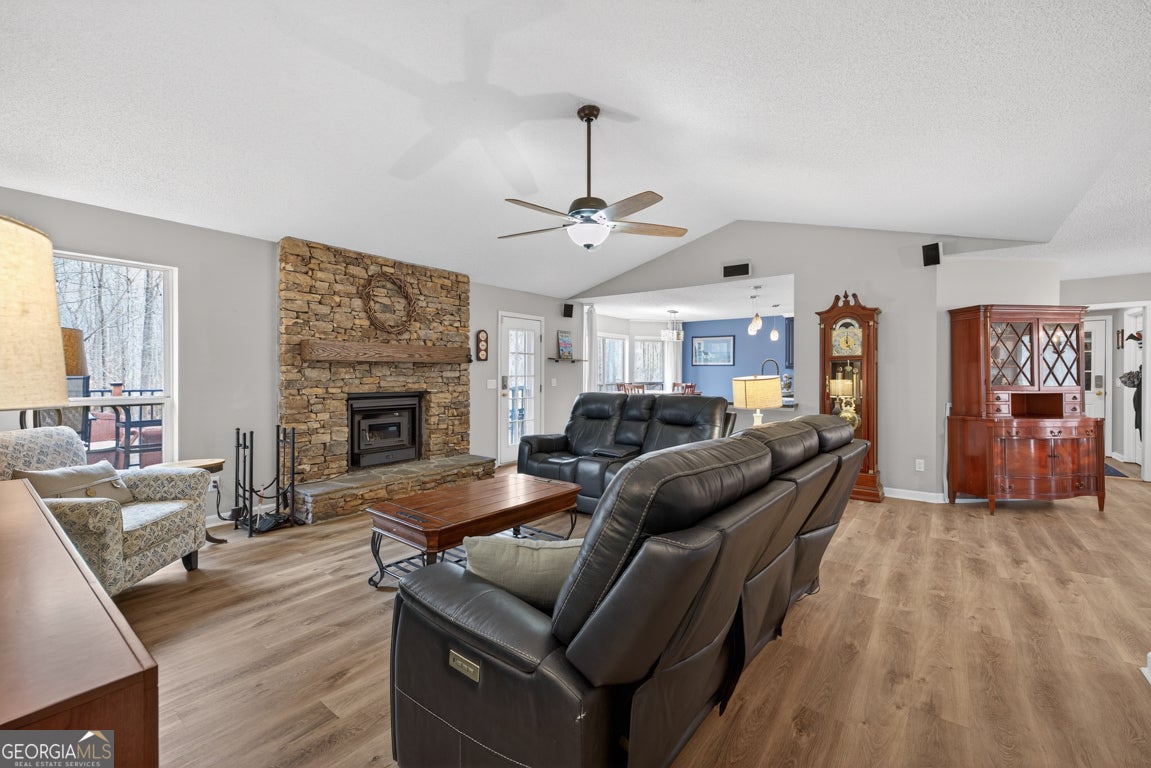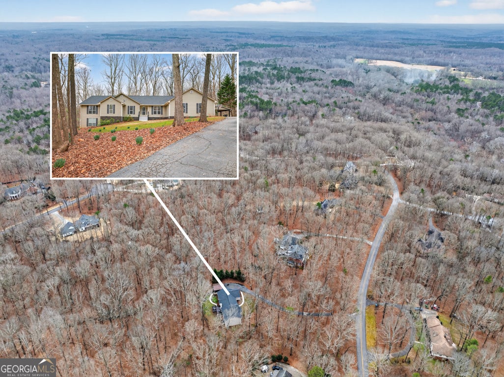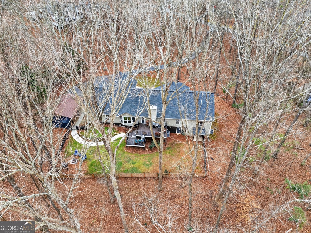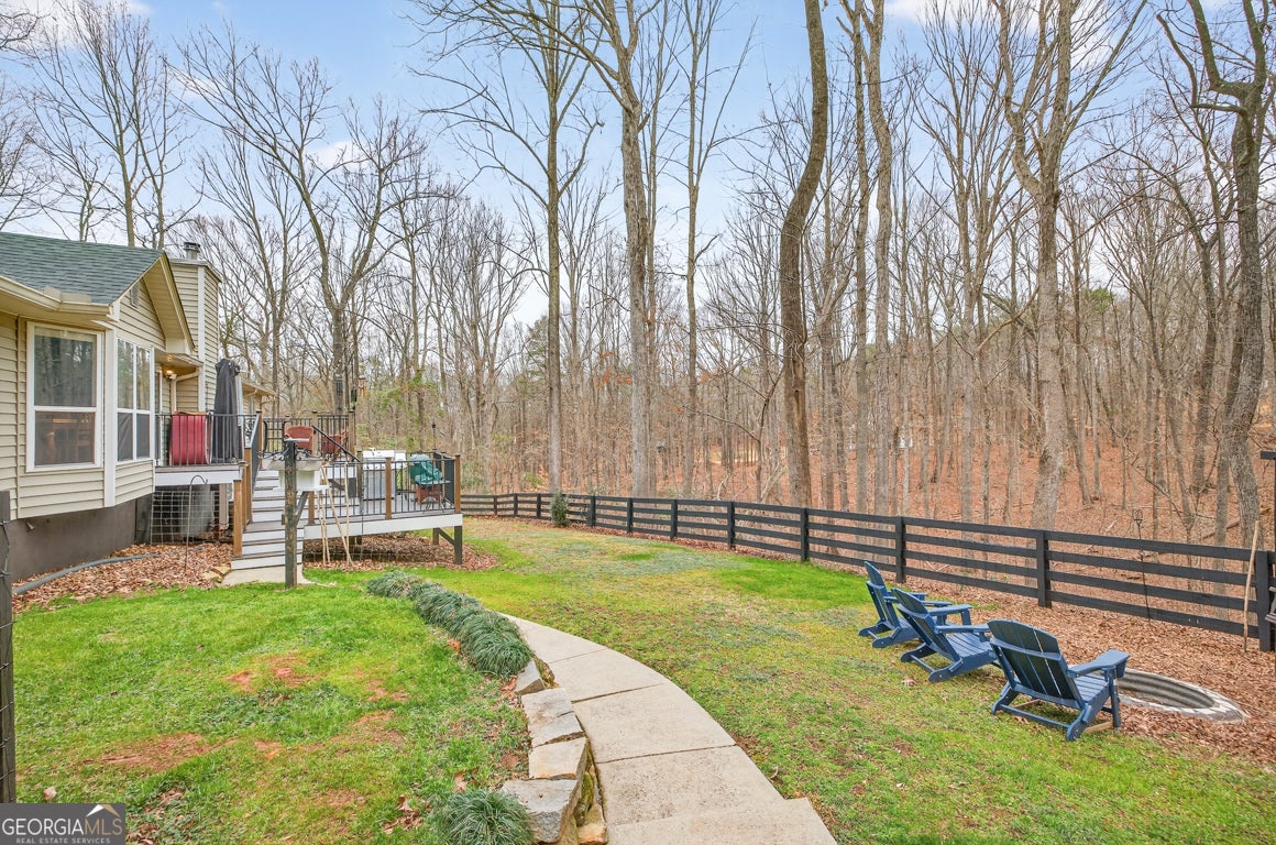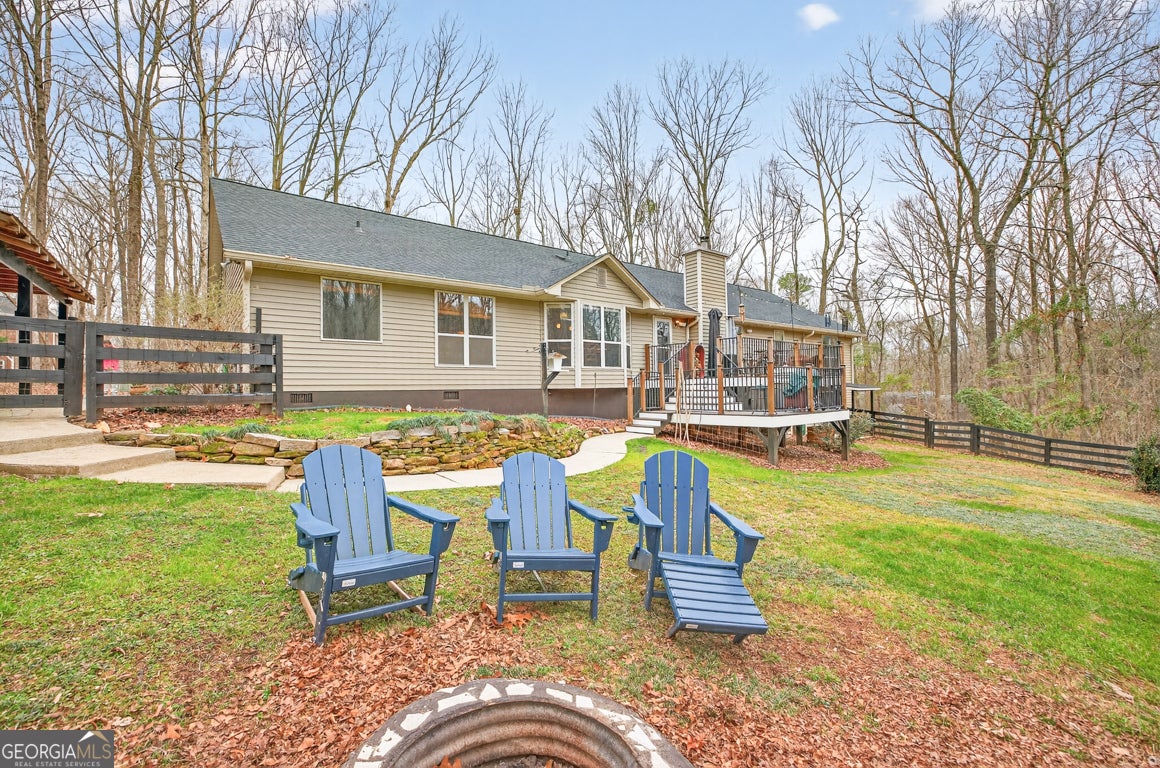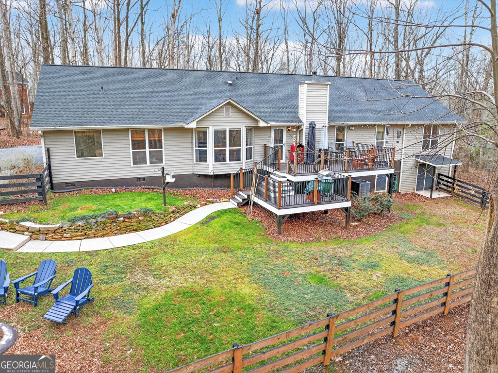 Beautifully situated on a 2.90-acre wooded lot in desirable Staghorn Plantation, this spacious 5BR/2BA, 4,076 sq ft home offers exceptional privacy and a flexible split bedroom floor plan. Perfect for multigenerational living. Features include newer LVP flooring, neutral paint, and a striking custom stone fireplace with wood-stove insert. Floor-to-ceiling windows brighten the vaulted Great Room, which flows seamlessly into the Corian-appointed kitchen with stainless steel appliances, abundant cabinetry, and an extended breakfast bar. Four-Year-Old Roof & 2-Year-Old HVAC Systems. The Owner's Suite is privately located and offers a large closet and upgraded bath with tile floors, dual-sink vanity, Whirlpool tub, and tiled shower with frameless glass. Four additional bedrooms, an updated hall bath, and a secondary living area complete the west wing. A hidden staircase leads to a versatile bonus room. The partial basement provides an oversized recreation room, storage, and interior/exterior access. Outdoor living includes a multi-tiered deck, fenced backyard, 2-car side-entry garage, 2-car carport, paved drive, and walkways. All-electric systems, vinyl siding, public water, and septic. Conveniently located 3 miles to Hwy 441, 10 minutes to Commerce, and less than 14 miles to Athens. Optional HOA offers access to amenities that include a 38 acre lake with beach, playground, basketball court, clubhouse, pickleball court, fire pit and chapel.