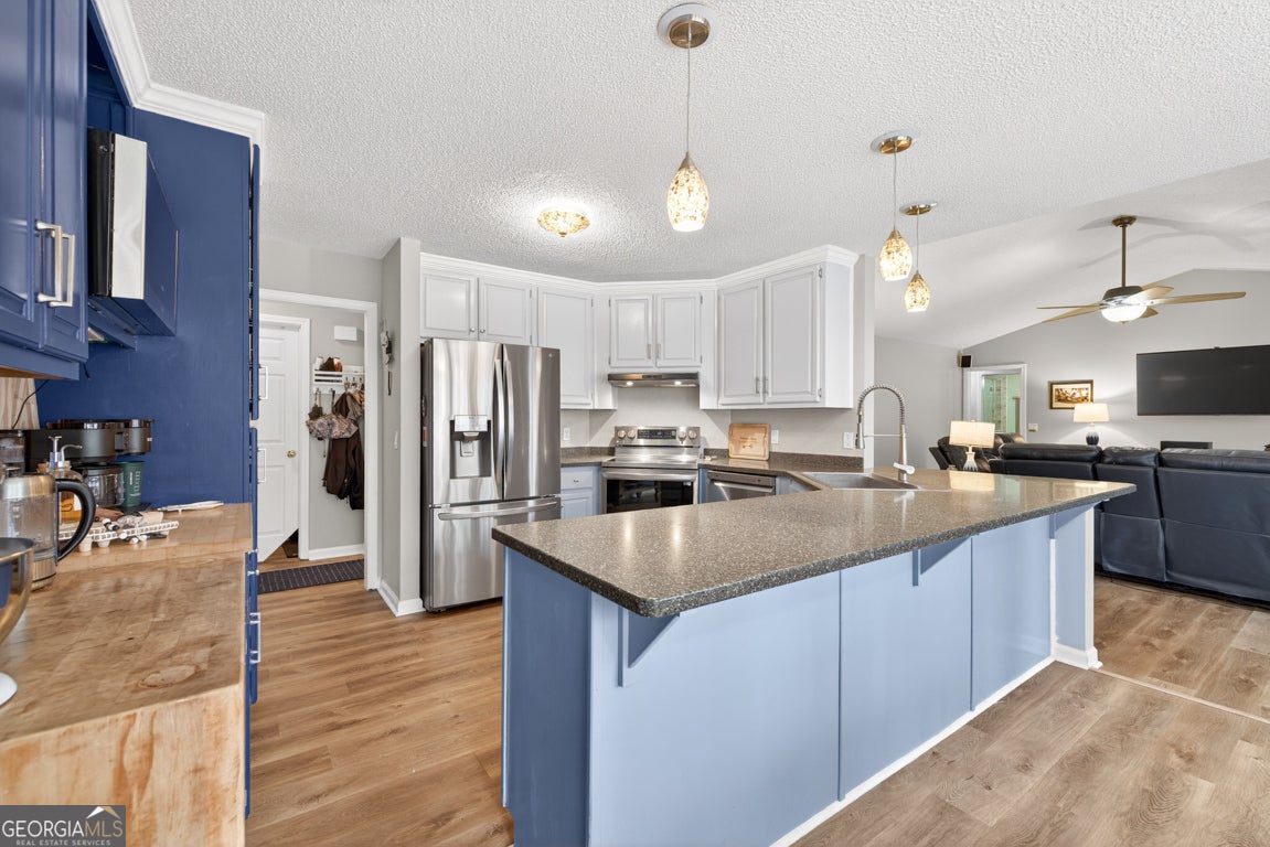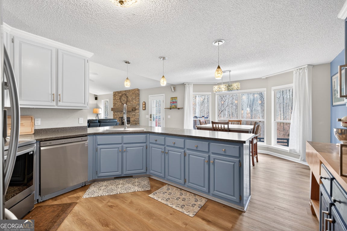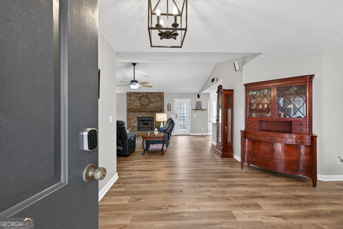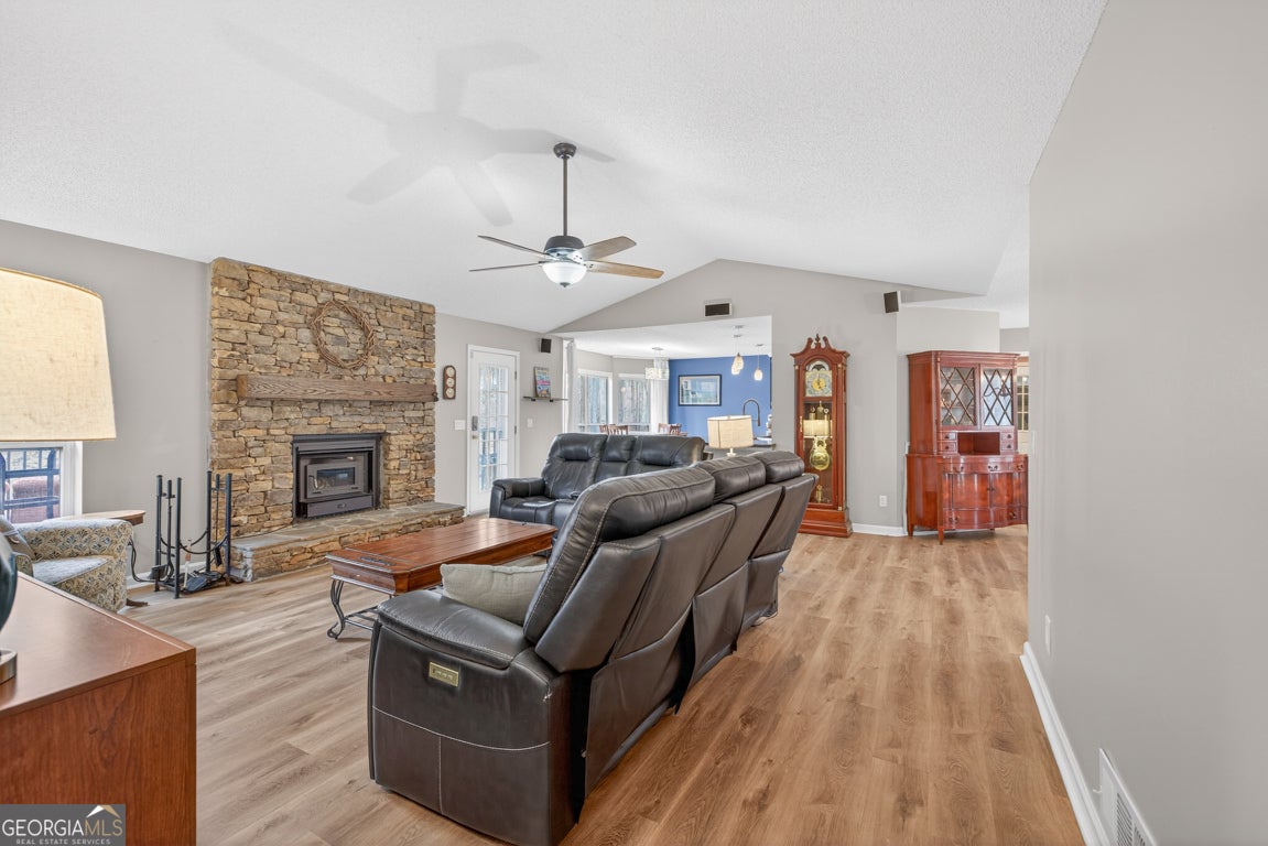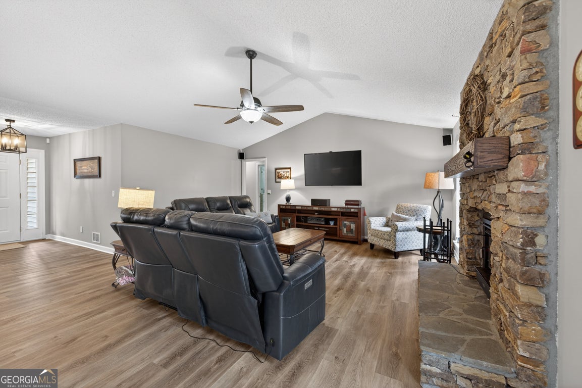 Beautifully situated on a 2.90-acre wooded lot in desirable Staghorn Plantation, this spacious 5BR/2BA, 4,076 sq ft home offers exceptional privacy and a flexible split bedroom floor plan. Perfect for multigenerational living. Features include newer LVP flooring, neutral paint, and a striking custom stone fireplace with wood-stove insert. Floor-to-ceiling windows brighten the vaulted Great Room, which flows seamlessly into the Corian-appointed kitchen with stainless steel appliances, abundant cabinetry, and an extended breakfast bar. Four-Year-Old Roof & 2-Year-Old HVAC Systems. The Owner's Suite is privately located and offers a large closet and upgraded bath with tile floors, dual-sink vanity, Whirlpool tub, and tiled shower with frameless glass. Four additional bedrooms, an updated hall bath, and a secondary living area complete the west wing. A hidden staircase leads to a versatile bonus room. The partial basement provides an oversized recreation room, storage, and interior/exterior access. Outdoor living includes a multi-tiered deck, fenced backyard, 2-car side-entry garage, 2-car carport, paved drive, and walkways. All-electric systems, vinyl siding, public water, and septic. Conveniently located 3 miles to Hwy 441, 10 minutes to Commerce, and less than 14 miles to Athens. Optional HOA offers access to amenities that include a 38 acre lake with beach, playground, basketball court, clubhouse, pickleball court, fire pit and chapel.