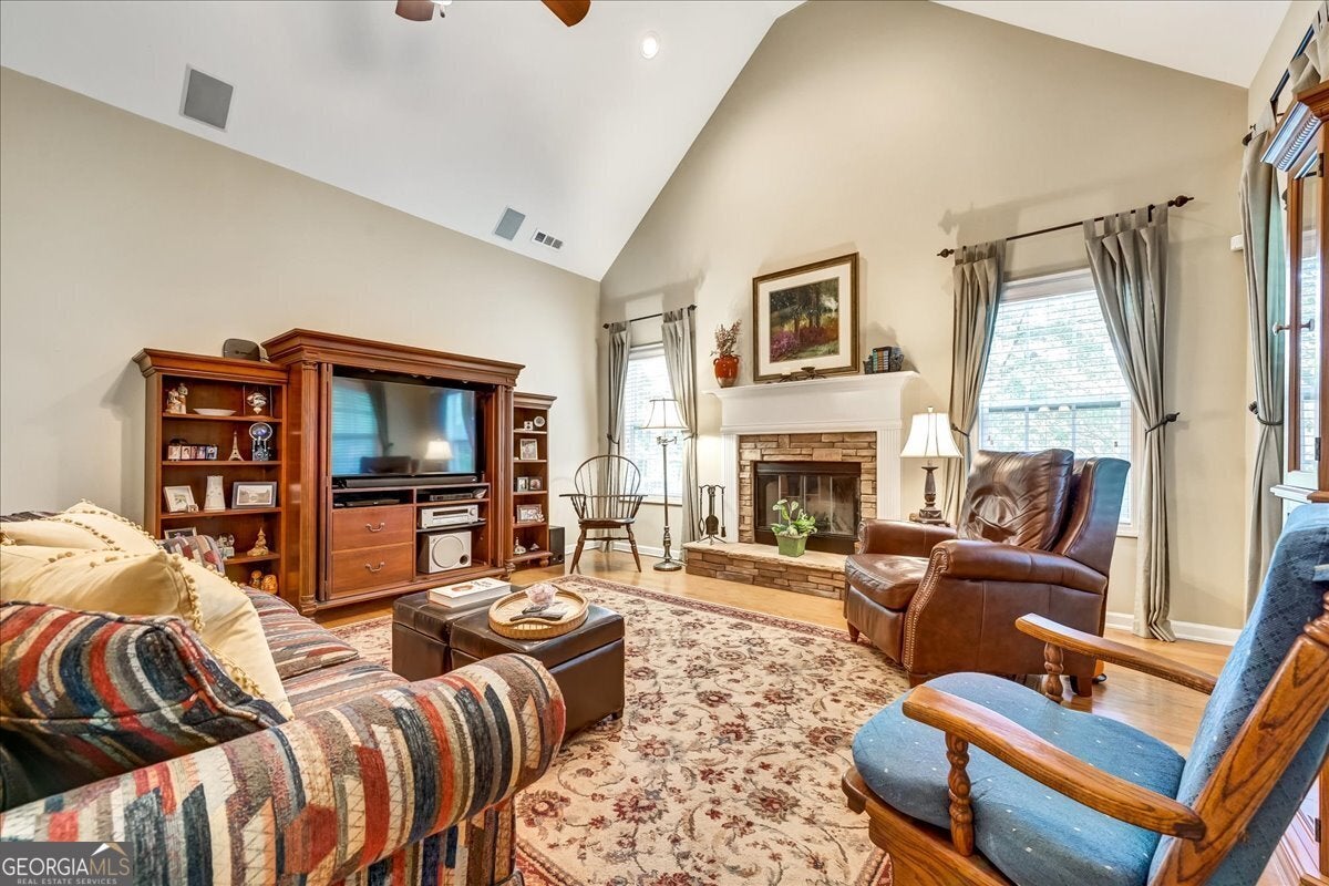 This beautifully maintained, move-in ready home offers a perfect blend of comfort, style, and convenience-ready for you today! From the moment you arrive, you will be greeted by a beautifully, landscaped limited maintenance lawn. A welcoming covered entryway and front porch. Step inside and experience the warmth of the hardwood foyer and an open, light-filled floor plan that immediately feels like home. The formal dining room makes a statement with tray ceilings, hardwood floors-perfect for hosting gatherings or special occasions. The spacious family room is ideal for relaxing or entertaining, featuring a cozy stone fireplace with gas logs, ceiling fan, and hardwood floors. Moving on to the kitchen you will find beautiful cabinetry, granite countertops, black slate appliances, recessed lighting, a pantry, and a breakfast bar. For additional seating you have a breakfast area overlooking the relaxing backyard. The desirable split-bedroom layout offers privacy, with the primary suite tucked away for peace and quiet. This master suite includes tray ceilings with a ceiling fan. The master bath offers double marble sinks, tile floors, a walk-in shower, a soaking garden tub, and a large closet. The laundry room provides added convenience with shelving and a mud sink. On the opposite side of the home, you will find two oversized secondary bedrooms, each with large closets and ceiling fans, along with a full bathroom off the hallway featuring tile flooring, marble counter tops, and a tub/shower combo. Upstairs, a versatile fourth bedroom with its own full bathroom and walk-in closet offers the perfect space for guests, a home office, or a media room. Walk in attic access makes storage and access to the HVAC system convenient. Enjoy outdoor living on the screen porch with tile flooring overlooking a serene, partially wooded backyard for your own private escape. A detach garage with upstairs storage is perfect for your third car or workshop for endless possibilities. Additional features include engineered hardwoods, carpet, tile floors, smooth ceilings, gutter guards, a security system, irrigation system, and thoughtful finishes throughout. This is a meticulously cared for one owner home and it shows. Schedule your showing today and Don't miss the opportunity to make this house your new Home.