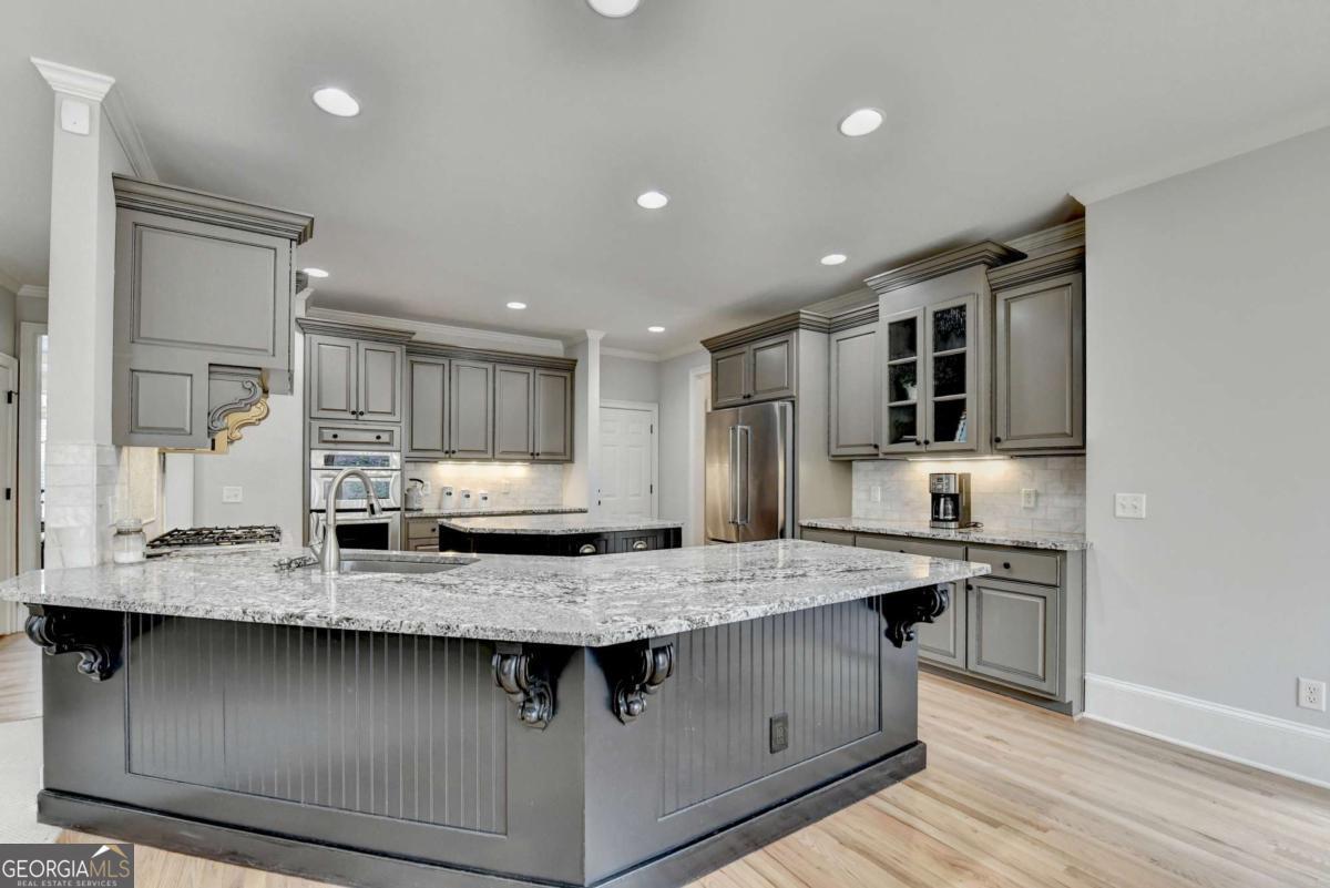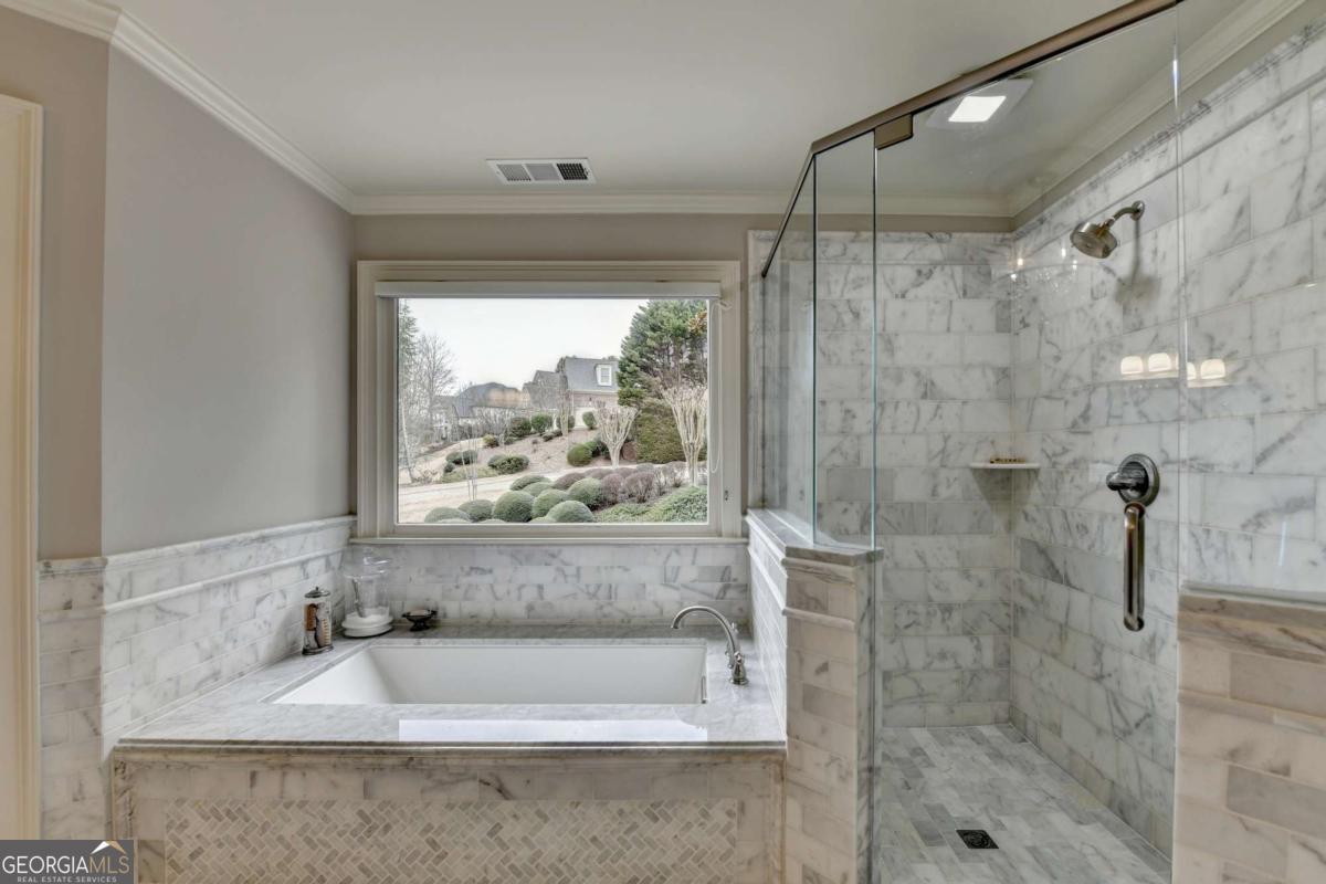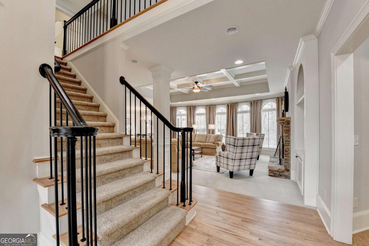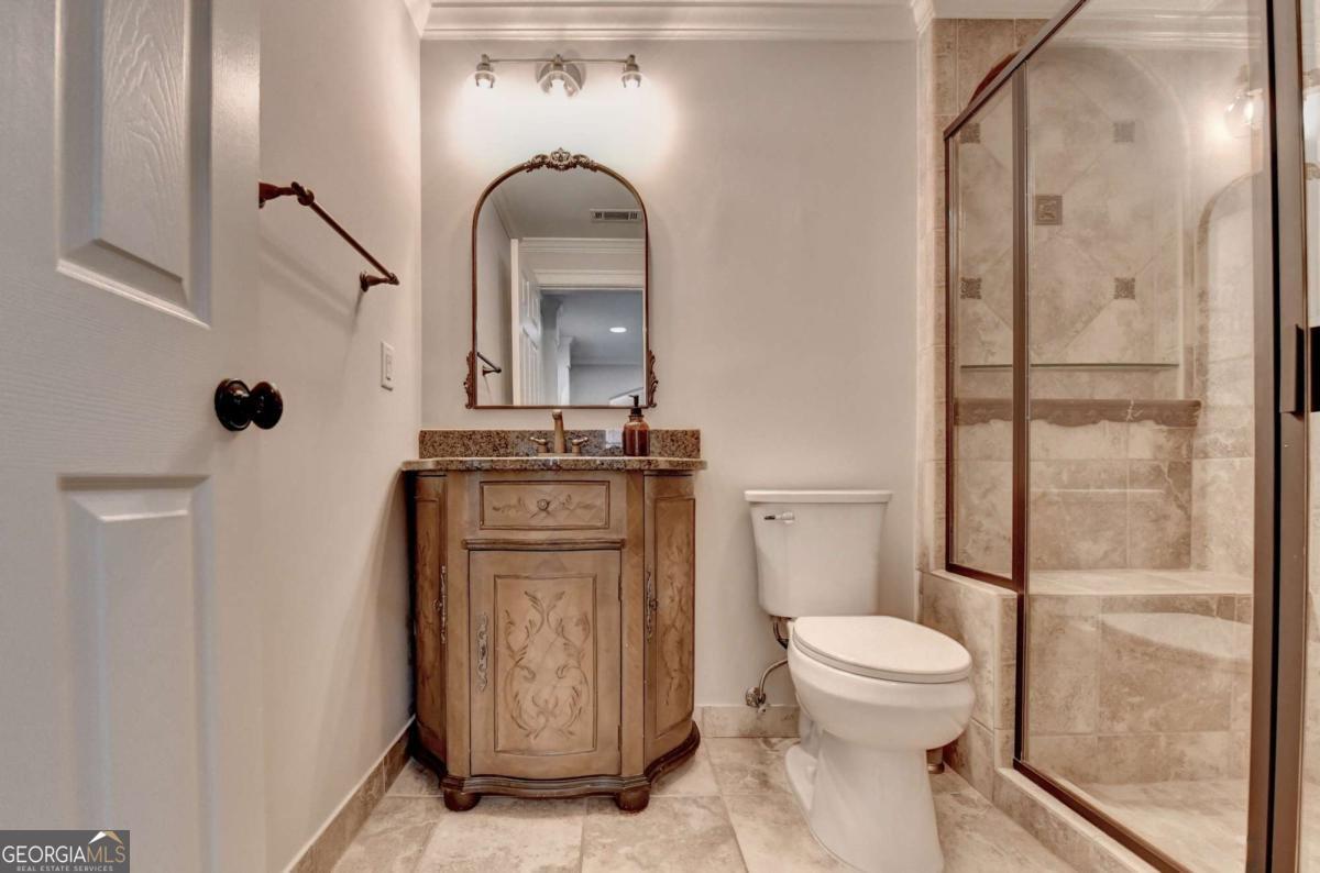 Welcome to this beautifully UPDATED 4 side BRICK, 6 bed, 5 bath home with sought-after GUEST BEDROOM and BATHROOM on the MAIN FLOOR, professionally FINISHED TERRACE LEVEL and 4 REMODELED BATHROOMS on a 1 ACRE, LEVEL, PRIVATE lot! Step through the arched front porch into the grand two-story hardwood foyer. To your left, the formal DINING ROOM features picture frame and crown molding, tray ceiling and hardwood floor. To your right is the elegant office/music/living room with crown molding. The FAMILY ROOM is the heart of the home, highlighted by a dramatic bayed wall of windows, a stack stone FIREPLACE, custom built-in cabinetry and coffered ceiling. The UPDATED KITCHEN is both stylish and functional, showcasing custom cabinetry, granite countertops, center island, large eat-in counter, stainless steel appliances, VENT HOOD, under cabinet lighting and tile backsplash. The adjoining BREAKFAST ROOM is filled with natural light from large picture windows and opens to AN EXPANSIVE DECK - perfect for indoor/outdoor entertaining. A laundry room with sink and cabinetry and side door home entrance add convenience. A sought-after MAIN LEVEL GUEST SUITE includes a fully REMODELED BATHROOM with designer tile shower, custom cabinetry, and marble countertops. Upstairs, the romantic MASTER SUITE features a deep tray ceiling and a spacious SITTING AREA, ideal for an office or reading nook. The spa-inspired bath has been BEAUTIFULLY RENOVATED with high-end custom cabinetry, quartz countertops, marble tile floor with intricate tile accents, designer lighting, a large, gorgeous shower, and a soaking tub with tile surround. Three additional bedrooms and a BONUS ROOM complete the upper level. One bedroom offers a vaulted ceiling and COMPLETELY REMODELED private EN-SUITE BATH with custom cabinetry, quartz counters, and tiled shower/tub and floor. Two secondary bedrooms share a REMODELED JACK AND JILL BATHROOM with double vanity, quartz countertops, tile floor and shower and updated lighting and fixtures. A huge BONUS ROOM with bay window provides flexible space for a media room, playroom, study or bedroom. The FINISHED TERRACE LEVEL is built for entertaining and features a spacious LIVING/GAME ROOM, a custom bar with stain-grade cabinetry, granite and wood countertops, sink, dishwasher, refrigerator, stone backsplash, and a designer WINE ALCOVE that features a stunning wrought iron door. This level also includes a large BEDROOM with tray ceiling and built-ins, EXERCISE ROOM, GAME/POOL ROOM and FULL BATHROOM with tile floor and shower. Step outside to the brick PATIO featuring a STONE FIREPIT, overlooking the LEVEL, landscaped backyard with a stone accent wall and steps leading to the wooded area. The backyard is completely private with ROOM FOR A POOL! The perfect retreat for relaxing or entertaining! Featuring FRESH INTERIOR PAINT, REFINISHED HARDWOODS, and fully REMODELED BATHROOMS, this home sits on a PRIVATE 1-ACRE LOT and has been meticulously maintained by the original owners - truly move-in ready! The gated Laurel Springs community, located in the sought-after LAMBERT HIGH SCHOOL district features a Jack Nicklaus golf course, large clubhouse with fitness center, 2 beautiful pools, tennis courts, pickleball, playground, basketball court, 24-hour security and so much more! This is the perfect place to call home!