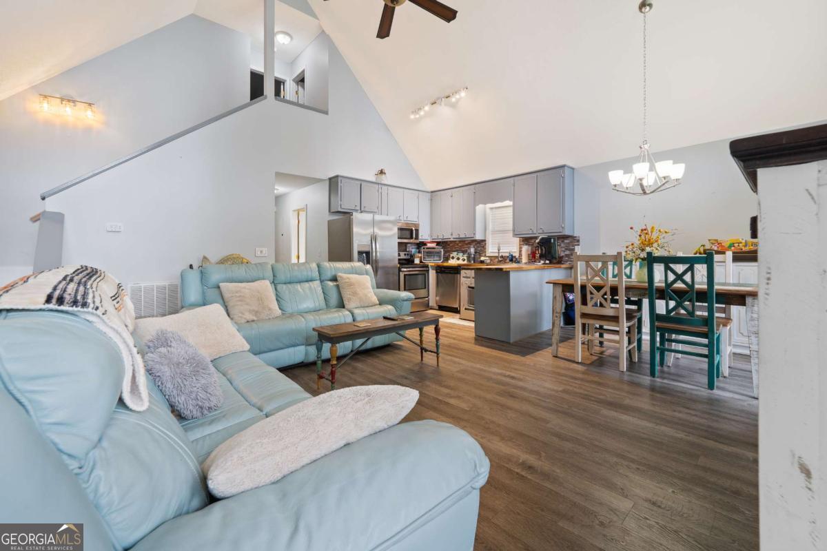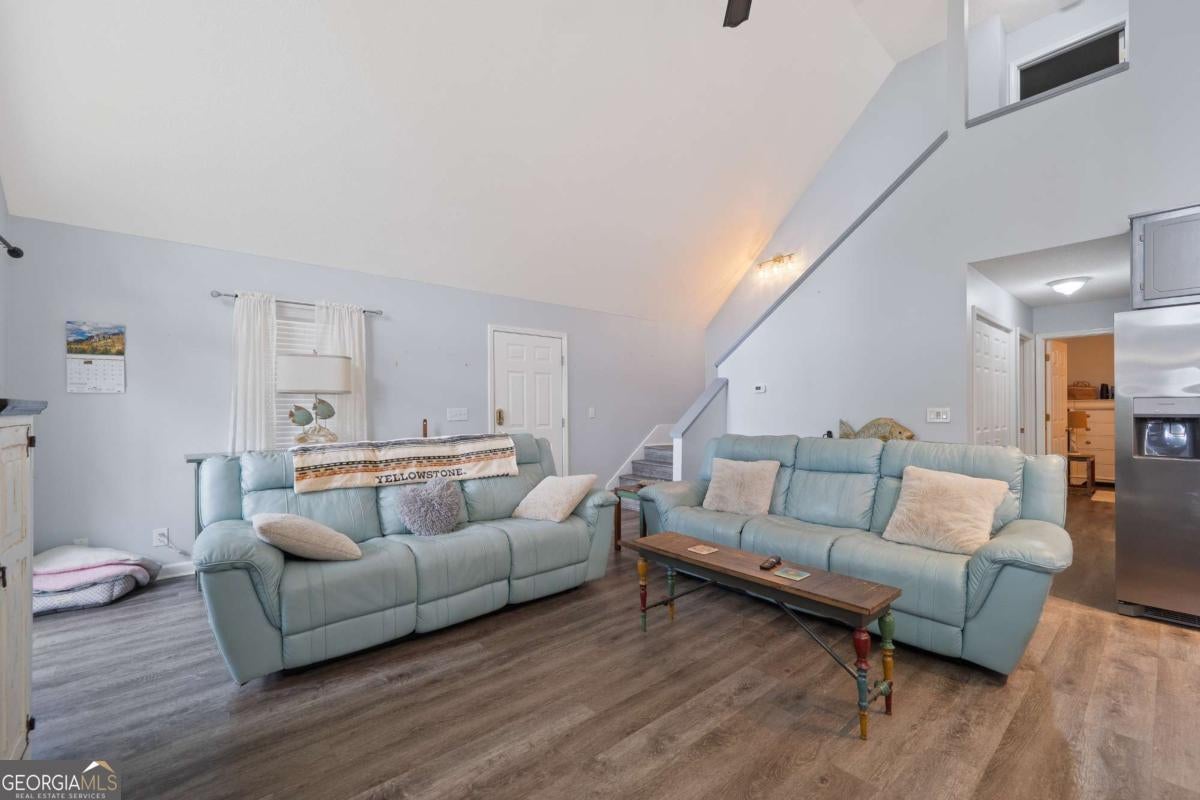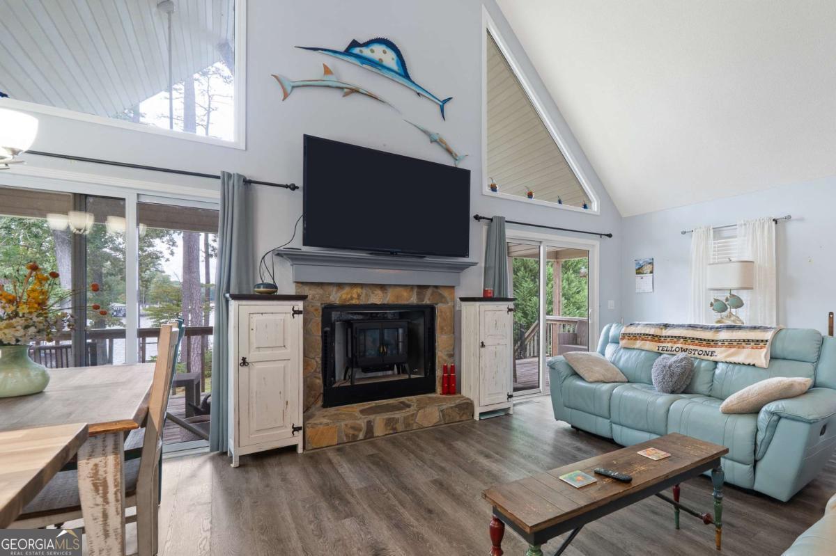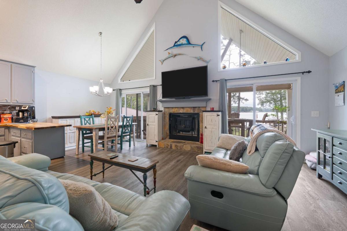 Welcome to 325A Shelton Drive - a stunning lakefront A-frame retreat located on beautiful Lake Sinclair in the desirable Little River Heights community. This 3-bedroom, 2-bath home offers 1,840 square feet of light-filled living space, combining rustic charm with modern comfort. Enjoy breathtaking lake views from the open-concept living and dining areas, complete with vaulted ceilings, expansive windows, and a cozy fireplace. The kitchen features modern appliances, ample cabinetry, and a breakfast bar perfect for casual dining. The main level includes two guest bedrooms and a full bath, while the upper level boasts a private primary suite with a loft area - ideal for an office or additional living space. Step outside to a spacious lakeside deck and private dock, perfect for entertaining, relaxing, or launching your boat. Additional features include a detached garage with an upstairs loft that could easily be converted to additional living space and a level lot with mature landscaping. This move-in ready lake home is ideal as a primary residence, weekend getaway, or vacation rental investment. Don't miss your opportunity to call this one home!