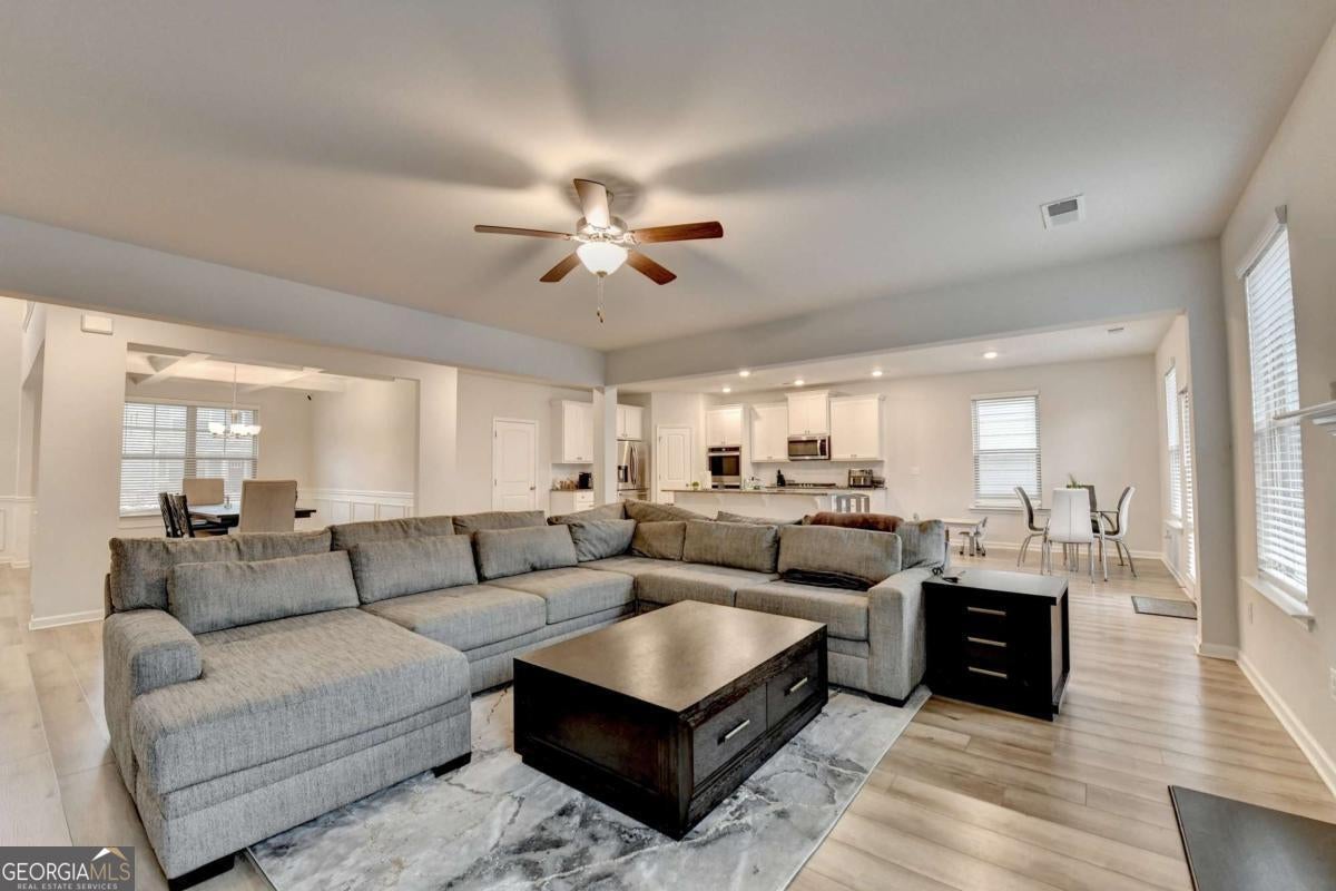 Beautiful Craftsman-style home for lease in Loganville featuring 5 bedrooms and 4 full bathrooms in the highly sought-after Grayson Cluster School District. This spacious home offers an open-concept main level with 9-ft ceilings, a formal dining room with coffered ceilings, and a great room with gas fireplace and ceiling fan. The kitchen is designed for entertaining with quartz and granite countertops, tiled backsplash, oversized island, stainless steel appliances, and a walk-in pantry. A full bedroom and full bath are conveniently located on the main floor, along with access to the 2-car garage. Upstairs you'll find an oversized owner's suite with double granite vanity sinks, linen closet, and a large walk-in closet. Three additional spacious bedrooms, three full bathrooms, laundry room, and a versatile loft complete the second level. Enjoy outdoor living in the large, fully fenced backyard, perfect for relaxing or entertaining. Conveniently located near Grayson High School, Bay Creek Park, The Shoppes at Webb Gin, and just minutes from Snellville and Lawrenceville for shopping, dining, and entertainment. This well-maintained home offers space, comfort, and a prime location. Schedule your tour today!