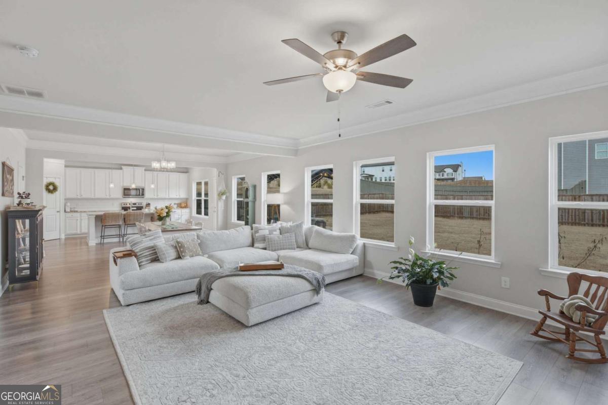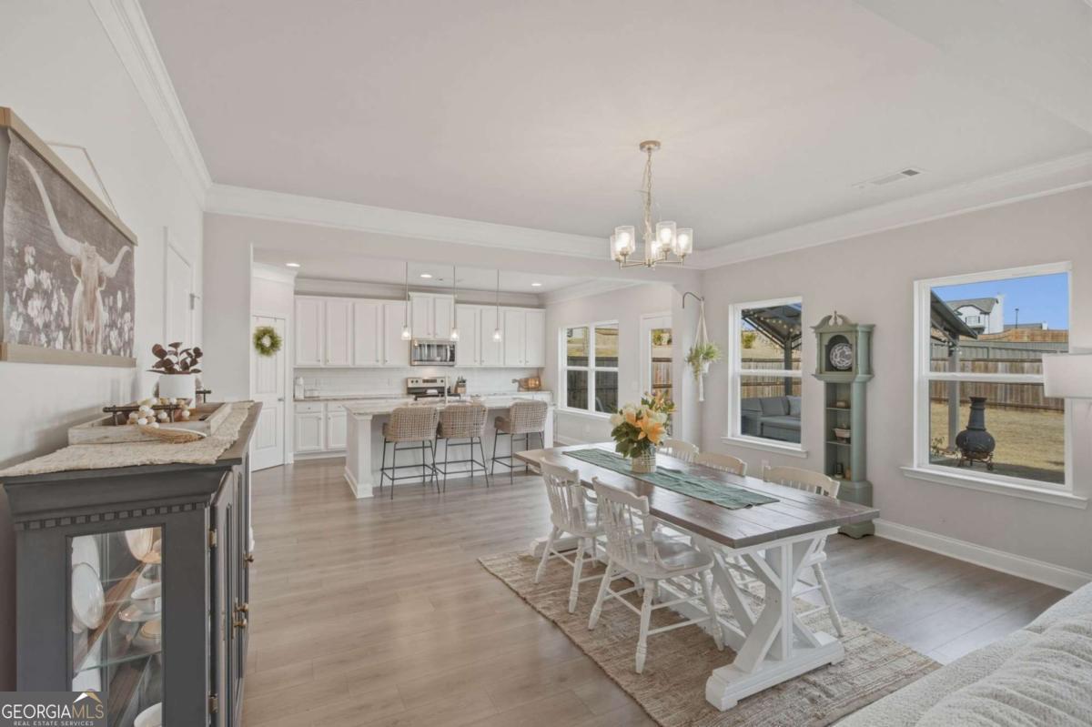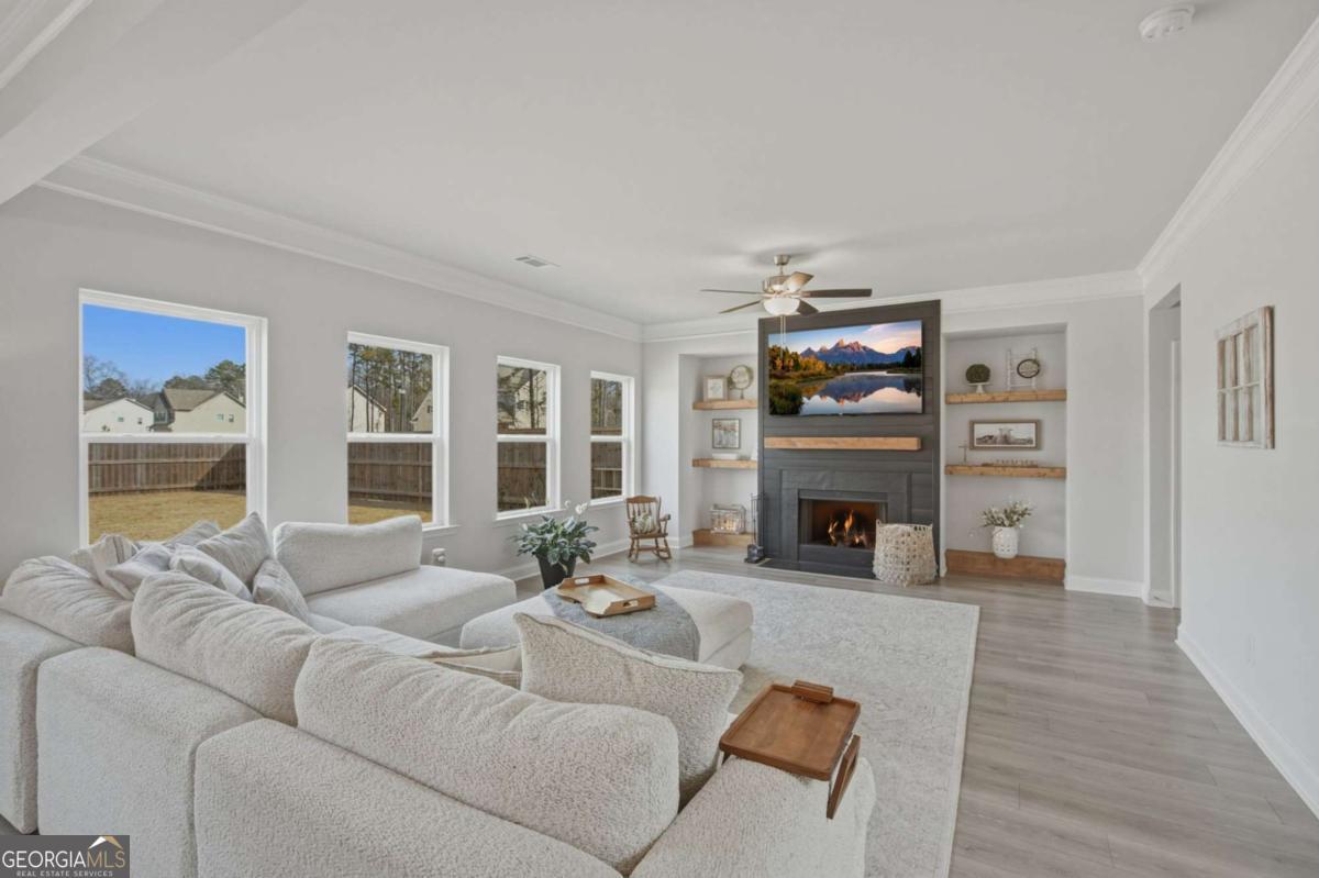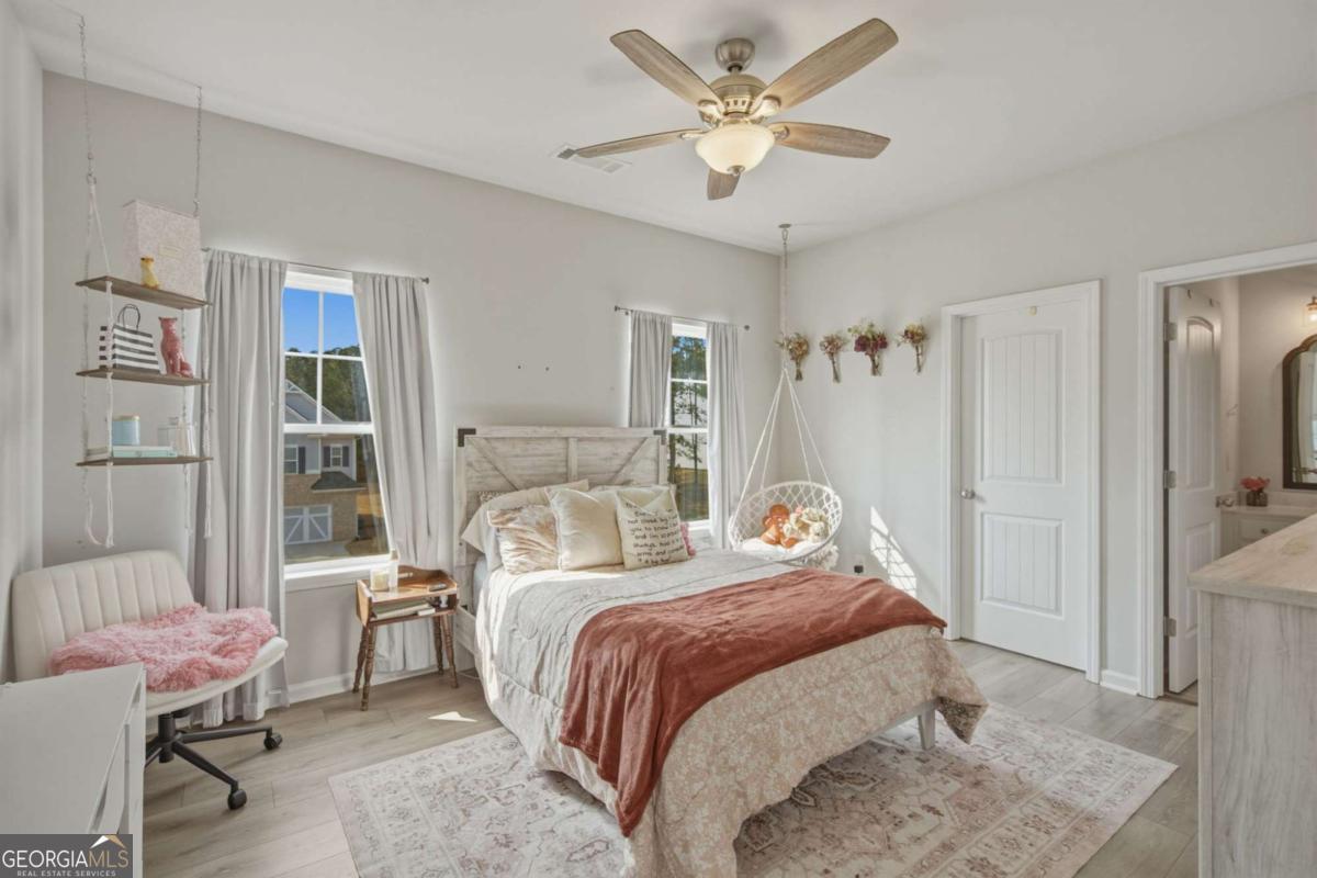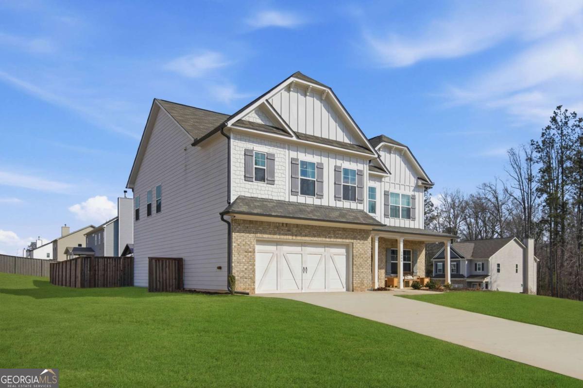 Welcome to this almost new, beautifully appointed home perfectly situated on a sprawling 1/2 acre lot in one of Jackson County's most desirable neighborhoods, just minutes from top rated Jackson County Schools. From the moment you step inside, you'll be captivated by the extremely bright, open floor plan filled with natural light. Expansive windows line the back of the home and continue throughout, creating a warm and airy atmosphere in every room. The main living area is a showstopper, featuring a beautifully designed fireplace with custom wood shelving and elegant shiplap detail, the perfect focal point for cozy evenings or stylish entertaining. Throughout the entire home, including all bedrooms and upstairs living spaces, you'll find luxury vinyl plank flooring, offering durability and modern appeal. The chef's kitchen is thoughtfully designed for gathering and entertaining, complete with a huge center island, upgraded granite countertops, abundant cabinetry, and an open flow into the living and dining areas. Convenience meets flexibility with a guest bedroom and full bath on the main level, ideal for visitors or muli-generational living. Upstairs, the spacious primary suite provides a private retreat with a sitting area or home office space, a large spa like bathroom, and an oversized walk in closet. Two additional secondary bedrooms share a well designed Jack and Jill bath with separate vanities offering both privacy and function. A generous loft/media room completes the upper level, perfect for movie nights, a play space, or an additional living area. Step outside to your large, flat, fully fenced in backyard making an incredible space for entertaining, pets, play or even adding a future pool!