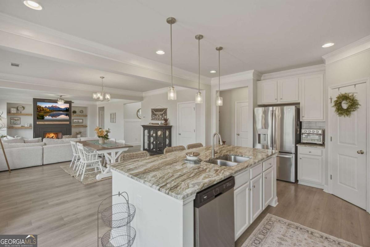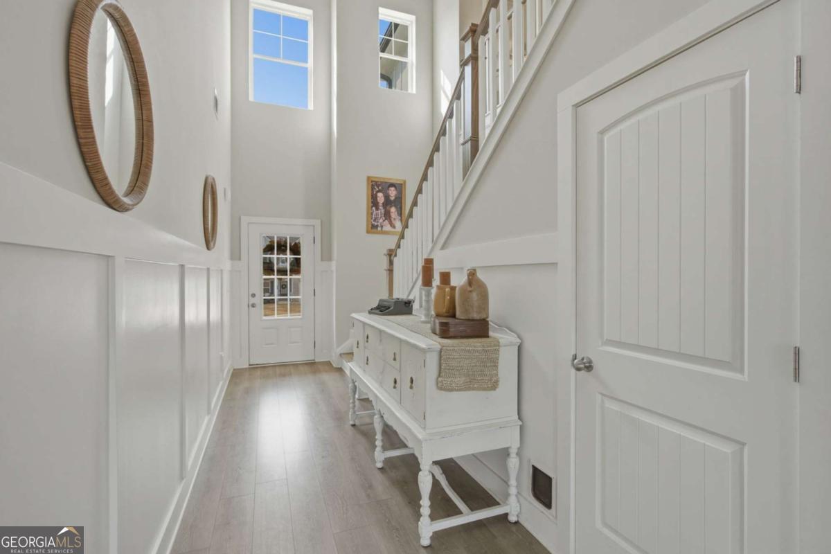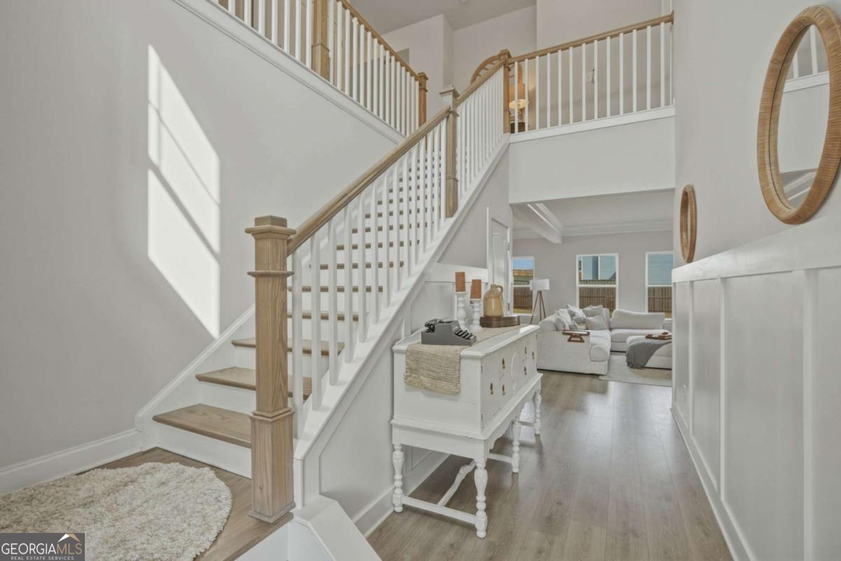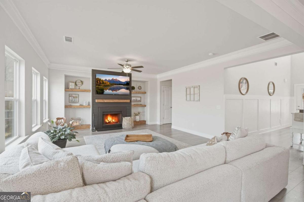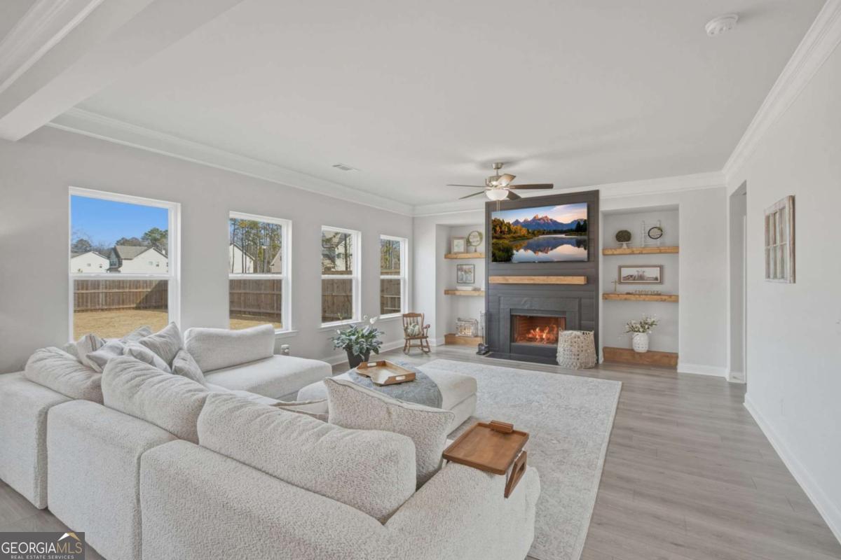 Welcome to this almost new, beautifully appointed home perfectly situated on a sprawling 1/2 acre lot in one of Jackson County's most desirable neighborhoods, just minutes from top rated Jackson County Schools. From the moment you step inside, you'll be captivated by the extremely bright, open floor plan filled with natural light. Expansive windows line the back of the home and continue throughout, creating a warm and airy atmosphere in every room. The main living area is a showstopper, featuring a beautifully designed fireplace with custom wood shelving and elegant shiplap detail, the perfect focal point for cozy evenings or stylish entertaining. Throughout the entire home, including all bedrooms and upstairs living spaces, you'll find luxury vinyl plank flooring, offering durability and modern appeal. The chef's kitchen is thoughtfully designed for gathering and entertaining, complete with a huge center island, upgraded granite countertops, abundant cabinetry, and an open flow into the living and dining areas. Convenience meets flexibility with a guest bedroom and full bath on the main level, ideal for visitors or muli-generational living. Upstairs, the spacious primary suite provides a private retreat with a sitting area or home office space, a large spa like bathroom, and an oversized walk in closet. Two additional secondary bedrooms share a well designed Jack and Jill bath with separate vanities offering both privacy and function. A generous loft/media room completes the upper level, perfect for movie nights, a play space, or an additional living area. Step outside to your large, flat, fully fenced in backyard making an incredible space for entertaining, pets, play or even adding a future pool!