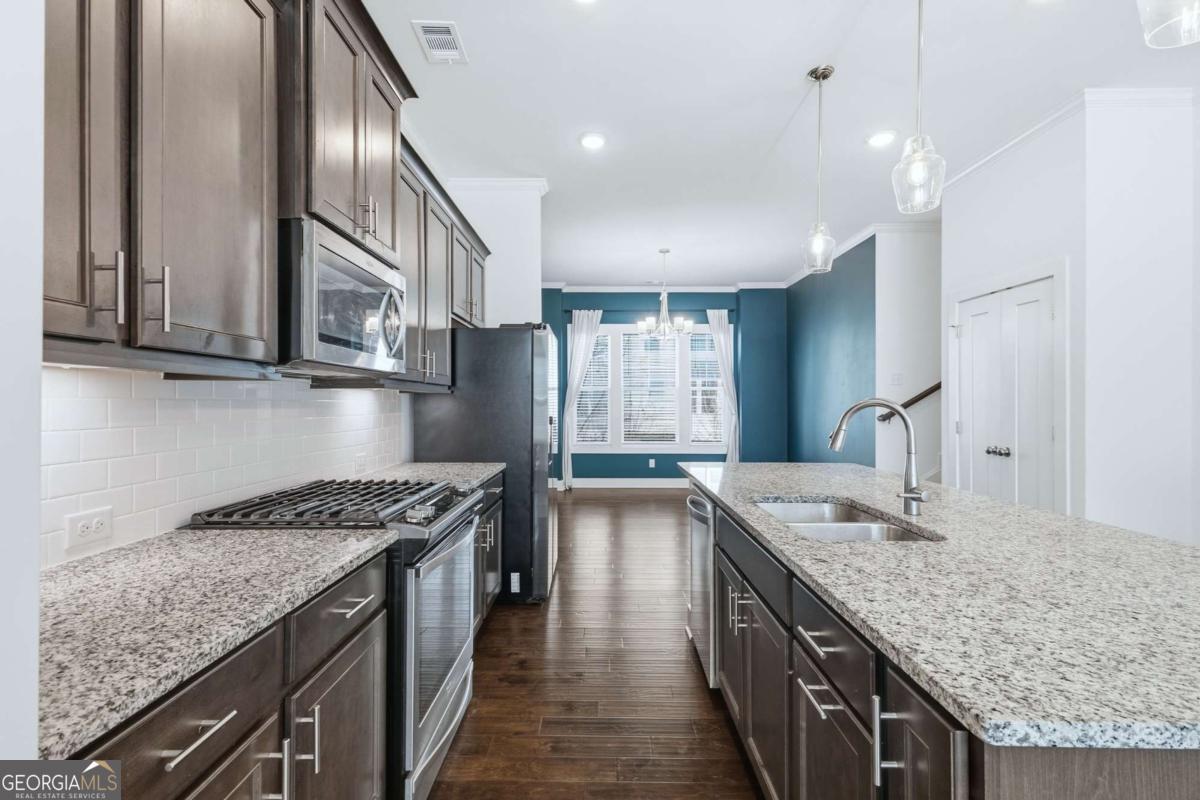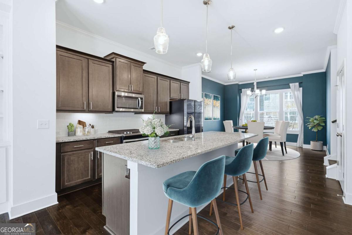 Enjoy modern luxury living in Atlanta's vibrant Upper Westside within the highly sought-after community of The Park at Vinings on the Chattahoochee. This exquisite 3-bedroom 3.5 bath townhome has been thoughtfully designed to deliver the perfect blend of comfort, style, and convenience. As you enter, soaring 10-foot ceilings and rich hardwood floors throughout the lower and main levels create an immediate sense of spaciousness and sophistication. Natural light fills the open-concept living spaces. The gourmet kitchen features stainless steel appliances, granite countertops, and an expansive island ideal for meal preparation, entertaining, and casual dining. The kitchen flows seamlessly into the inviting living area, where a cozy fireplace provides the perfect backdrop for relaxing evenings at home. Built in cabinets flank the fireplace and the dining area is open to the kitchen making the main level perfect for entertaining. Each of the three generously sized bedrooms is designed with privacy in mind. The lower-level ensuite bedroom is ideal for guests or a home office. Upstairs, the secondary bedroom features its own private bath for added comfort and convenience. The spacious primary suite serves as a luxurious retreat with a large walk in closet. Additional features that make this townhome special include painted accent walls and overhead storage in the garage. All appliances including washer and dryer will convey with the property. The amenities, including a pool, tennis courts, a playground, and a dog park, make this a desirable community. The community is in close proximity to walking trails along the Chattahoochee River, picturesque Whittier Mill Park , Westside Park which will connect to the Atlanta Beltline's Westside Trail northern extension (completion is expected in 2027/2028) & walking distance to local, cute coffee shop Bellwood Coffee, a neighborhood hangout spot! Located conveniently near I-285/75 & minutes away from Westside Village, The Battery, Truist Park, Midtown, Buckhead, and Vinings. The location provides endless dining and shopping at your fingertips. Embracing the low maintenance living of this townhome community in a desirable location means fully enjoying a lifestyle of comfort, convenience, and endless exploration opportunities.