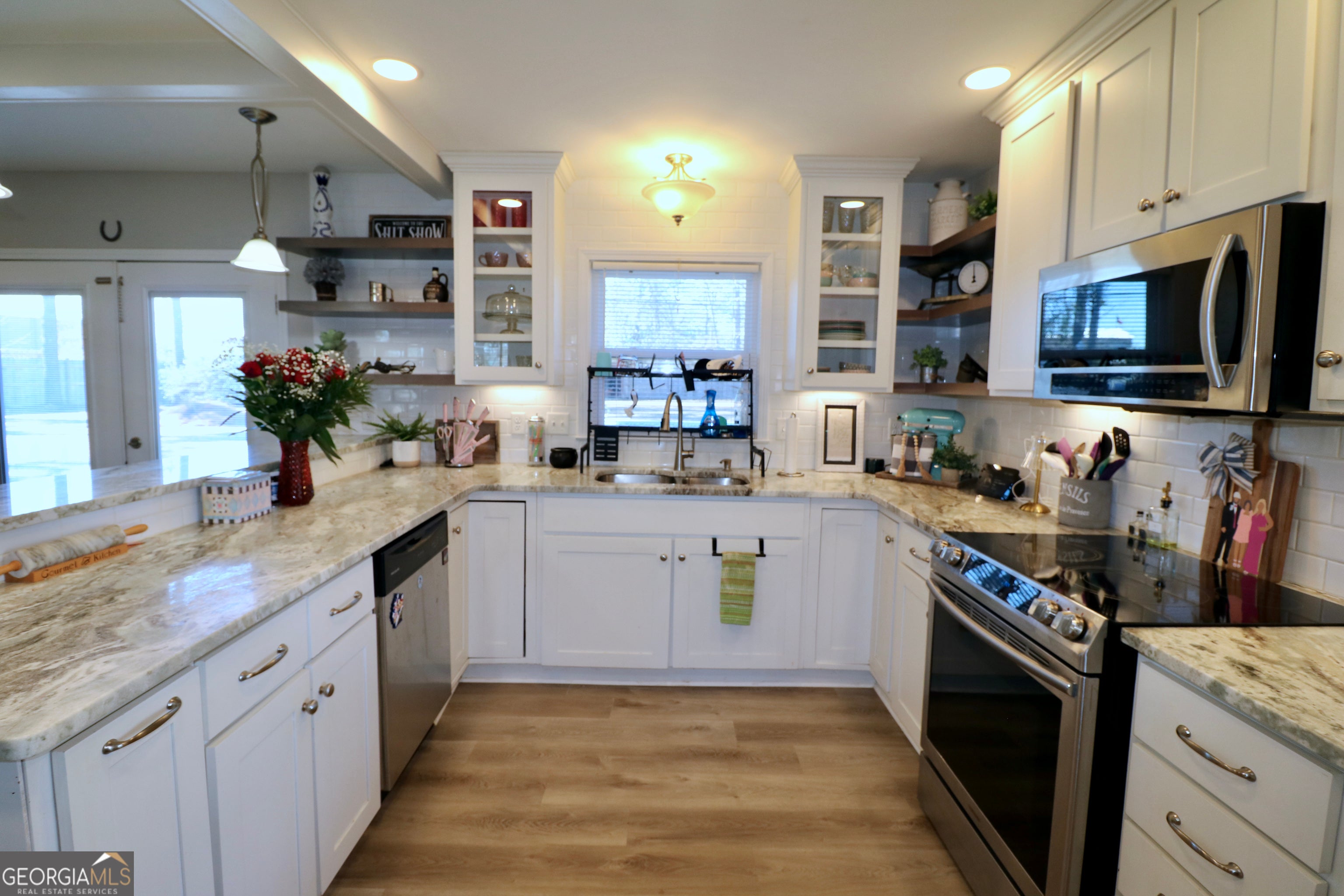 A rare opportunity awaits with this captivating 3-bedroom, 2-bath mid-century ranch, perfectly situated on an expansive double corner lot just shy of an acre. This one-of-a-kind residence masterfully blends timeless architectural charm with thoughtfully curated modern updates, creating a home that is both stylish and inviting. Step inside to a beautifully renovated interior where original character has been preserved while contemporary comforts have been seamlessly incorporated-including a Rinnai tankless water heater for on-demand efficiency. The reimagined cook's kitchen anchors the home, offering an open-concept layout that flows effortlessly into the living area, complete with a cozy fireplace and elegant coffered ceilings-ideal for both everyday living and entertaining. Granite countertops, stainless steel appliances, and a classic subway tile backsplash pair perfectly with luxury vinyl plank flooring, setting the tone for modern sophistication throughout. The primary suite is a true retreat, featuring an oversized walk-in Queen's closet and a spa-inspired en-suite bath with dual vanities and a large custom-tiled walk-in shower. Across the hall, a private guest suite with its own full bath-along with an additional bedroom-offers flexibility and privacy for guests or family members. Outdoors, your private oasis awaits. The expansive fenced backyard boasts a stunning in-ground pool, fire pit, and a spacious powered workshop-perfect for storage, hobbies, or projects. Whether you're relaxing after a long day or hosting unforgettable gatherings, this serene outdoor space delivers the ultimate backdrop for leisure and entertaining. Ideally located within walking distance to newly developed shops and restaurants, and just minutes from shopping, Georgia Southern University, Lowe's, The Blue Mile, and the S&S Greenway, this home offers unmatched convenience and lifestyle appeal. Homes like this don't come along often. Schedule your private showing today and experience the exceptional charm, comfort, and character of this remarkable property for yourself.