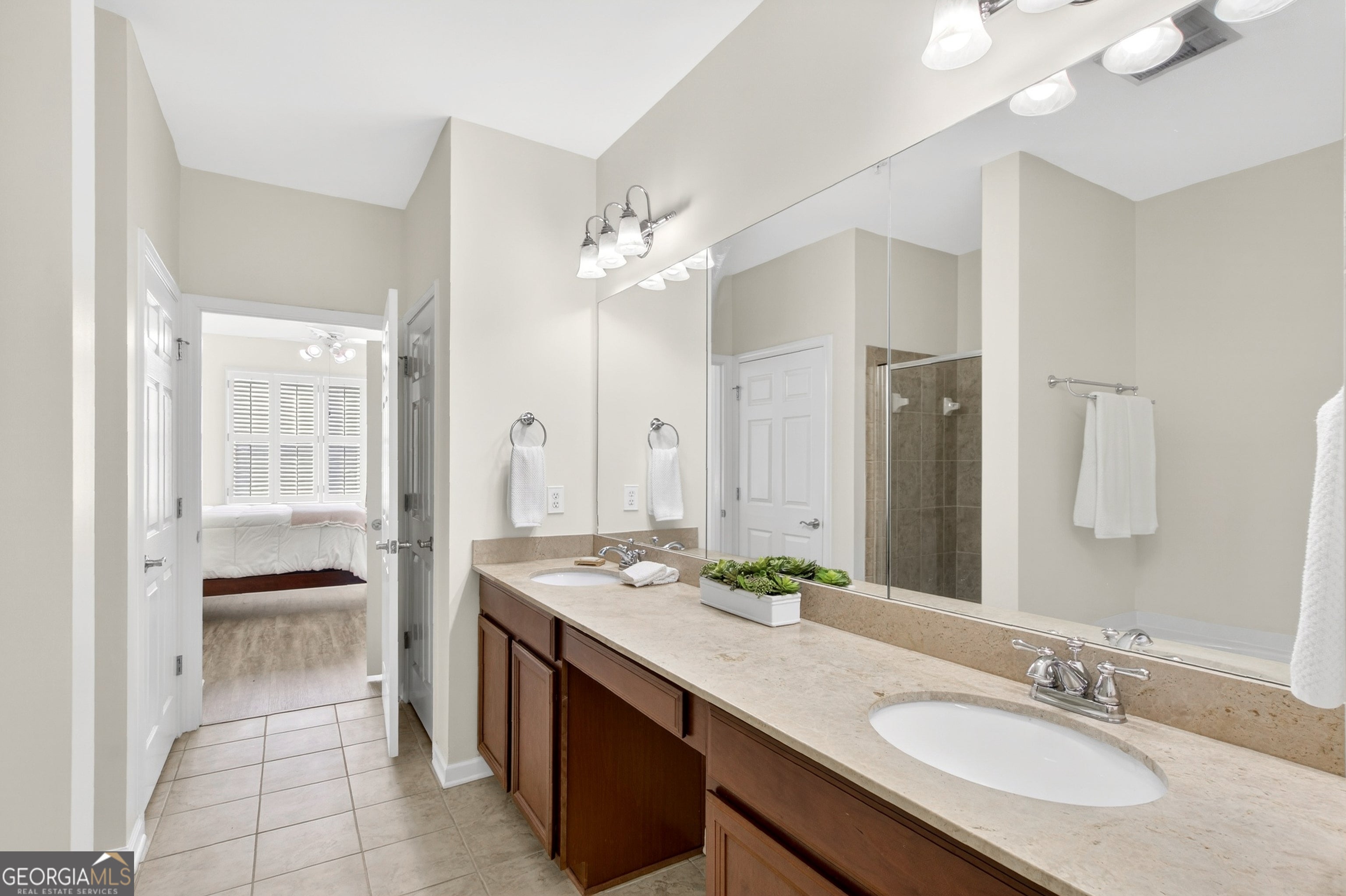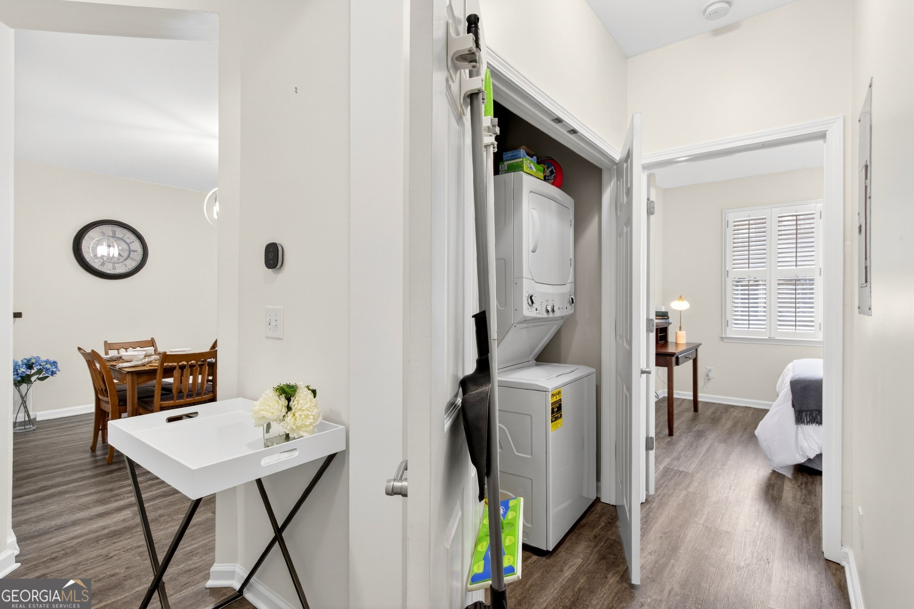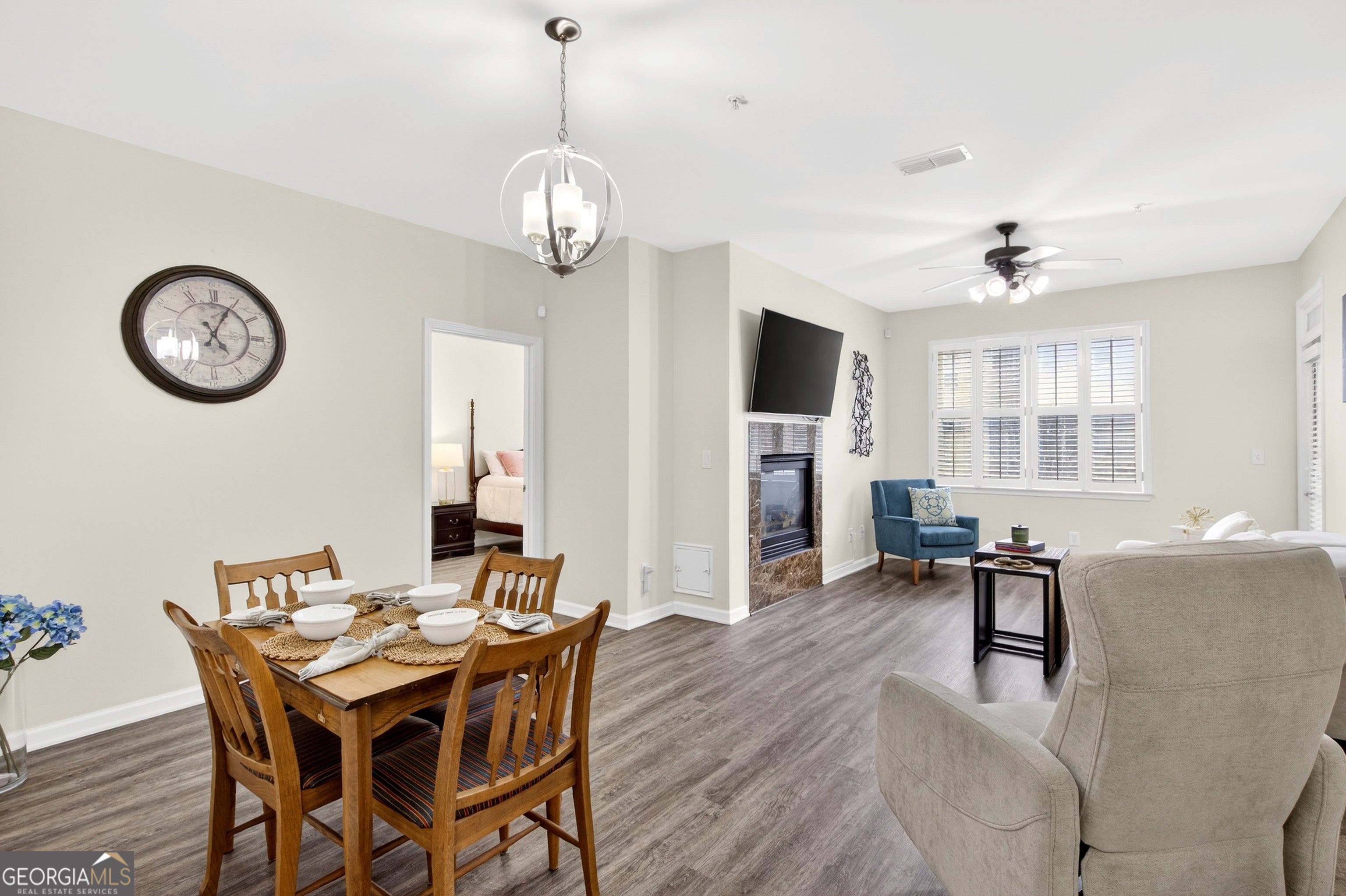 Pristine, move-in ready 2 bedroom, 2 bathroom condo in a highly convenient Smyrna location just minutes from Vinings. This beautifully maintained first-floor residence offers 1,175 square feet of low maintenance, lock-and-leave living within a secure building. Ideally positioned facing west and not impacted by I-285, the home combines comfort, privacy, and accessibility. FHA and VA eligible. Fresh, neutral paint and newer laminate flooring throughout create a modern, cohesive feel. The immaculate Kitchen features warm, stained cabinetry, abundant granite countertops, tile backsplash, stainless appliances, gas cooking, a walk-in pantry, an undermount double-basin sink, and a newer refrigerator. The kitchen opens seamlessly to the fireside living and dining areas filled with natural light and is enhanced by plantation shutters throughout the home. The spacious Primary suite offers an inviting retreat with a beautifully appointed en-suite bathroom featuring a separate tiled shower, soaking tub, extended double vanity, linen closet, private water closet, and generous walk-in closet. The split-bedroom layout places the secondary suite on the opposite side of the home, complete with a large bedroom, full bathroom, and oversized closet- ideal for guests, a home office, or roommate living. Lightly lived in and exceptionally maintained, the home was used occasionally during the week by the current owner. Additional features include hallway laundry and utility storage. One deeded and covered parking space underneath the building and Visitor parking (marked "V") in lot. Enjoy outstanding community amenities including a pool and fitness center, plus unbeatable proximity to the Silver Comet Trail, Truist Park (just 6 miles away), Vinings, Buckhead, Midtown, and major highways for easy access anywhere in metro Atlanta. Turn-key, casual elegance in a wonderfully managed community. Refrigerator, Washer and Dryer included in Sale. Security with ADT paid by Seller through November 2026. Best location in the community- furthest away from 285/road noise!