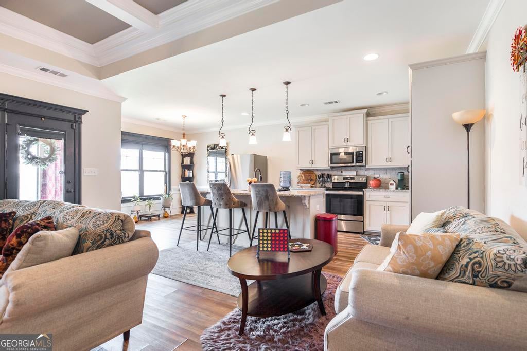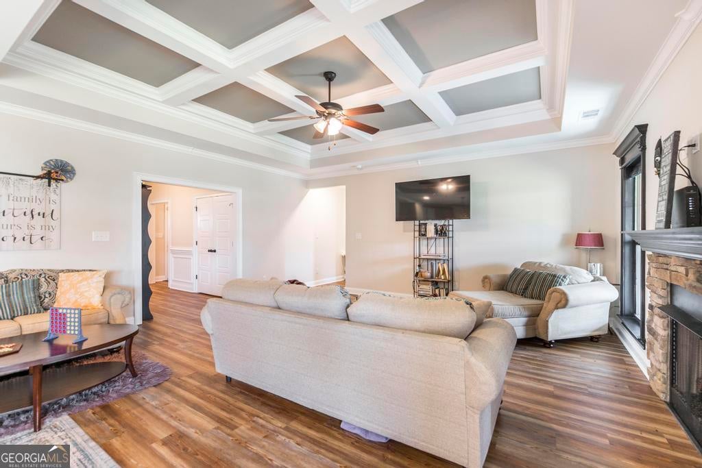Charming 3-bedroom, 2-bath Craftsman home situated on a desirable corner lot in The Cottages at Charlestown. A welcoming sidewalk leads to the covered front porch and into a spacious foyer that opens to the true showpiece of the home - the family room featuring a dramatic coffered ceiling and cozy stacked stone fireplace. The open-concept layout flows seamlessly into the gourmet kitchen complete with granite countertops, farmhouse sink, stainless steel appliances, and ample cabinetry - perfect for entertaining and everyday living. The primary suite offers a beautiful trey ceiling and private en-suite bath, creating a relaxing retreat. Step outside to enjoy the covered back patio along with a separate veranda area ideal for quiet mornings or evening relaxation.