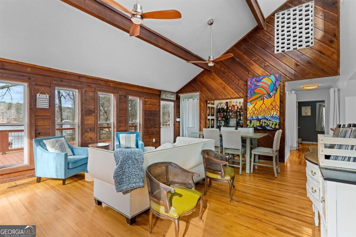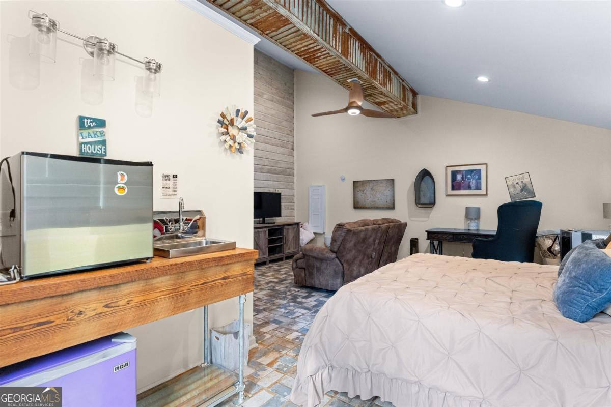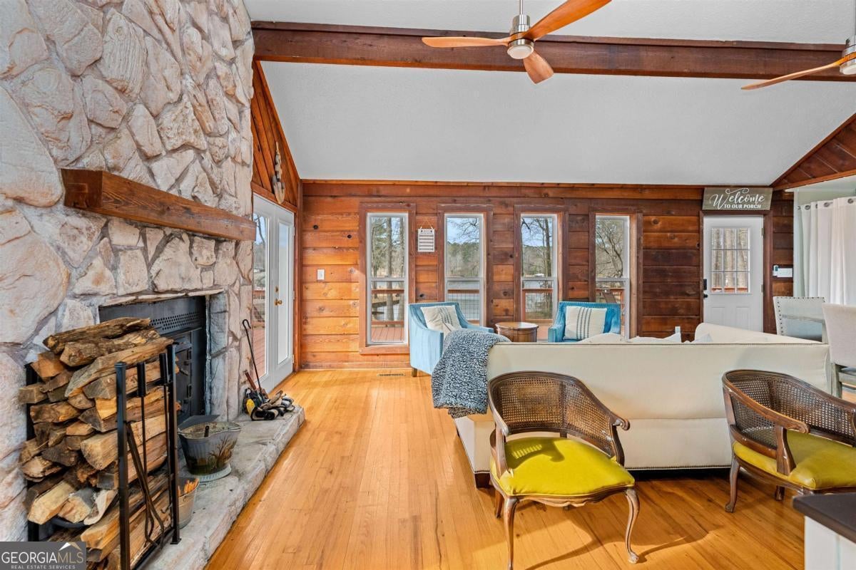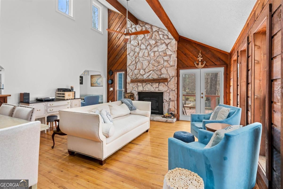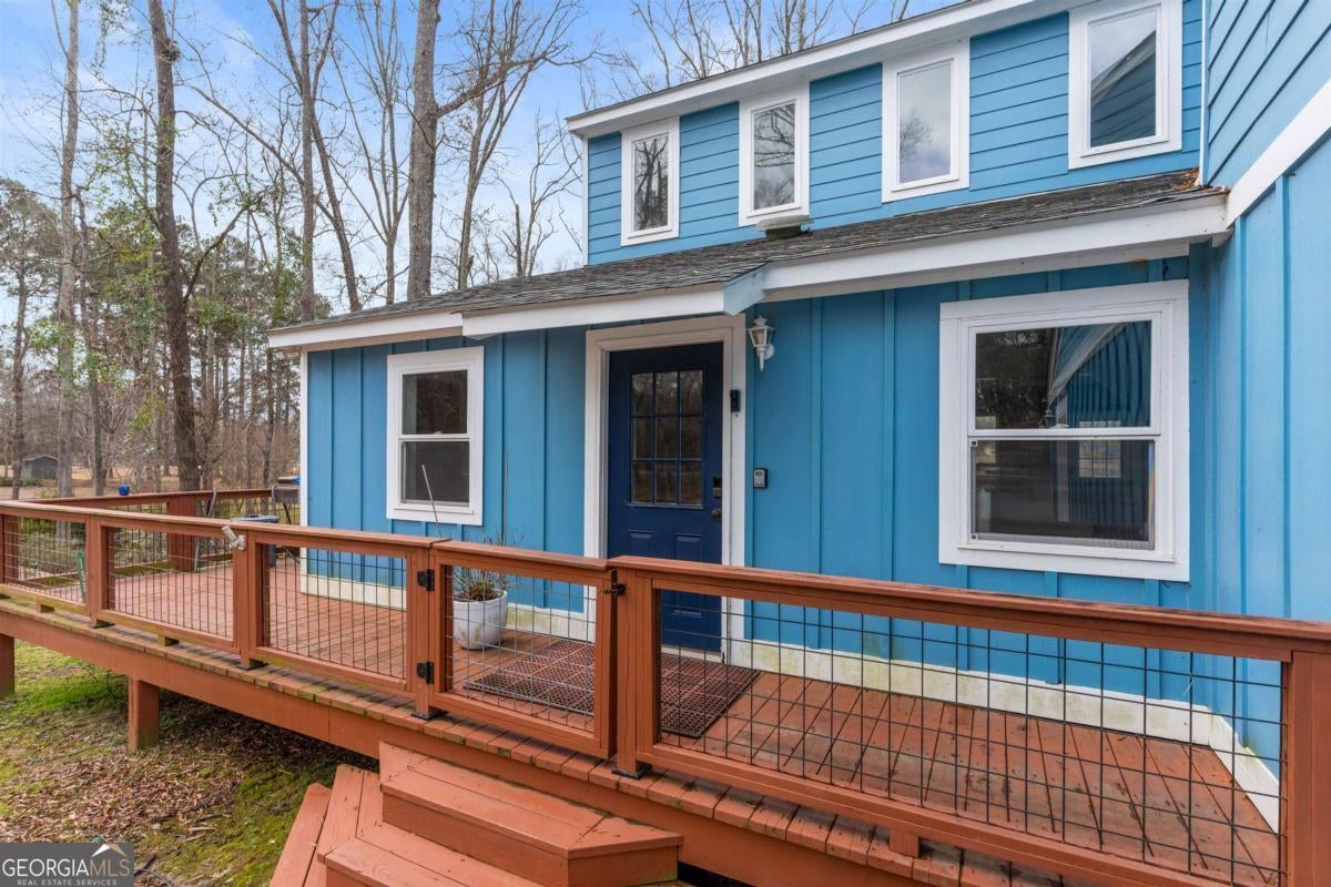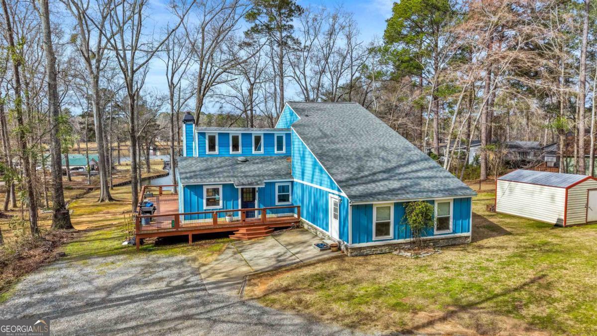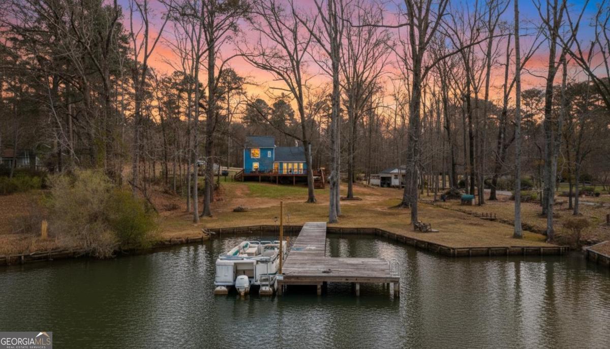 Welcome to carefree, lakefront living on beautiful Lake Sinclair. Perfectly positioned on a 1.6-acre fee simple lot in a highly desirable location, this 4-bedroom, 3-bath home offers the ideal blend of privacy, comfort, and convenience-just minutes from everything you need, yet peacefully tucked away on the water. Wake up to sparkling lake views and spend your days enjoying your private dock, with Georgia Power approval already in place for a single-stall boathouse. Whether it's boating, fishing, or sunset cruises, life here revolves around the water. Inside, the home was designed for relaxed gatherings and effortless entertaining. The vaulted great room features exposed beams, a stone fireplace, and walls of windows that bring the outdoors in. The inviting kitchen is a true heart-of-the-home space, complete with butcher block countertops and high-end stainless steel appliances-perfect for preparing meals after a long day on the lake. The oversized primary suite on the main level offers a comfortable retreat with its own mini kitchen and a spacious tiled bath. Two additional bedrooms on the main level share a bathroom. A private fourth bedroom and bath provides flexible space for guests, extended family, or weekend visitors. Step out onto the wraparound deck to enjoy morning coffee with a lake breeze, host summer cookouts, or unwind after a long day. There is also a fenced-in area off the deck, perfect for dogs, and a storage shed for all your lake toys. With an unbeatable location on Lake Sinclair, this property captures everything people love about lake life-laid-back, welcoming, and ready to enjoy.