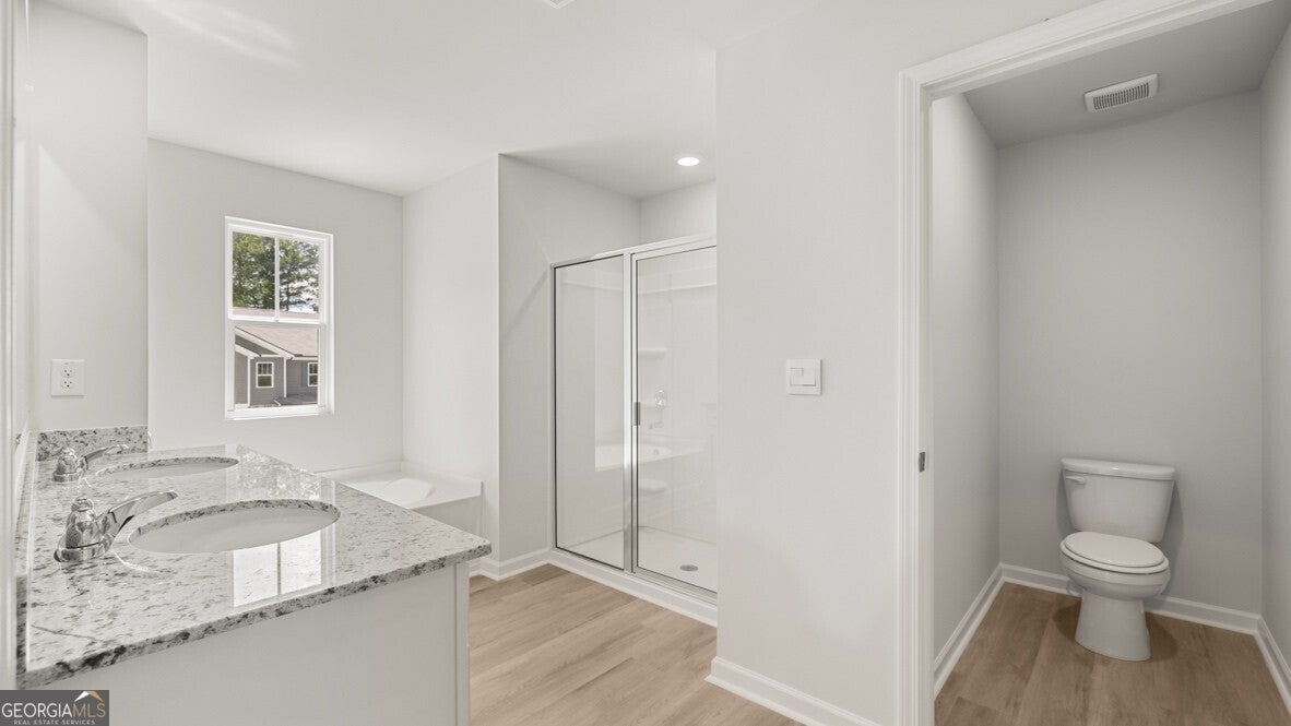 - Interior FeaturesDouble Vanity, High Ceilings, Separate Shower, Soaking Tub, Split Bedroom Plan, Walk-In Closet(s)
