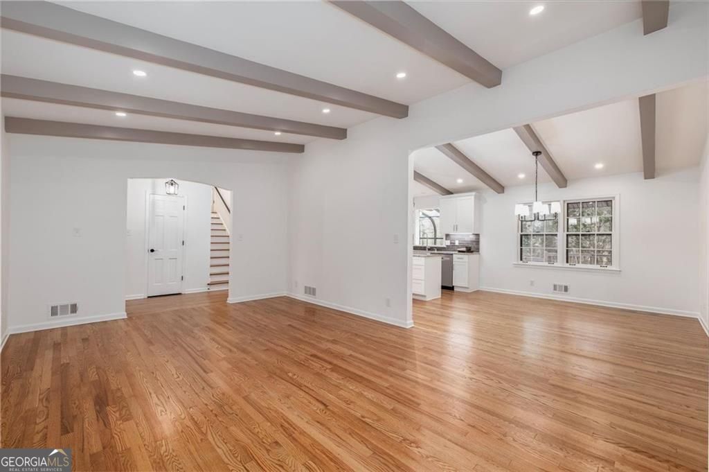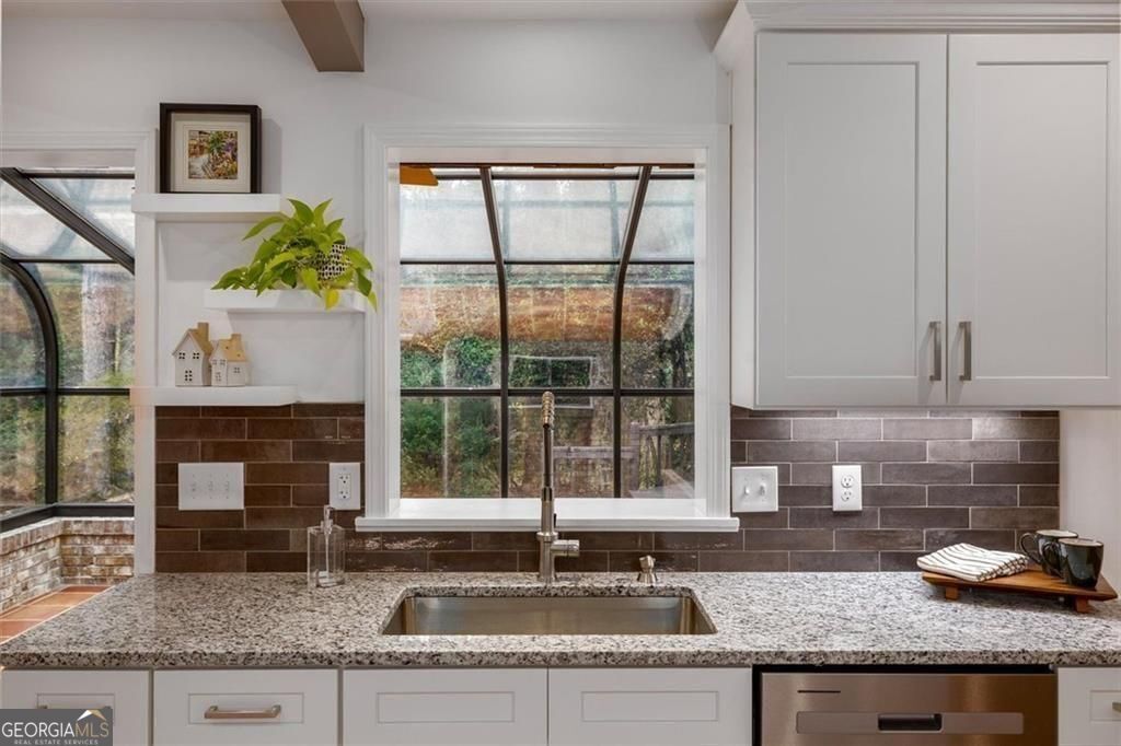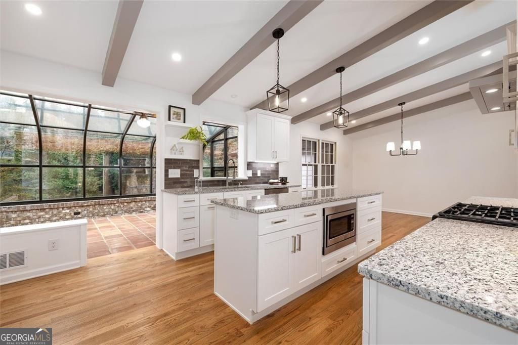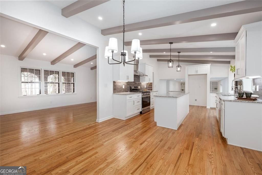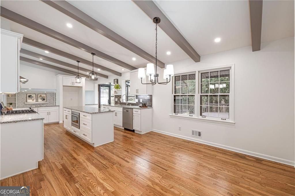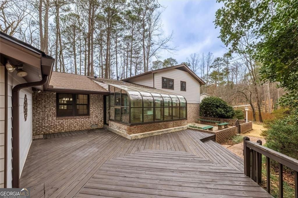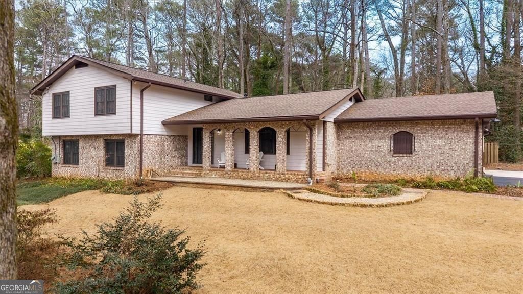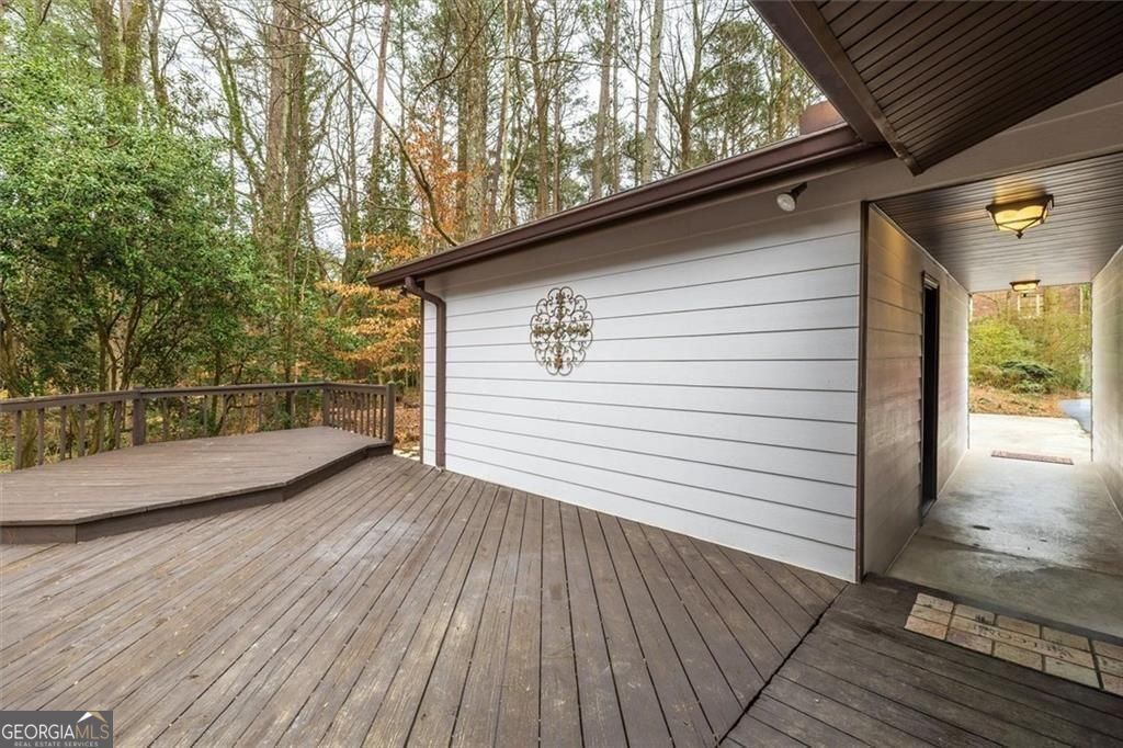 You will be so surprised when you enter this newly renovated Smoke Rise home. Front porch is great for afternoon conversations. Leaded glass front door with sidelights leads into foyer. Turn right into the first living area with a cathedral ceiling. Continue to the open dining room and the kitchen which is stunning. Huge center island, great workspaces and flow. Off the kitchen is a sun room. Go upstairs and there are three bedrooms and a hall bath. The primary suite has a huge closet, vanity with dressing area and new shower. At the front private to the primary is a room that you will certainly enjoy as a sitting room, office or whatever you choose. Go to the lower level and you will find a great room with a fireplace and bookshelves on one end and a patio that is off that room. In a hall way is a large closet that could be used for a pantry or game storage etc. There is a full bath and then continue down the hall and you will find a workshop of office and another bedroom. The laundry/mudroom also has a walk out to the side yard. The yard has a lot of plants that will bloom in spring, ample parking, a deck and more. There is a double garage and a single garage separated by a breezeway that leads back into the house. Easy access to shopping, highway, pools, parks and schools. Just a mile and a half from Stone Mountain Park (as the eagle flies). New Roof and New HVAC systems just installed.