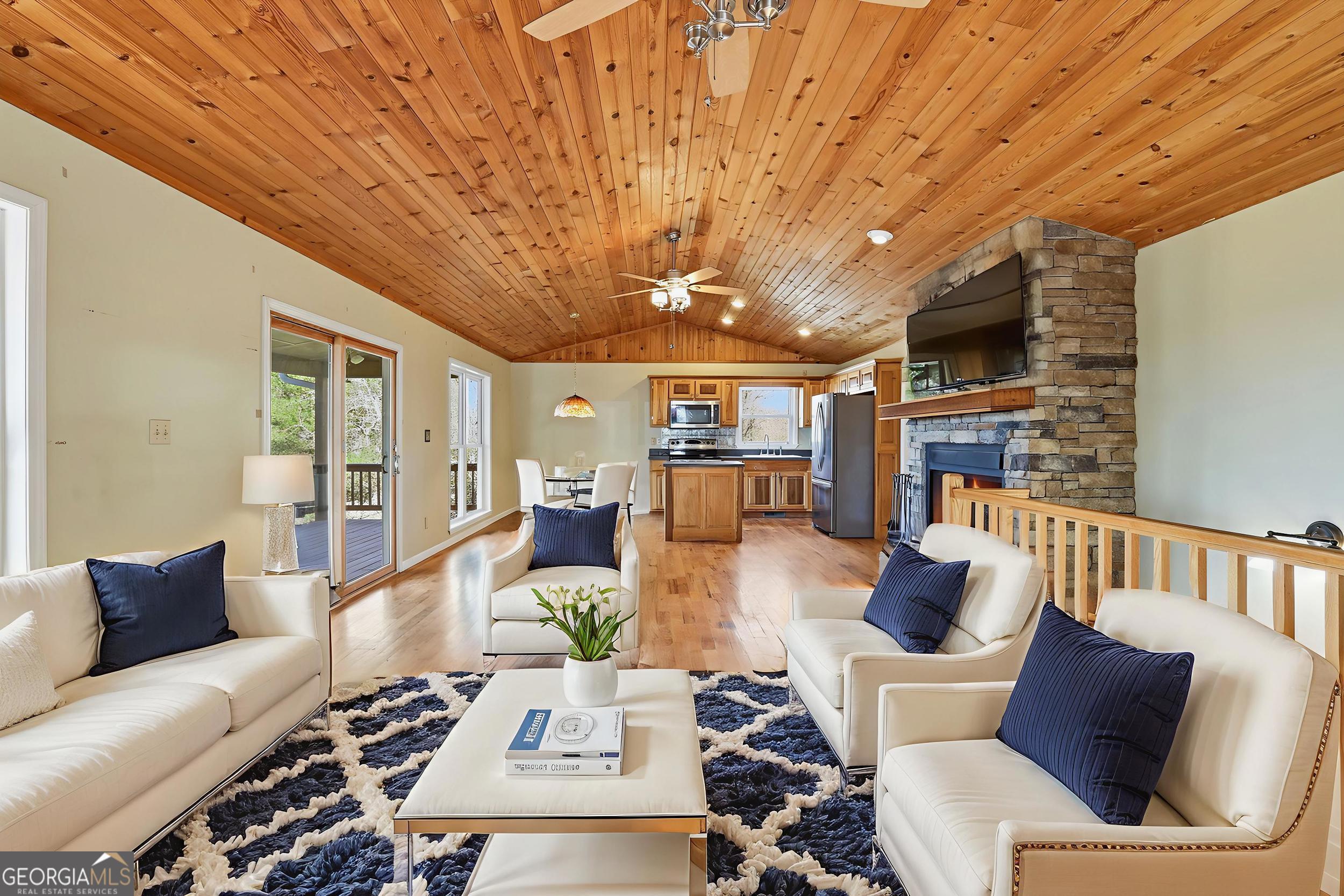 Well-maintained 3-bedroom, 2.5-bath home offering privacy, mountain views, and a convenient location just minutes from downtown Clayton. Situated in a quiet neighborhood, this home combines peaceful mountain living with easy access to shopping, dining, and local amenities. The main living area features a warm and inviting layout with a fireplace, while a second fireplace downstairs adds additional comfort and charm. Enjoy the mountain views from the spacious deck, perfect for outdoor dining or relaxing. The lower level opens to a patio area, providing additional outdoor living space and great potential for entertaining. With its private setting, multiple outdoor spaces, abundance of storage and close proximity to town, this home offers the ideal balance of tranquility and convenience. Note some of the photos have been virtually staged.
